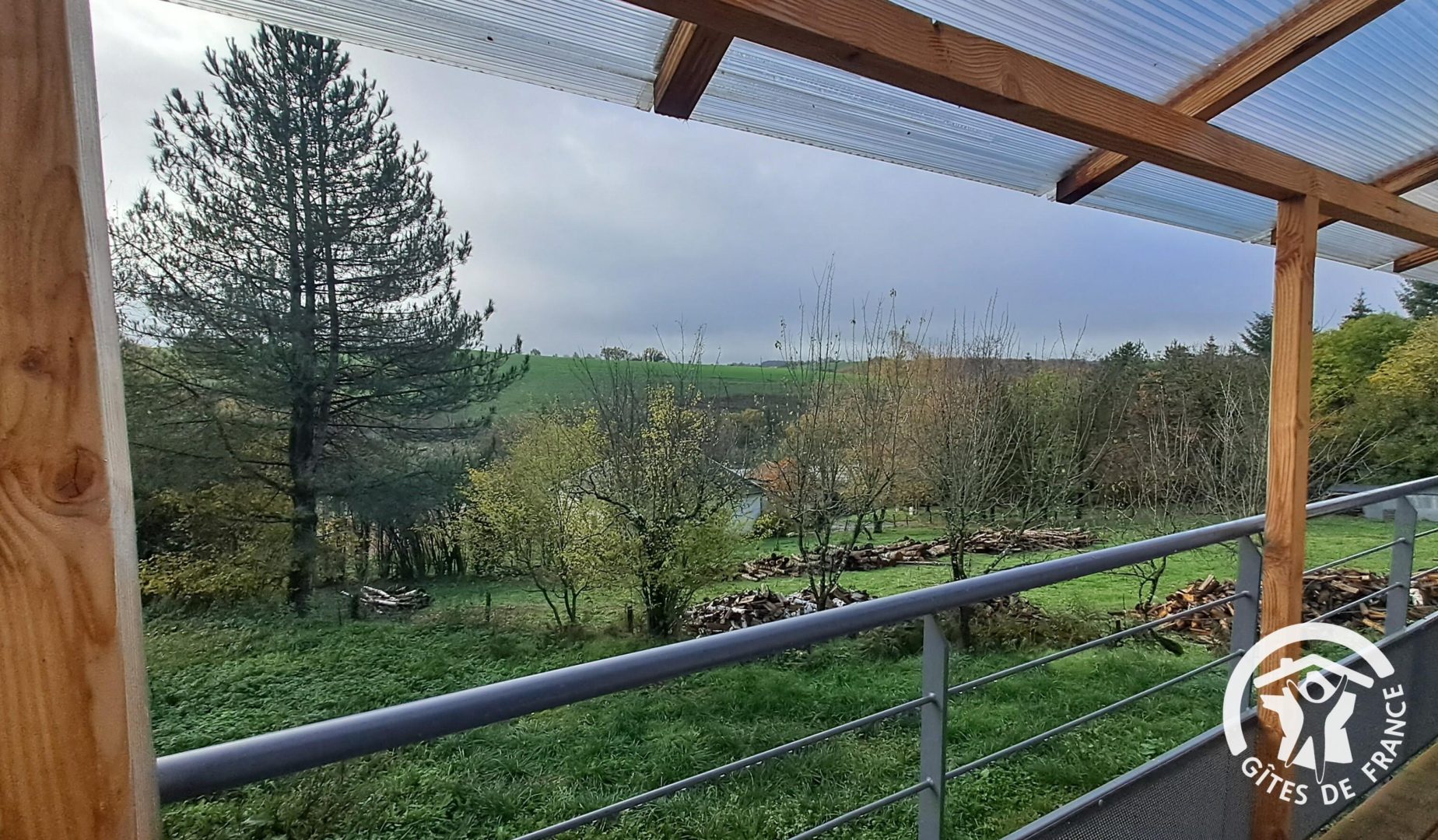 Gîte avec entrée indépendante donnant sur le séjour comprenant une cuisine simple (réfrigérateur top, four, lave-vaisselle, grille-pain, bouilloire et cafetière à piston) ouverte sur la table à manger et l’espace salon. Depuis la pièce de vie principale, vous accédez au balcon couvert avec vue dégagée sur la colline verdoyante pour pleinement profiter du cadre bucolique.