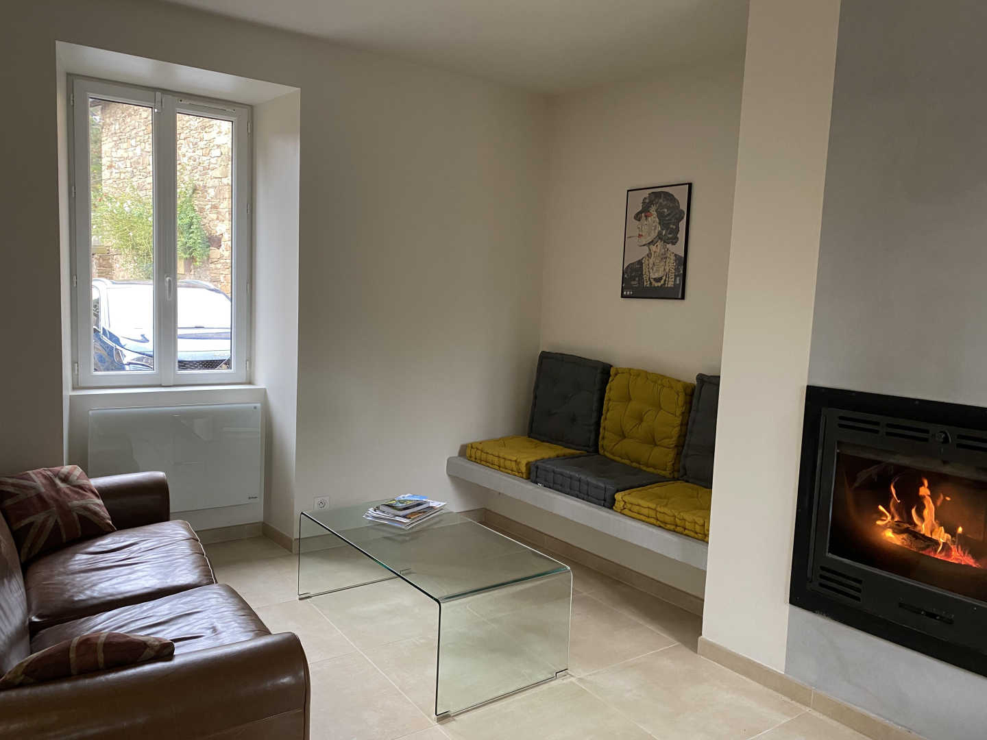 Living room: kitchen opening onto the dining table and a spare lounge facing the working fireplace. Fully equipped kitchen: food processor, Thermomix®, microwave, kettle, bean-to-cup coffee maker, toaster, oven, dishwasher, and more.