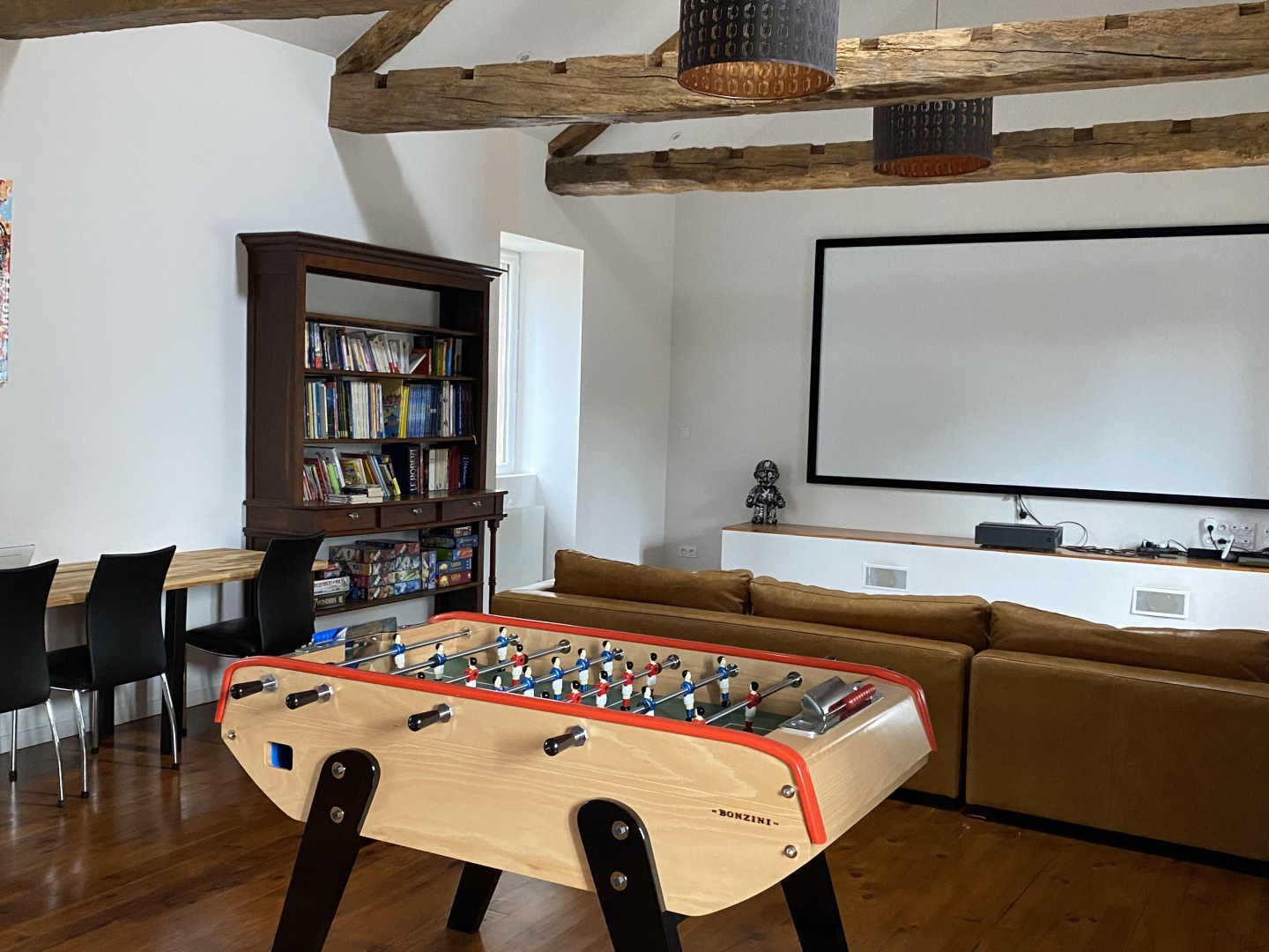 Upstairs, large living room with video projector for movie nights, foosball, books, darts, and board games.