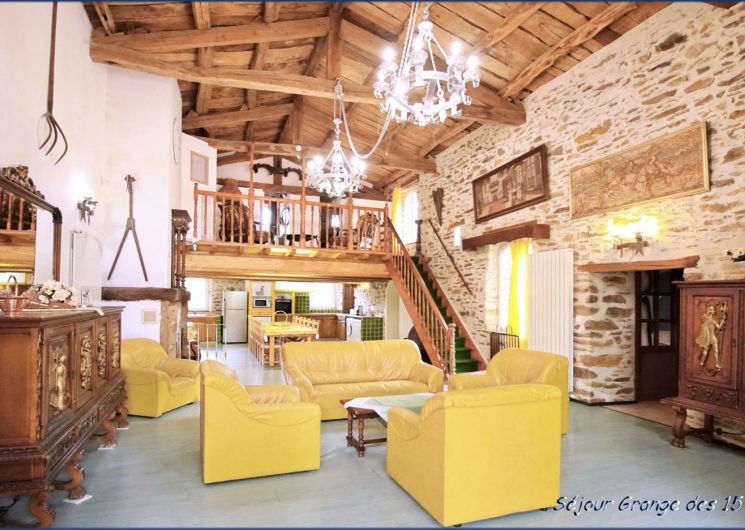 • Gîte des 15 Meuniers: a large living area with fully equipped open kitchen (oven, microwave, dishwasher, fridge-freezer, vitroceramic hob, filter coffee maker), dining area and lounge with fireplace and TV.