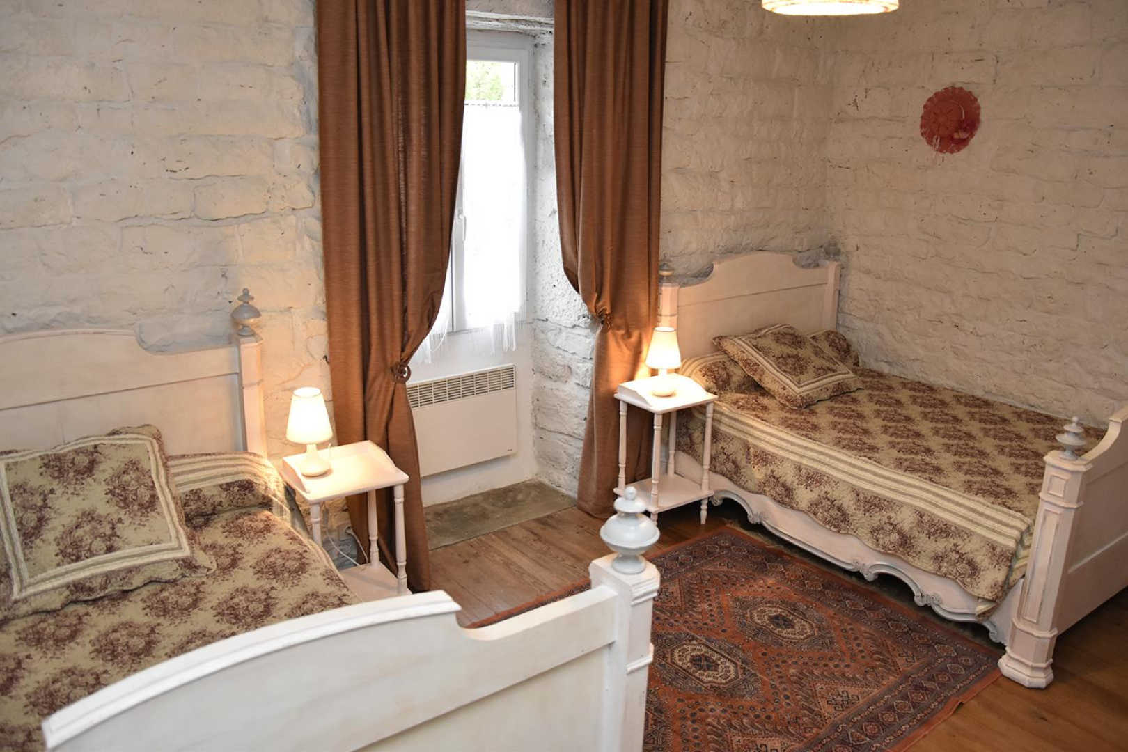 A l’étage : une chambre avec 1 lit en 140×190 et un lit 110×190 et 1 lit bébé, une chambre avec 1 lit en 120×190, et une chambre avec 2 lits en 120×190.