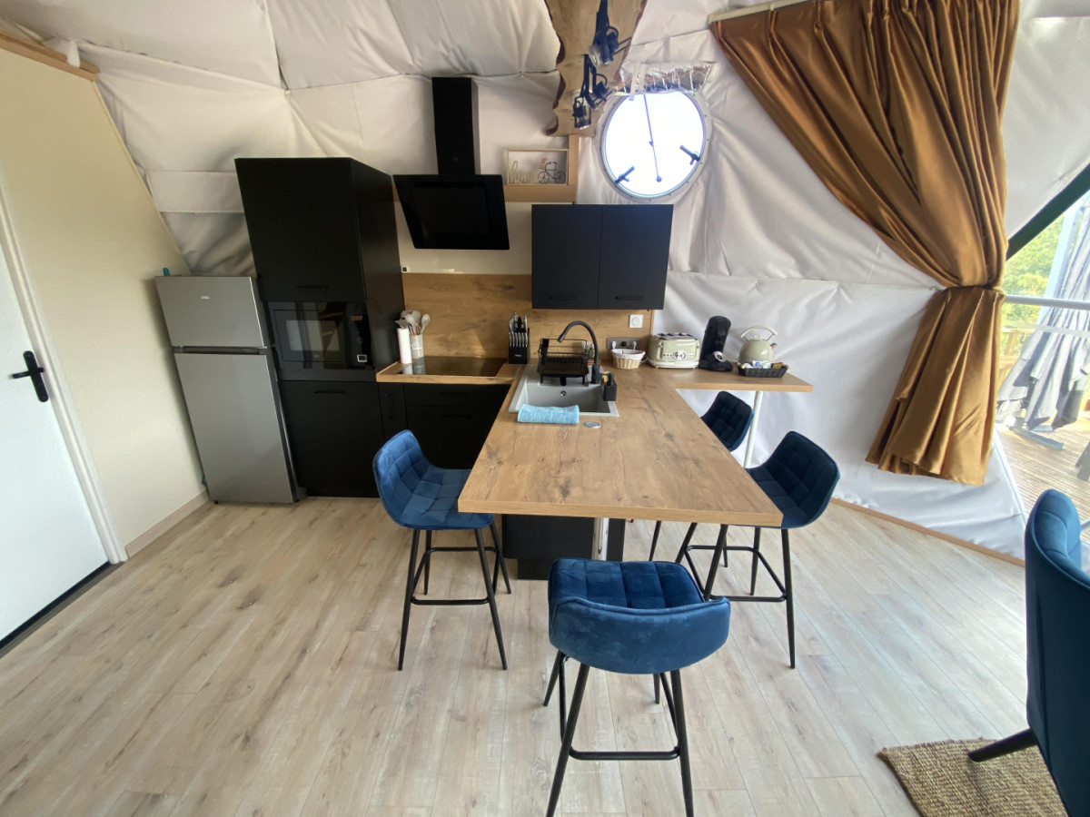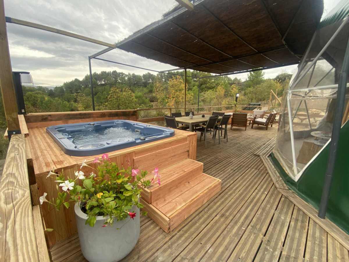 La nuit vous pourrez observer les étoiles depuis la terrasse privative tout en appréciant le bien-être grâce à son jacuzzi privé. Vous allez apprécier le jeu d’ambiance nocturne du lieu. Des moments uniques et inoubliables vous attendent pour une nuit ou plus dans une bulle de tranquillité et de totale déconnexion. C’est un lieu insolite qui bénéficie de tout le confort d’une maison de vacances: climatisation réversible, frigo-congélateur, micro-ondes combiné four, salle d’eau privative et attenante. La terrasse est équipée d’un mobilier de jardin avec hamac pour apprécier vos moments de convivialité en prenant le petit-déjeuner au lever du soleil ou votre repas le soir sous un beau coucher de soleil ou sous une nuit pleinement étoilée. Durban-Corbières est un village authentique de notre beau département, avec son château du XIème siècle qui surplombe le village et le massif des Corbières, c’est le point de départ de nombreux sentiers de randonnées à pieds comme à vélo. Sur place, vous trouverez une grande épicerie, restaurants, boulangerie, pizzéria. A proximité de nombreux lieux sont à visiter: les Châteaux Cathares, les belles plages de la Méditerranée, la réserve africaine de Sigean, le Parc Naturel Régional de la Narbonnaise, les paysages magnifiques des Corbières et son Parc Naturel Régional également, autant d’activités à faire en couple, en famille ou entre amis. Le Glamping Dôme s’ouvre sur un grand séjour lumineux et climatisé avec une belle vue sur l’extérieur, avec une cuisine équipée, une table pour manger, un coin salon avec fauteuils, l’espace nuit avec un lit queen size en 160 où vous avez toujours cette vue unique. Une salle d’eau privative et attenante composée d’une grande douche à l’italienne. Un WC indépendant. Tout inclus (peignoirs et produits d’accueil pour la salle d’eau, également). Petit-déjeuner en supplément de 10€/personne à régler auprès des propriétaires sur demande. Décoration romantique sur demande mais inclus au prix.