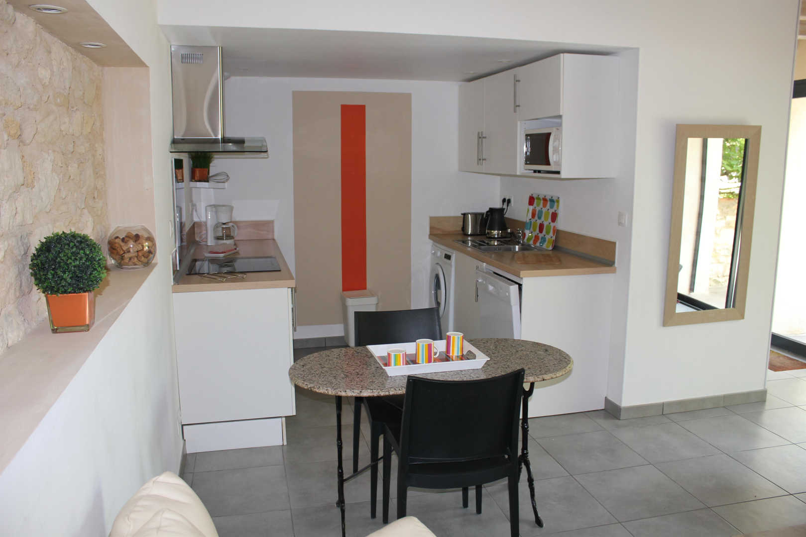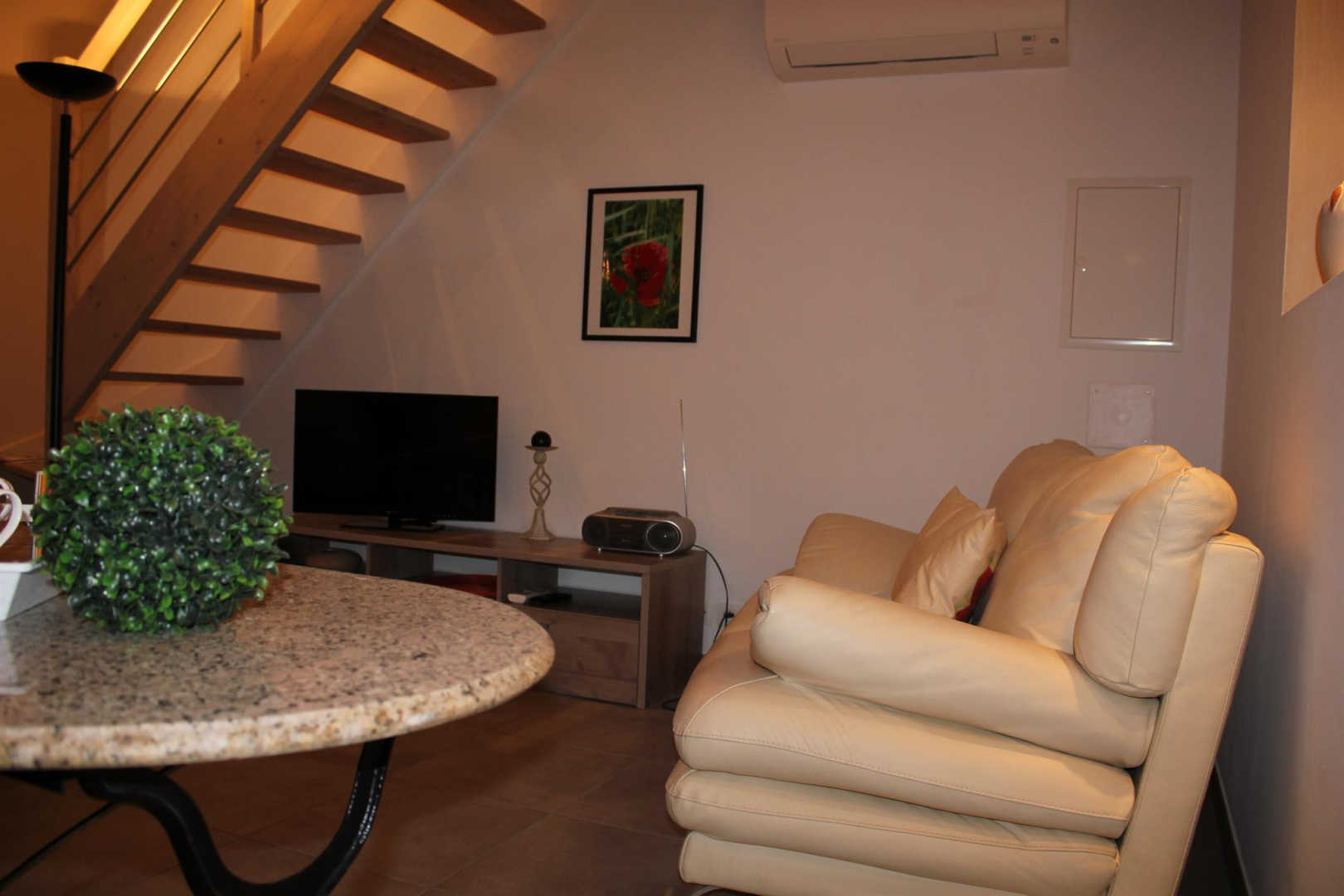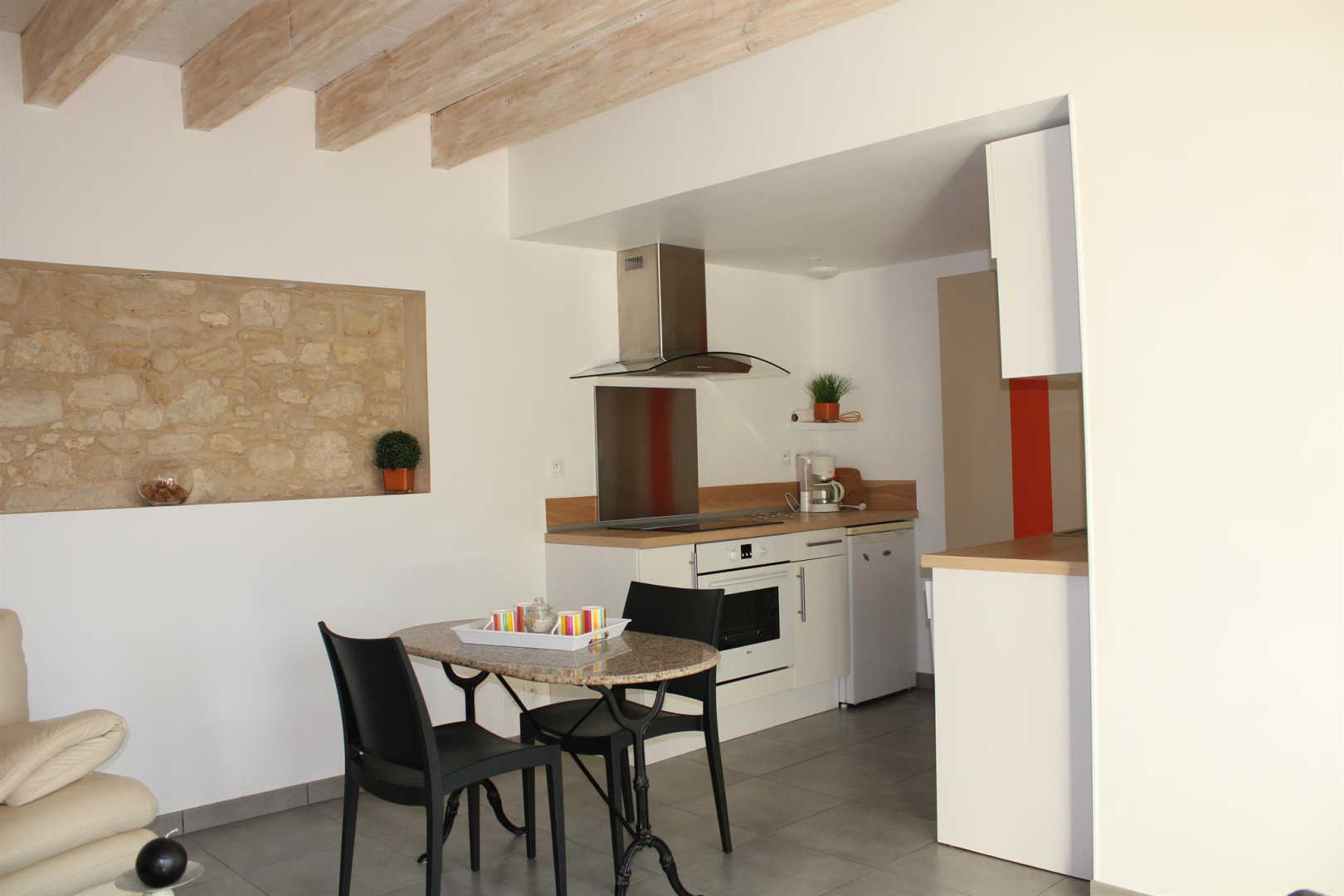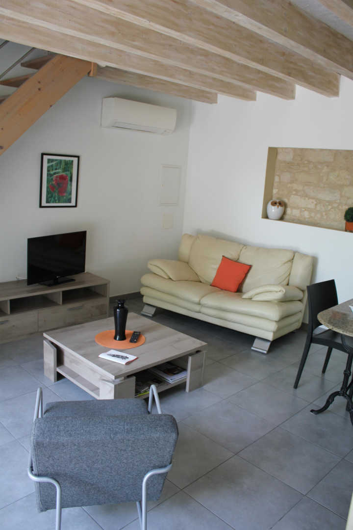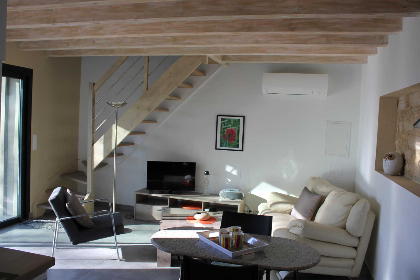Salon et coin-cuisine toute équipée, wc au rez-de-chaussée, grande chambre à l’étage (lit 160×200), salle d’eau.