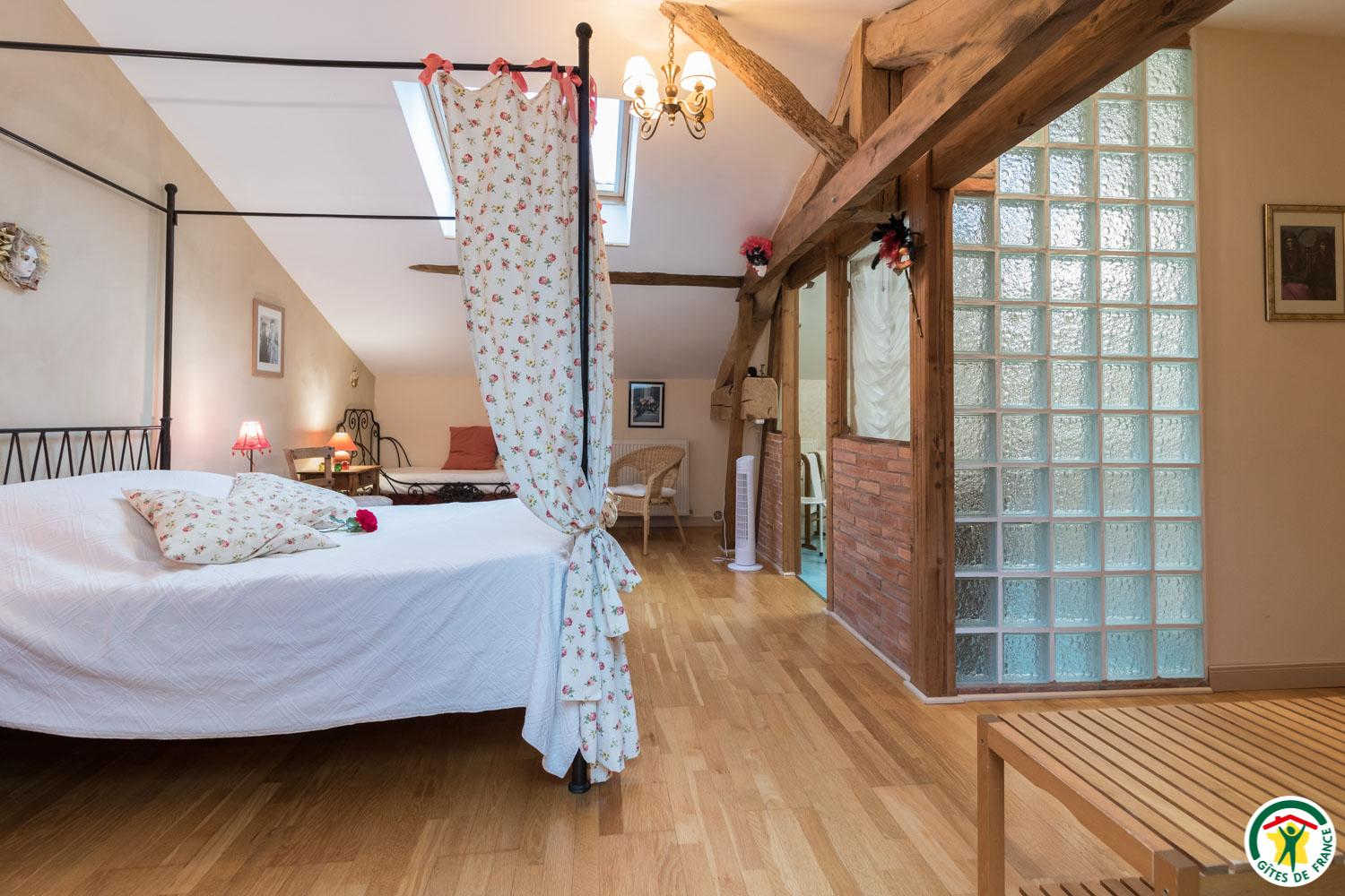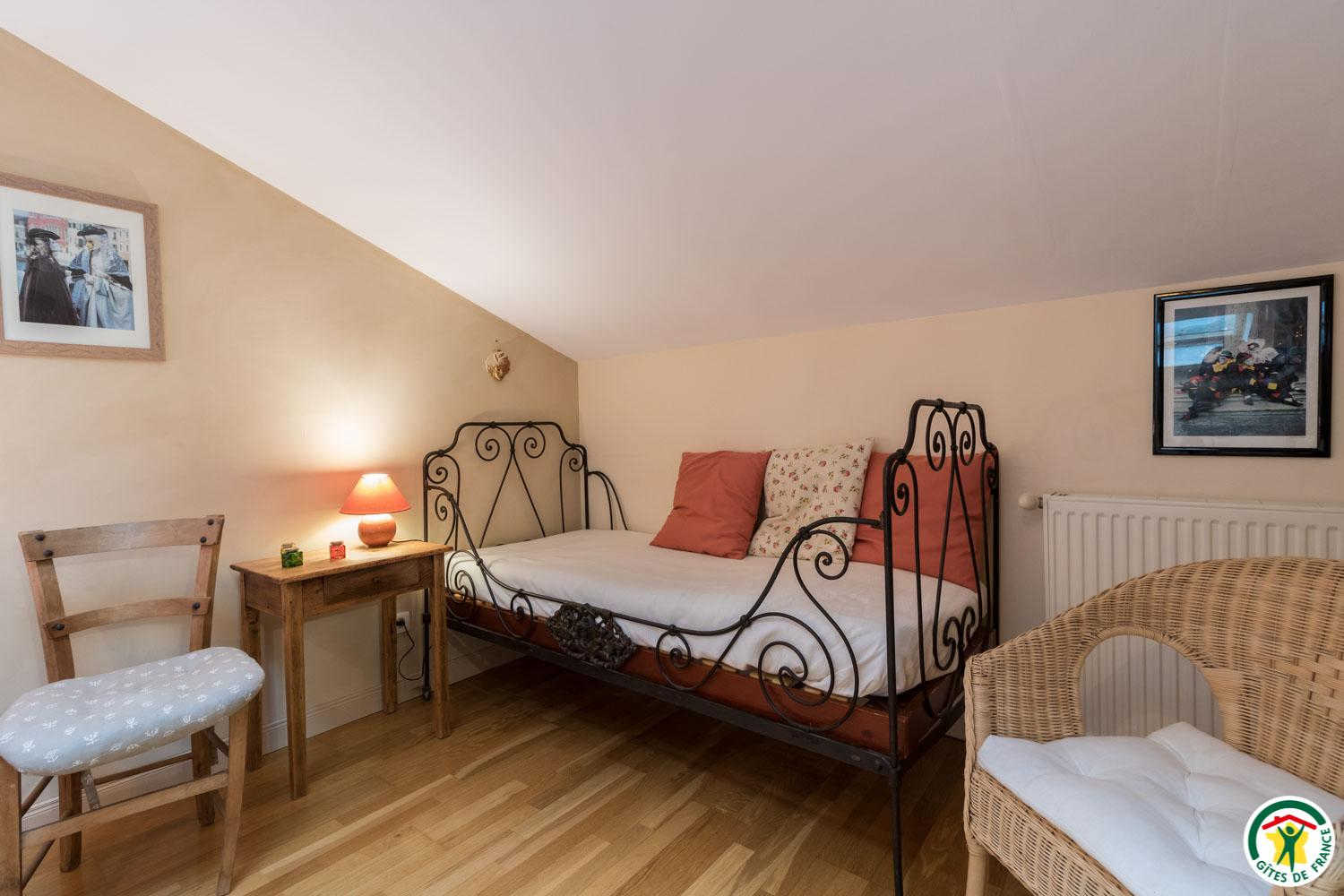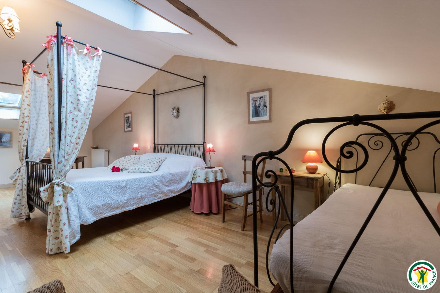 – First floor: “Venise” room with sloping ceilings (1 canopied 140cm double bed + 1 90cm single bed + bathroom, shower and WC).