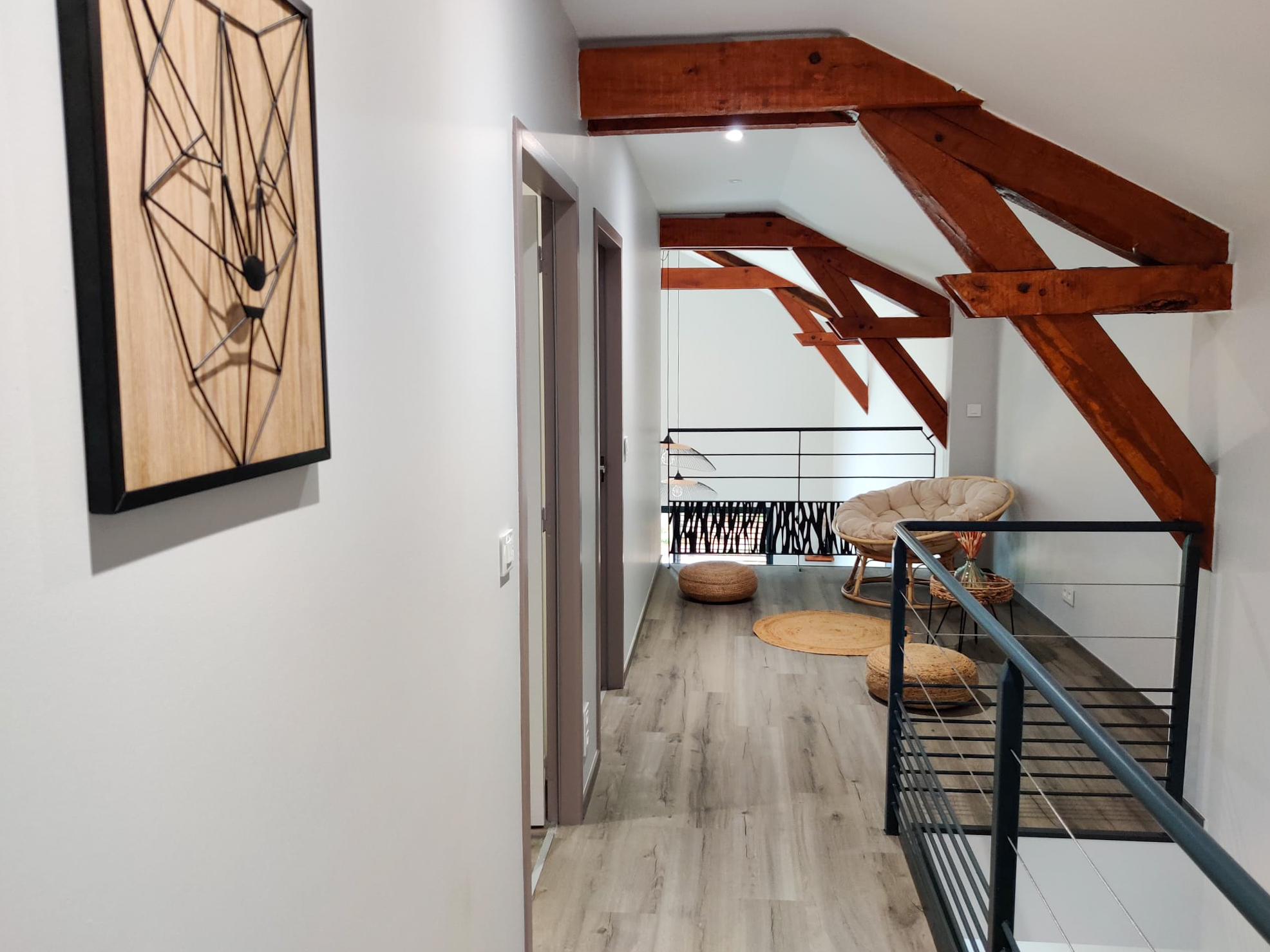 Le bâtiment principal est une ancienne étable entièrement rénovée comportant 3 chambres avec salles de bain privées avec WC, dont une chambre spacieuse de 27m2 au rez-de-chaussée et 2 chambres de 23m2 à l’étage. 3 autres chambres supplémentaires se trouvent à l’étage de l’annexe – le bâtiment secondaire -, accessible par un escalier extérieur. Elles partagent une salle de bain avec WC séparé.