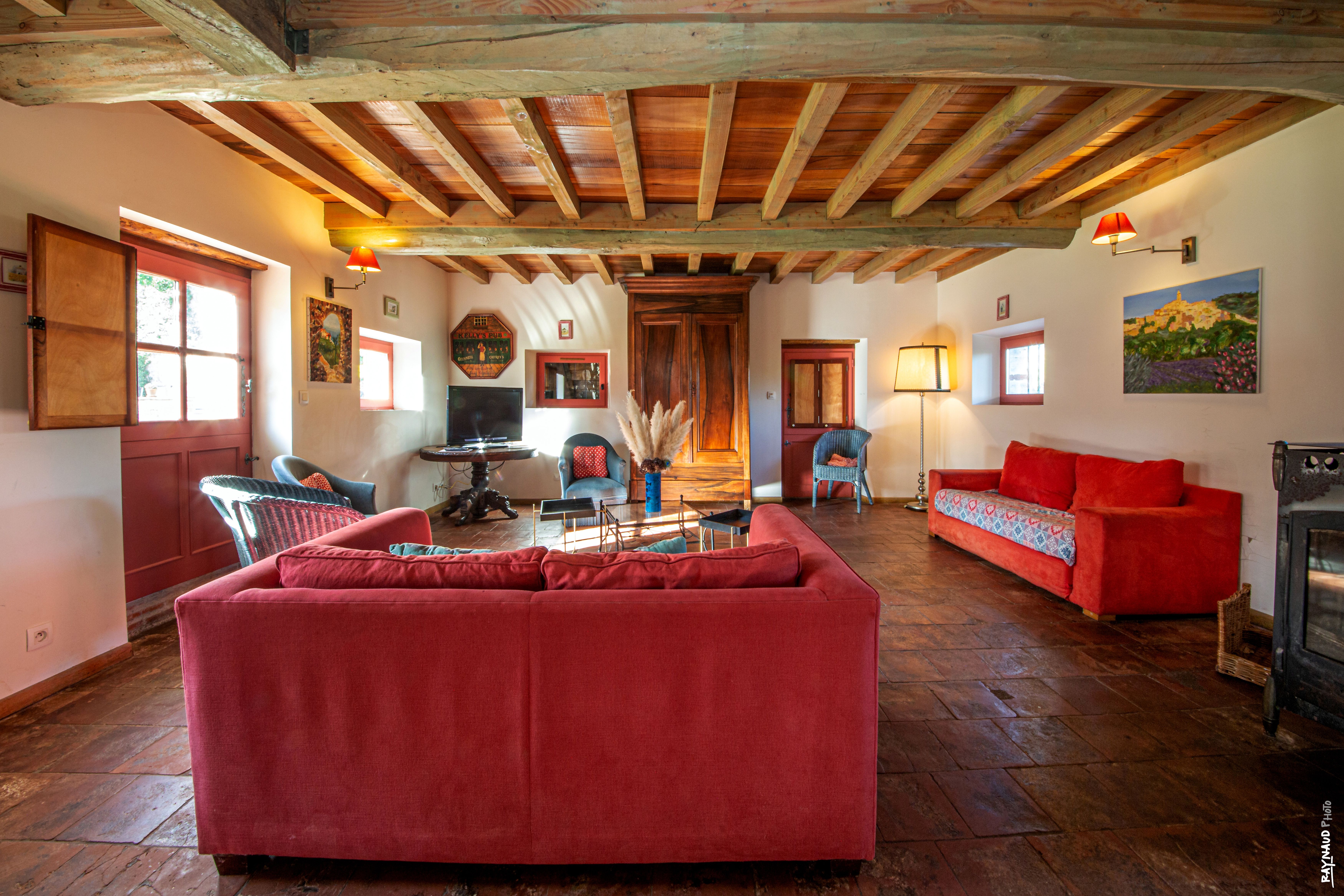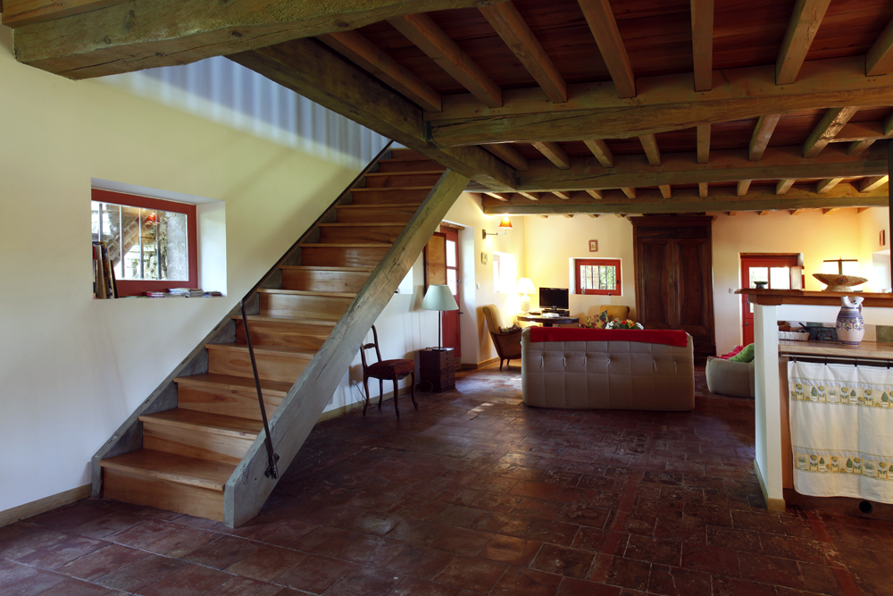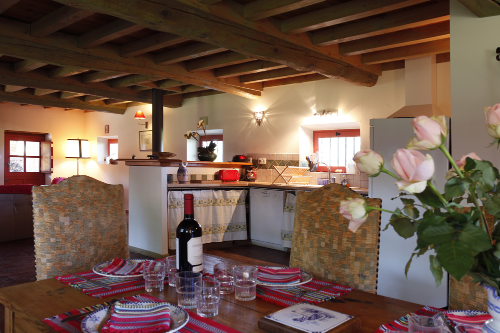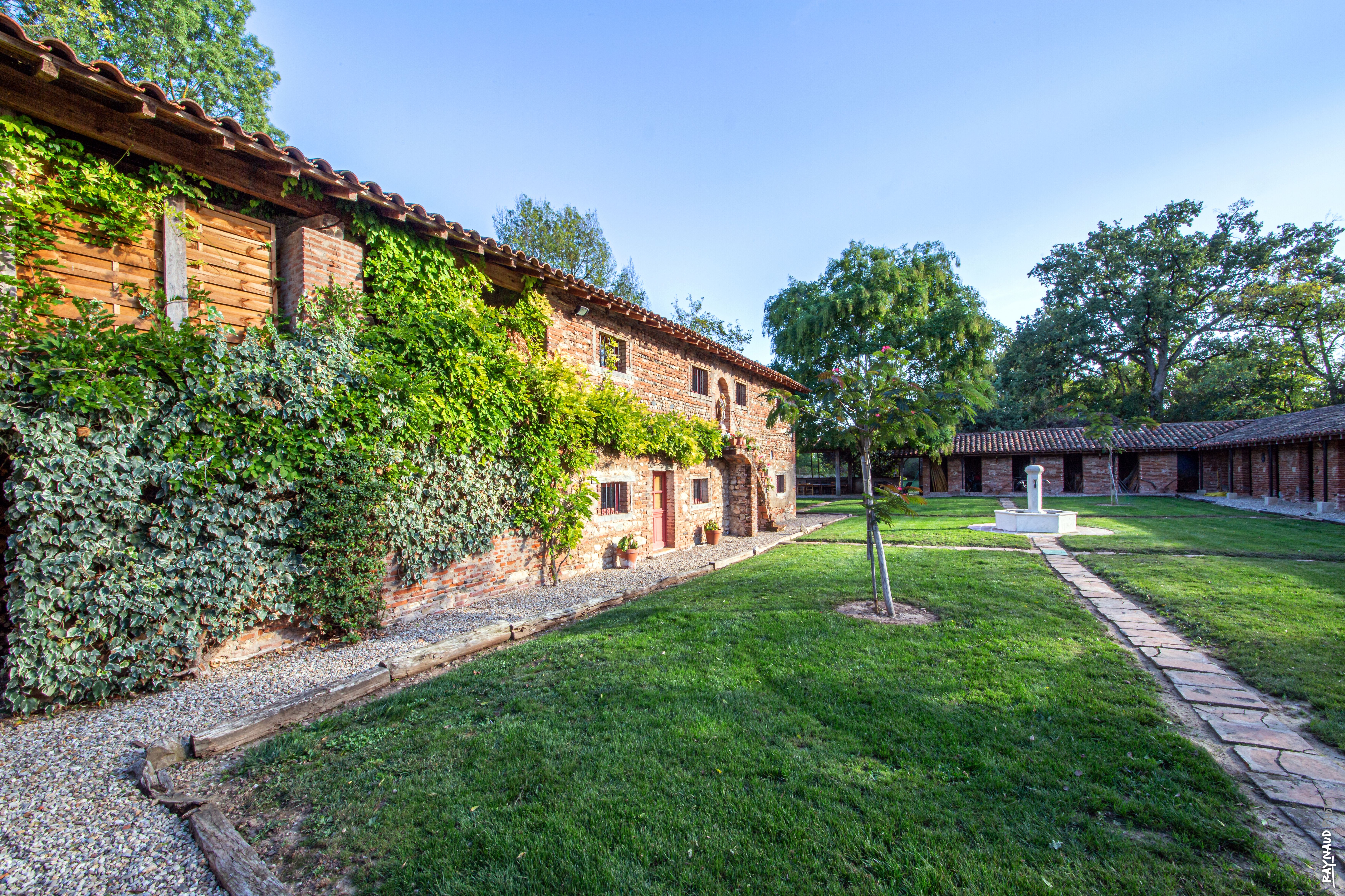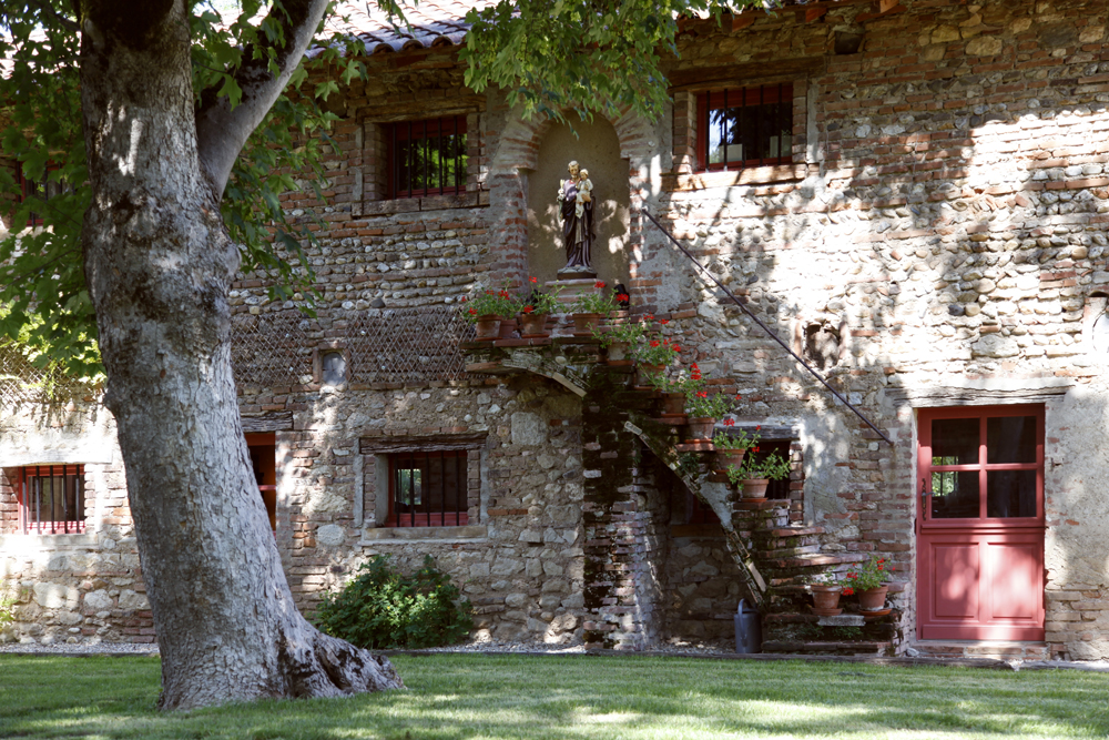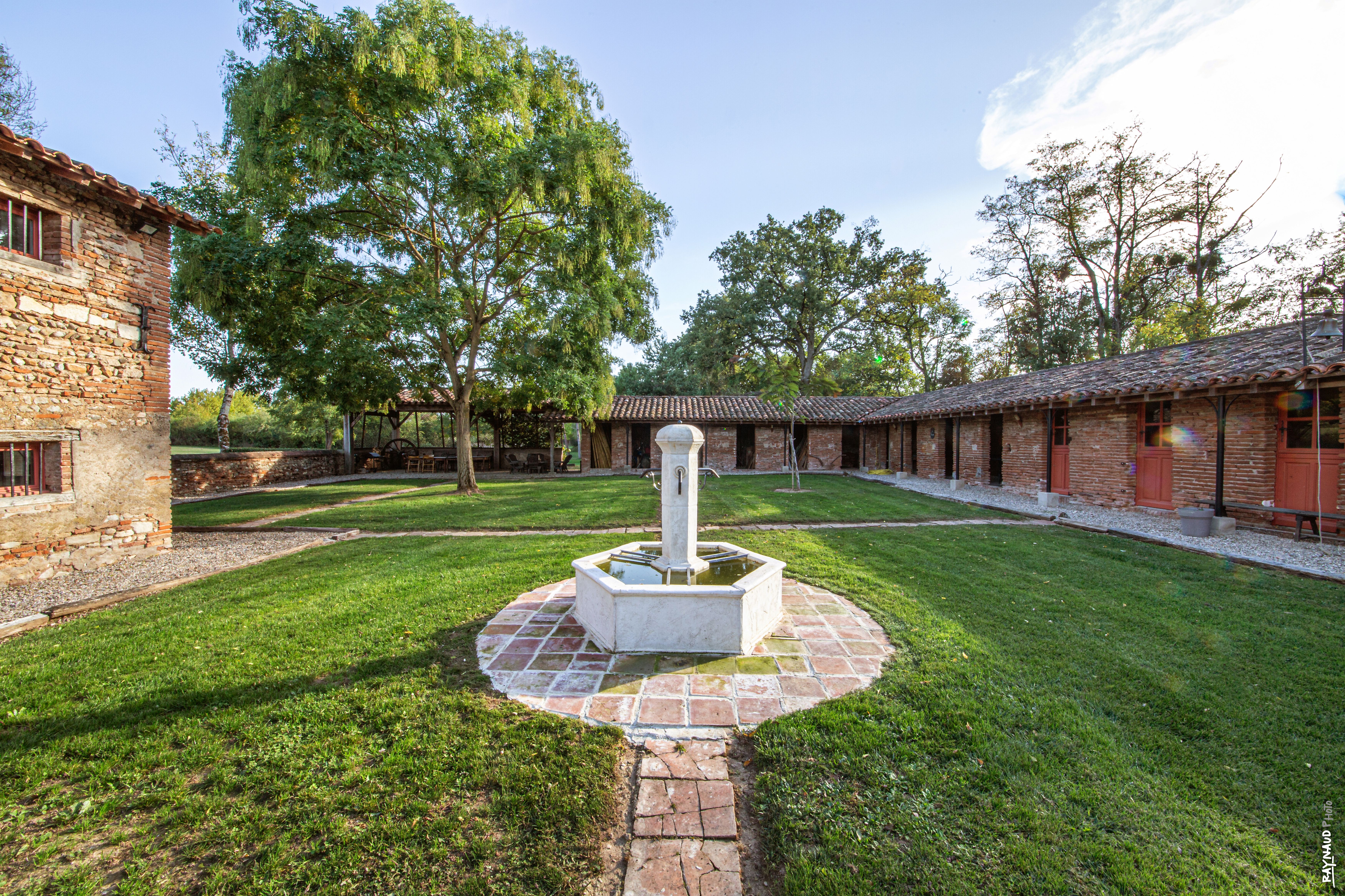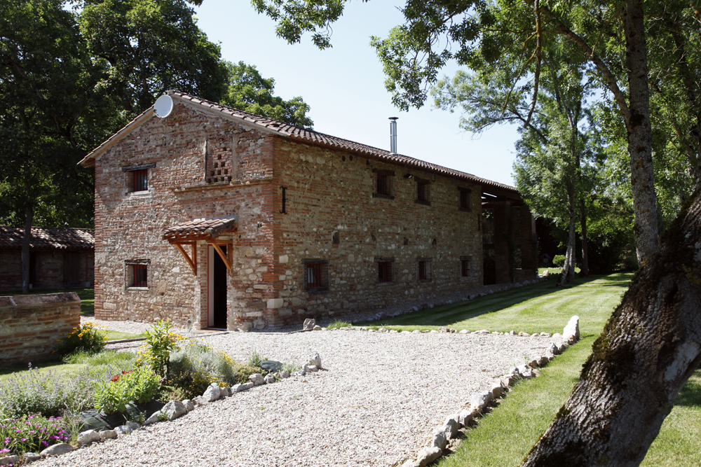 It’s a pretty farmhouse, several hundred years old, on the banks of the Tarn. These old buildings, renovated inside and decorated with care in the taste of yesteryear, retain their red brick walls and pebbles patiently plucked from the bed of the Tarn. The henhouse, woodshed, chapel and former pigsties are arranged around a shady, grassy patio planted with magnificent trees. The surrounding arcades evoke the image of a cloister.