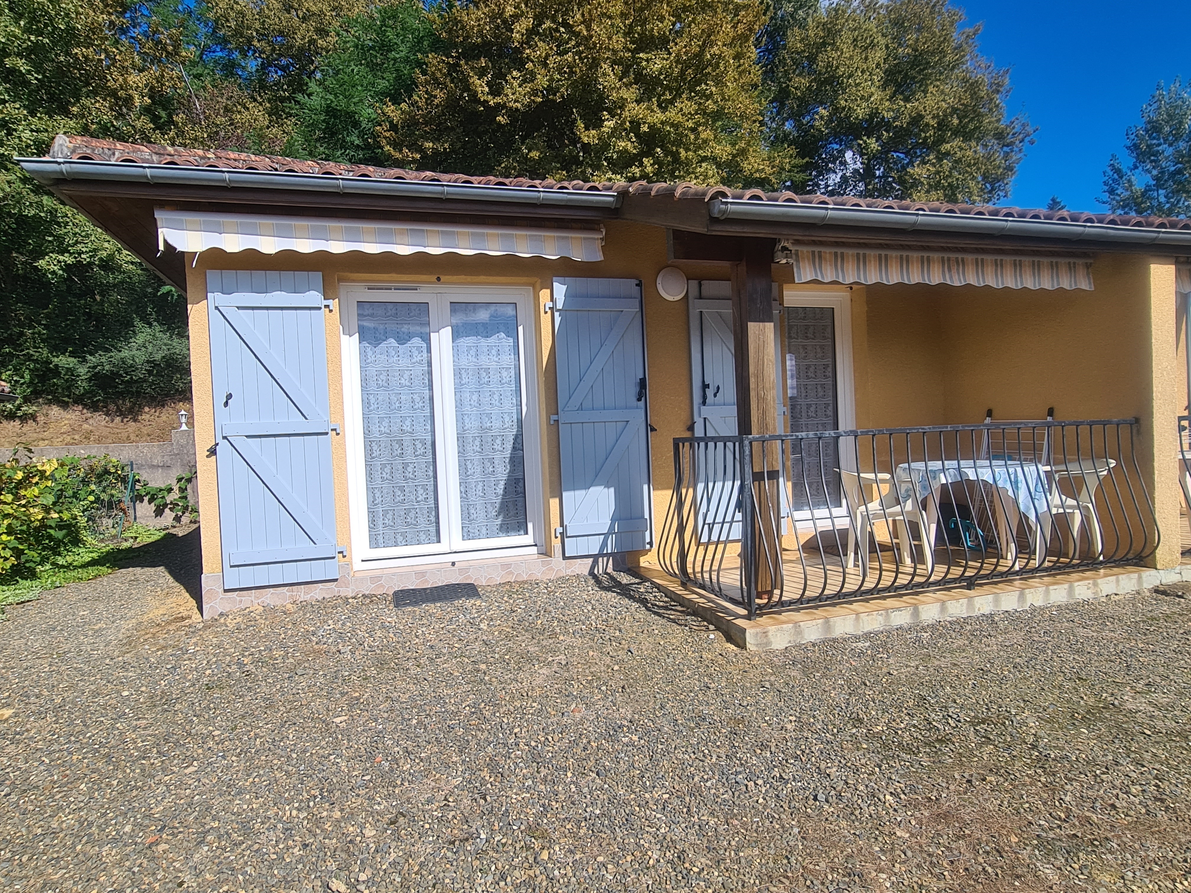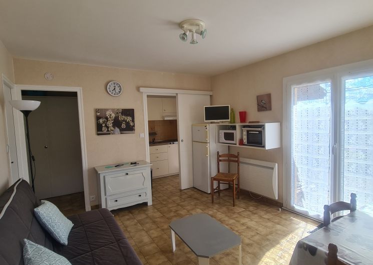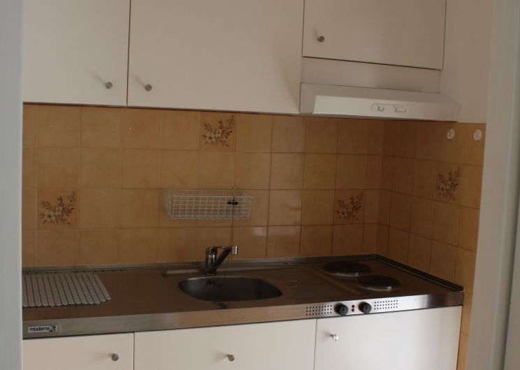 Kitchenette équipée donnant sur la terrasse couverte.