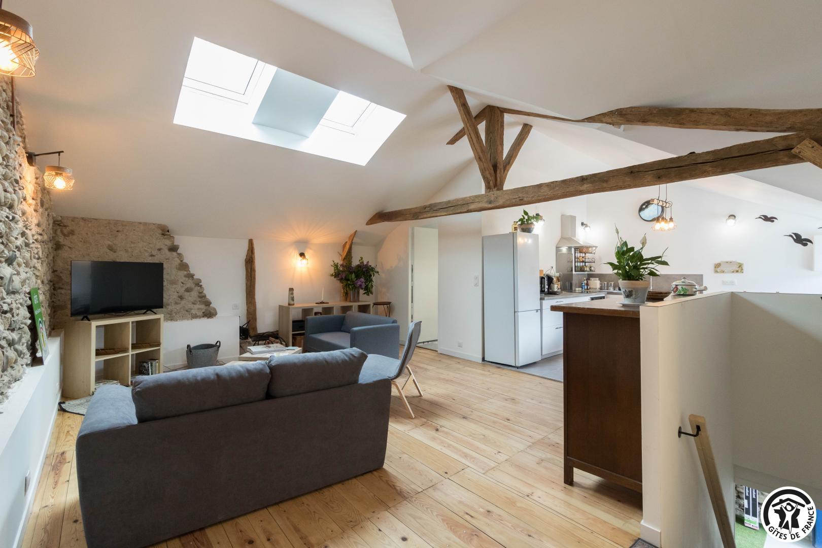 Ground floor: entrance leading to a games and relaxation room (not heated) with access to the garden. First floor (steep staircase): living room (fitted kitchen, dining area and sitting area), 2 bedrooms (2 beds 90*190cm)(1 bed 160*200cm), shower room/WC. Reversible air conditioning in living room, ceiling fan in bedrooms. Owners in the adjoining part.