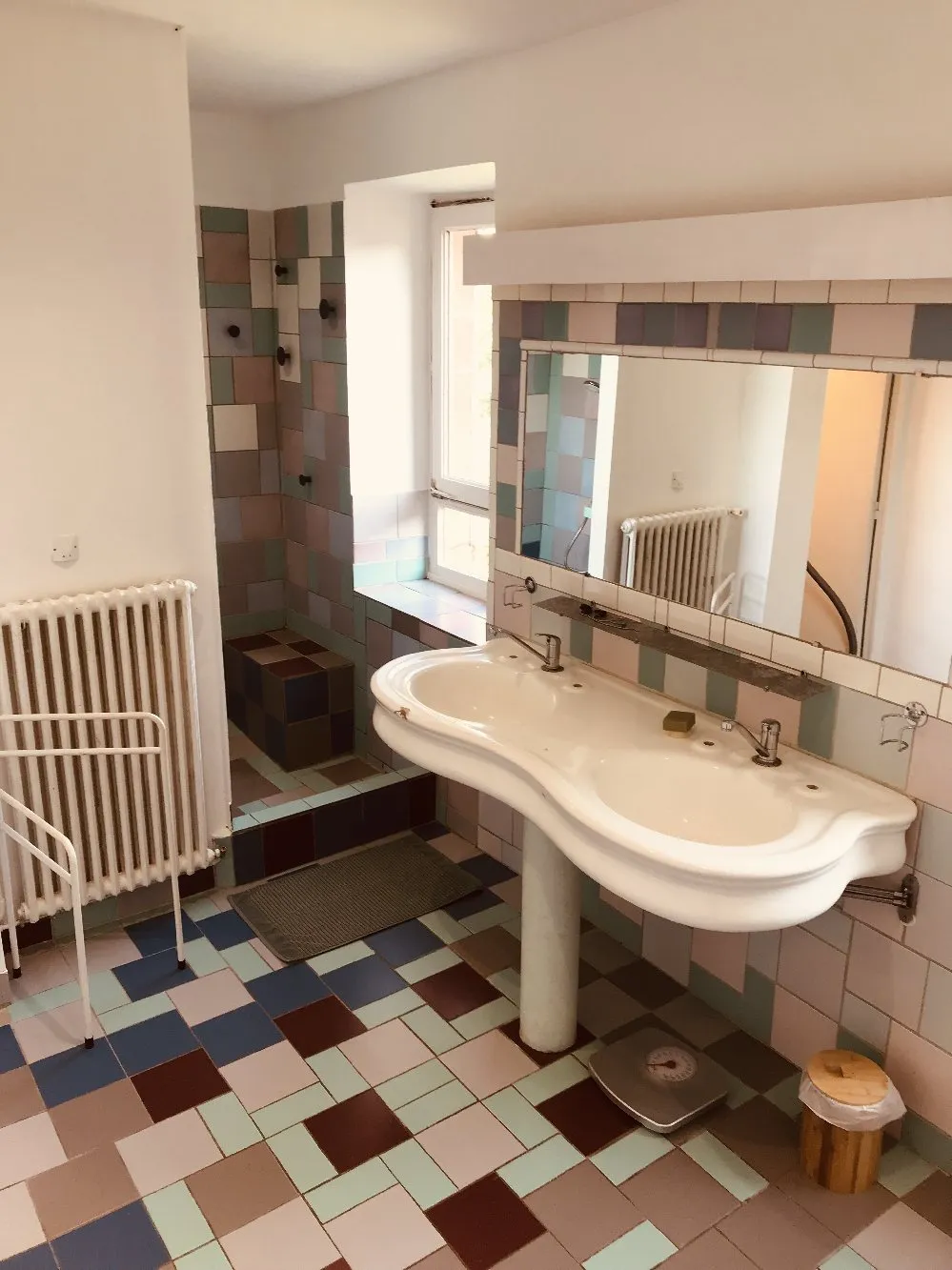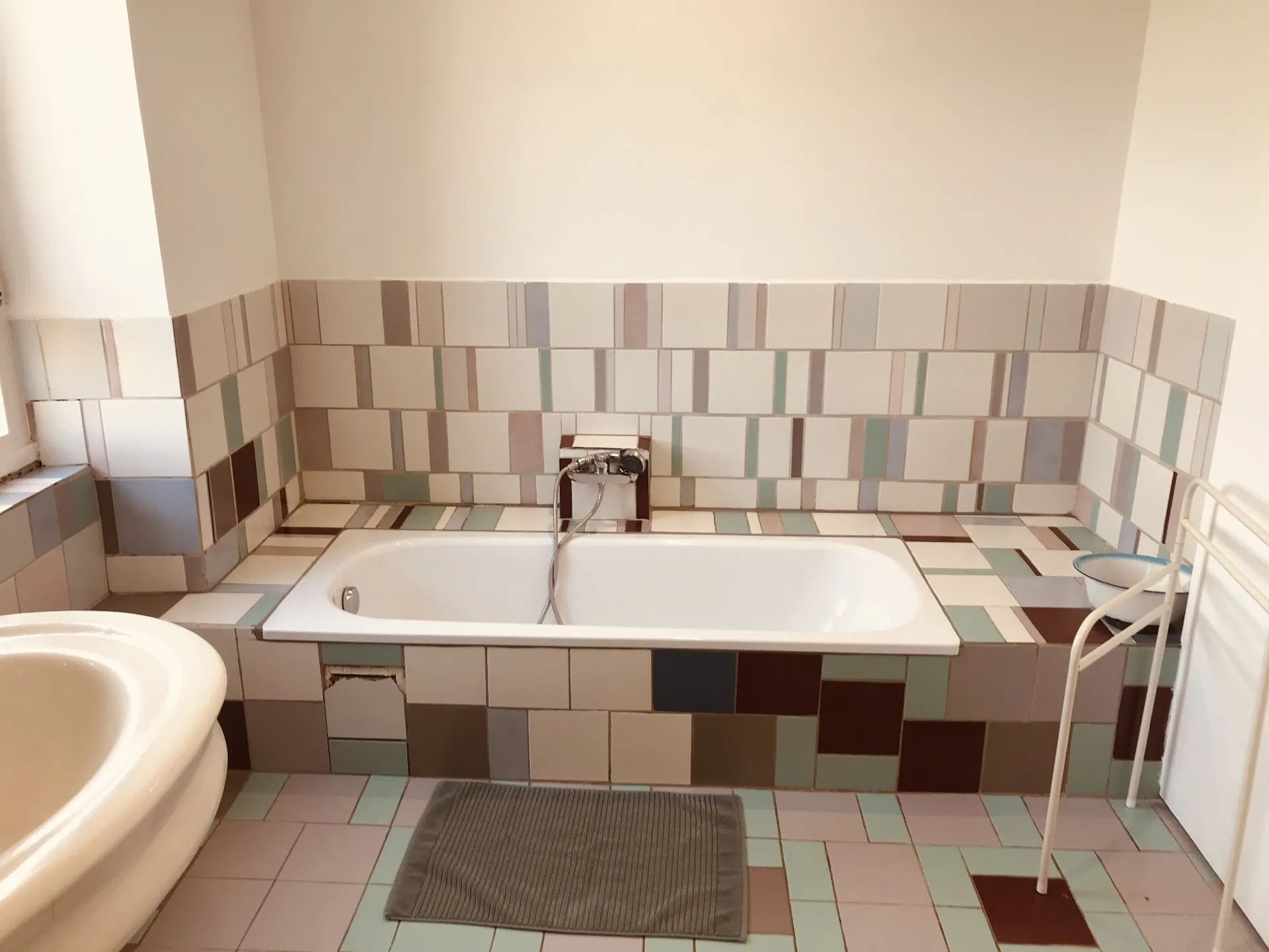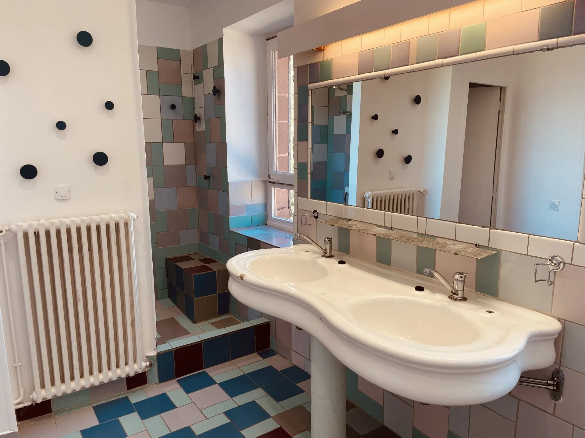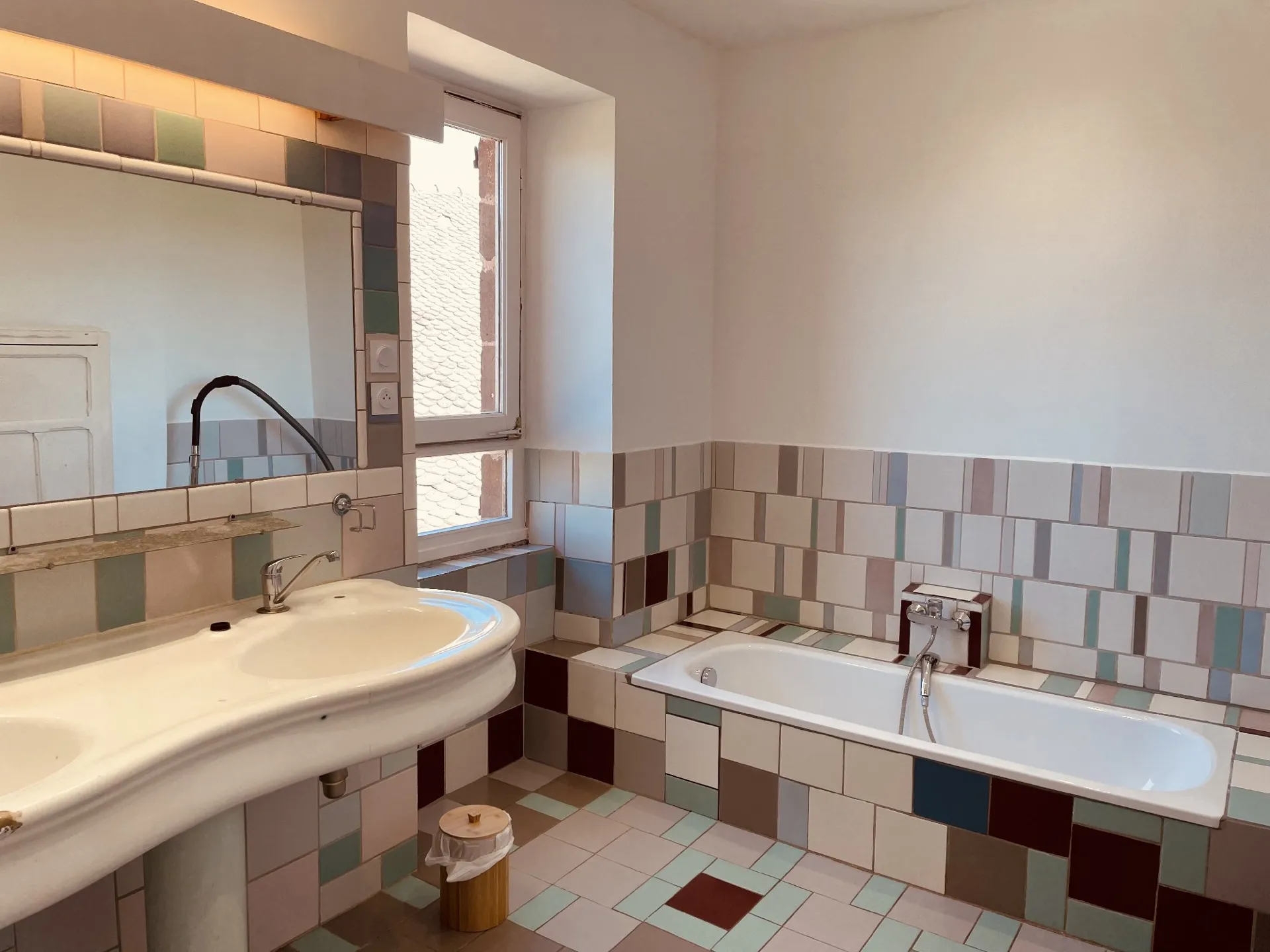 – 1 vaste salle de bain avec wc (lavabo double, baignoire, douche italienne, sèche-cheveux …)
