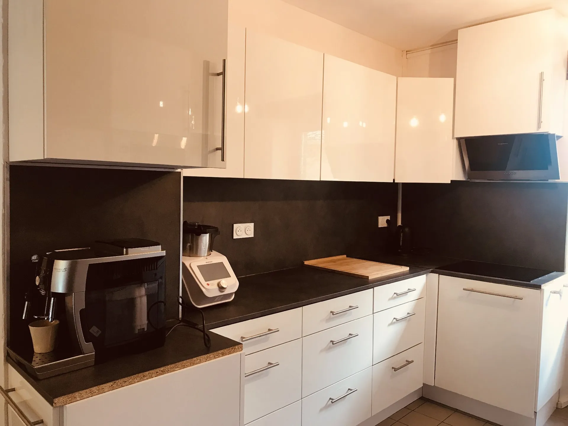 – cuisine équipée (frigo-congélateur américain, plaque à induction 4 feux, four, micro-onde, lave-vaisselle, toasteur, robot de cuisine …) + matériel et vaisselle en grande quantité