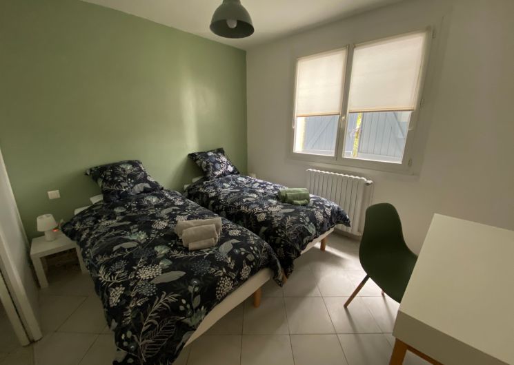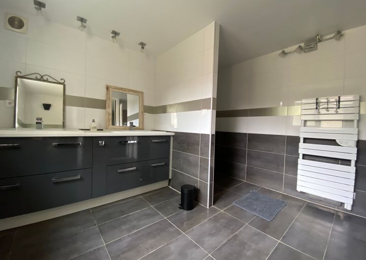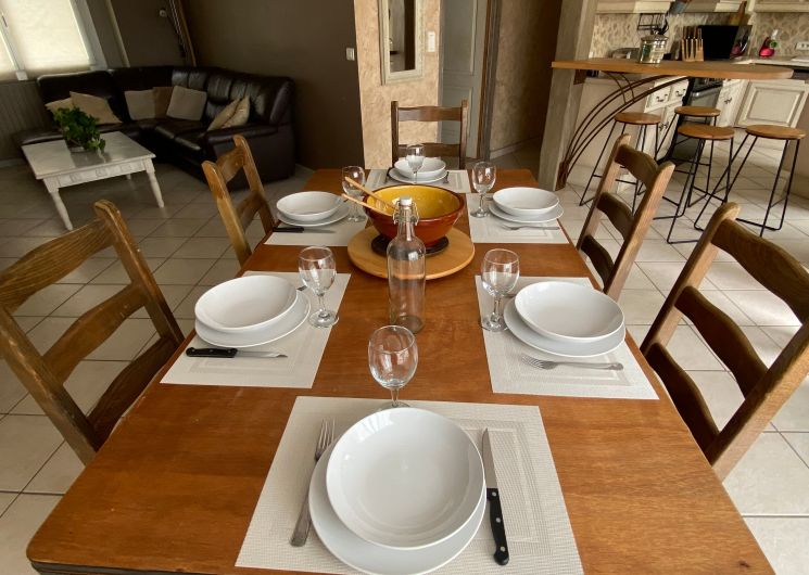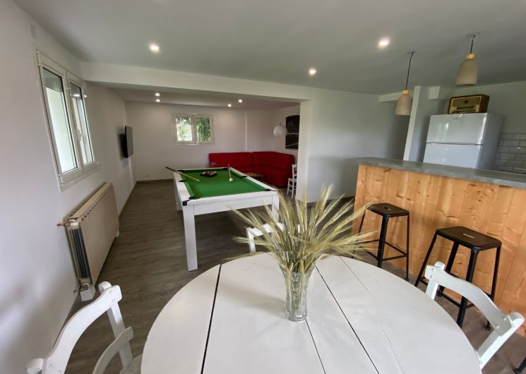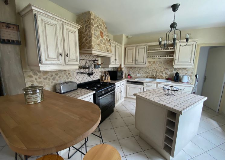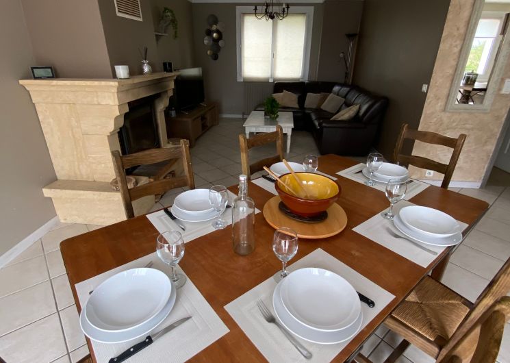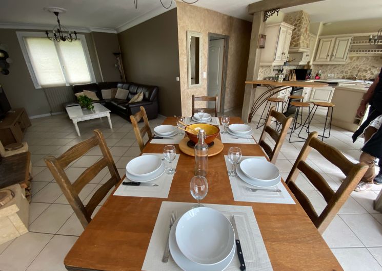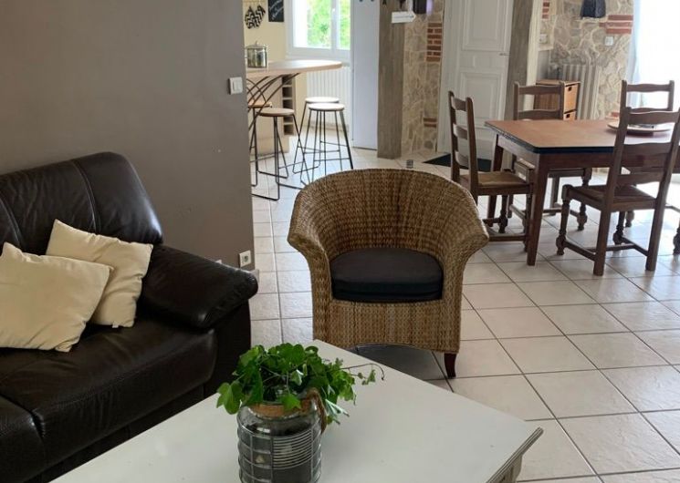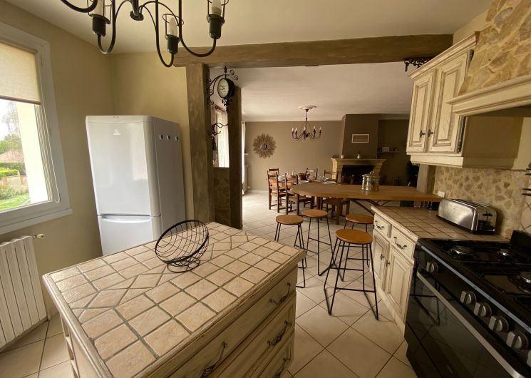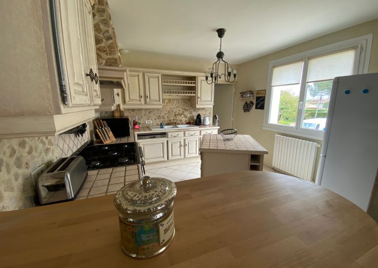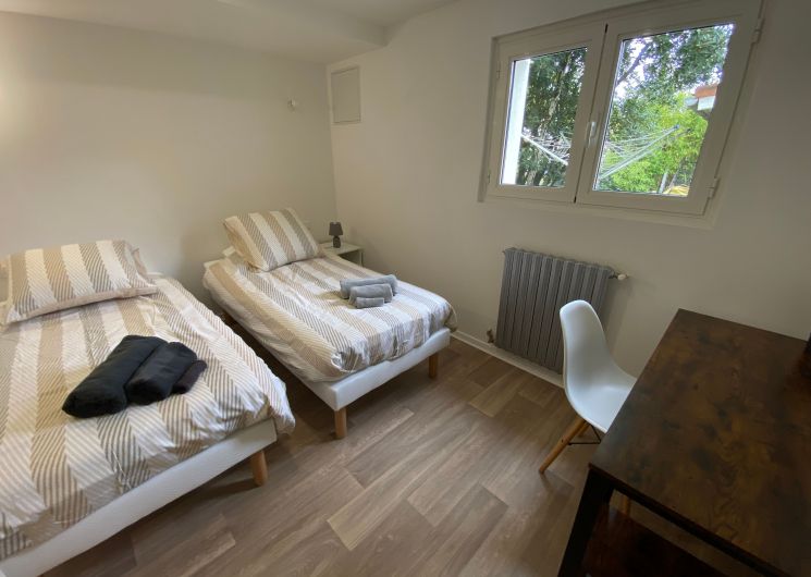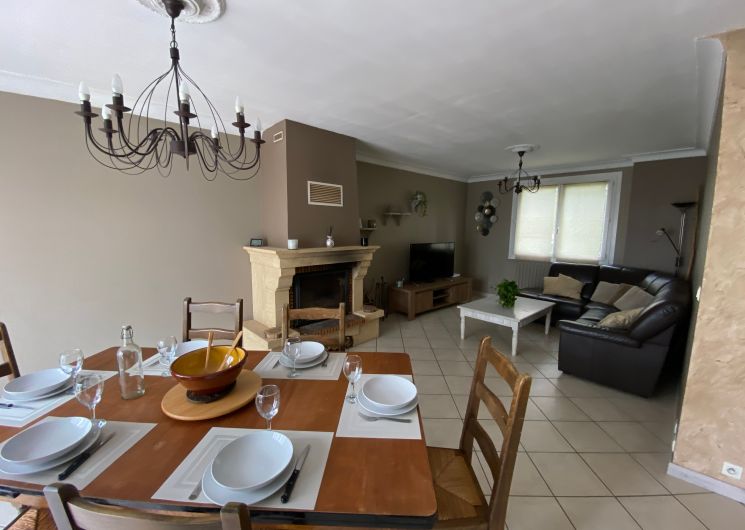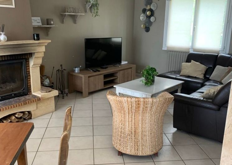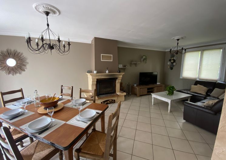 The accommodation comprises two interconnected areas, on the ground and ground floors, with all modern comforts. On the ground floor, there is a living room with a fitted kitchen (fridge-freezer, hob, oven, washing machine), table and chairs, corner sofa and TV. A bedroom (2 x 0.90cm beds), a bedroom (1 x 140cm bed) and a huge shower room with wc. Via an internal staircase and another external staircase, the 1st floor offers a large living room with fireplace (TV insert), corner sofa, dining area (table and chairs), and integrated kitchen area (cooking facilities, dishwasher, oven, microwave, fridge). Two bedrooms (2 single beds), one bedroom (1 double bed), shower room and separate wc. Balcony on first floor. Covered pergola with garden table and stools, string lights. Wifi throughout. Bed linen, towels and household linen provided and included in the price. Wood for the fireplace provided. Charcoal barbecue. Fenced garden with trees and gate. Bicycles can be stored at the rear.
