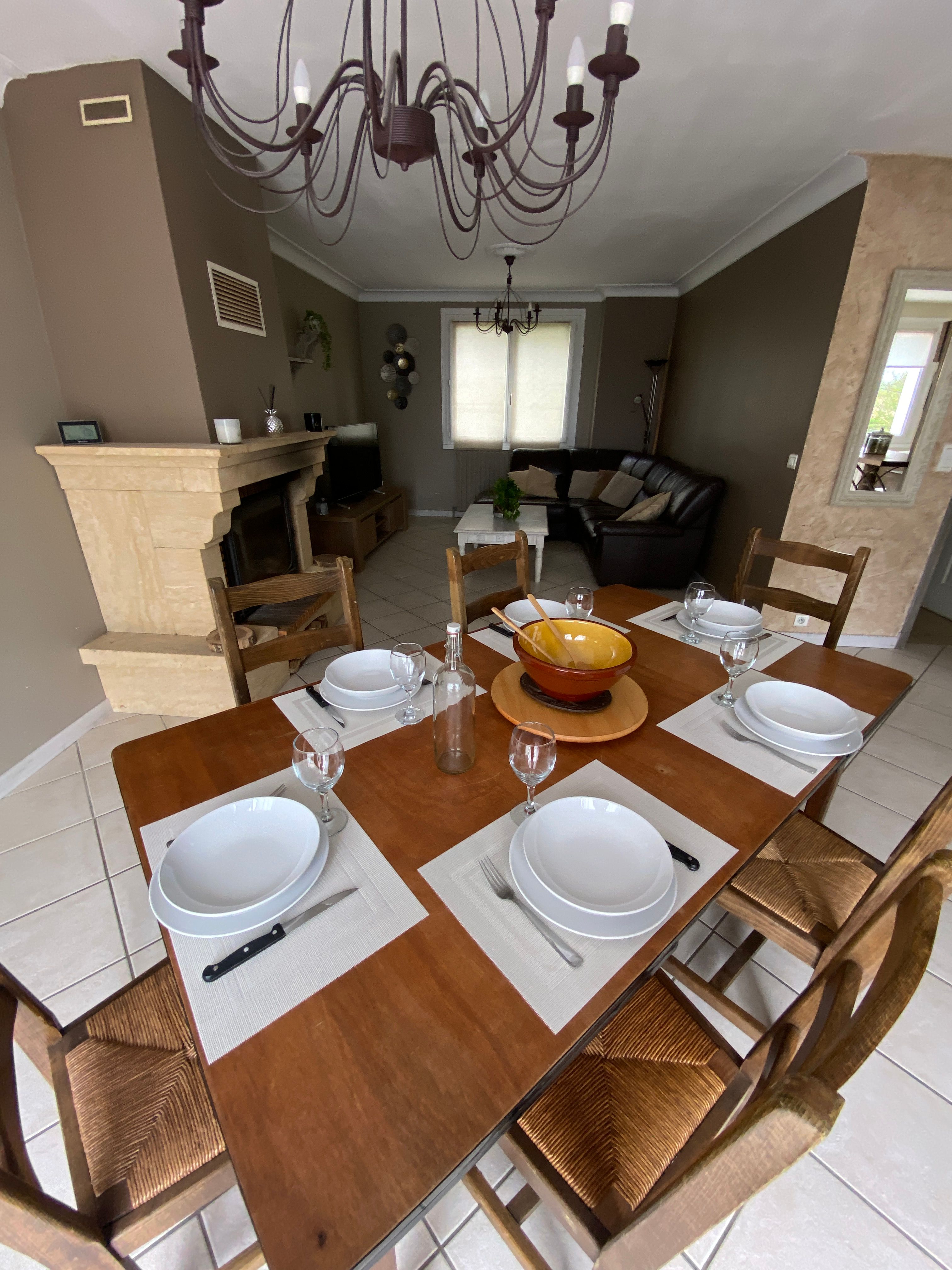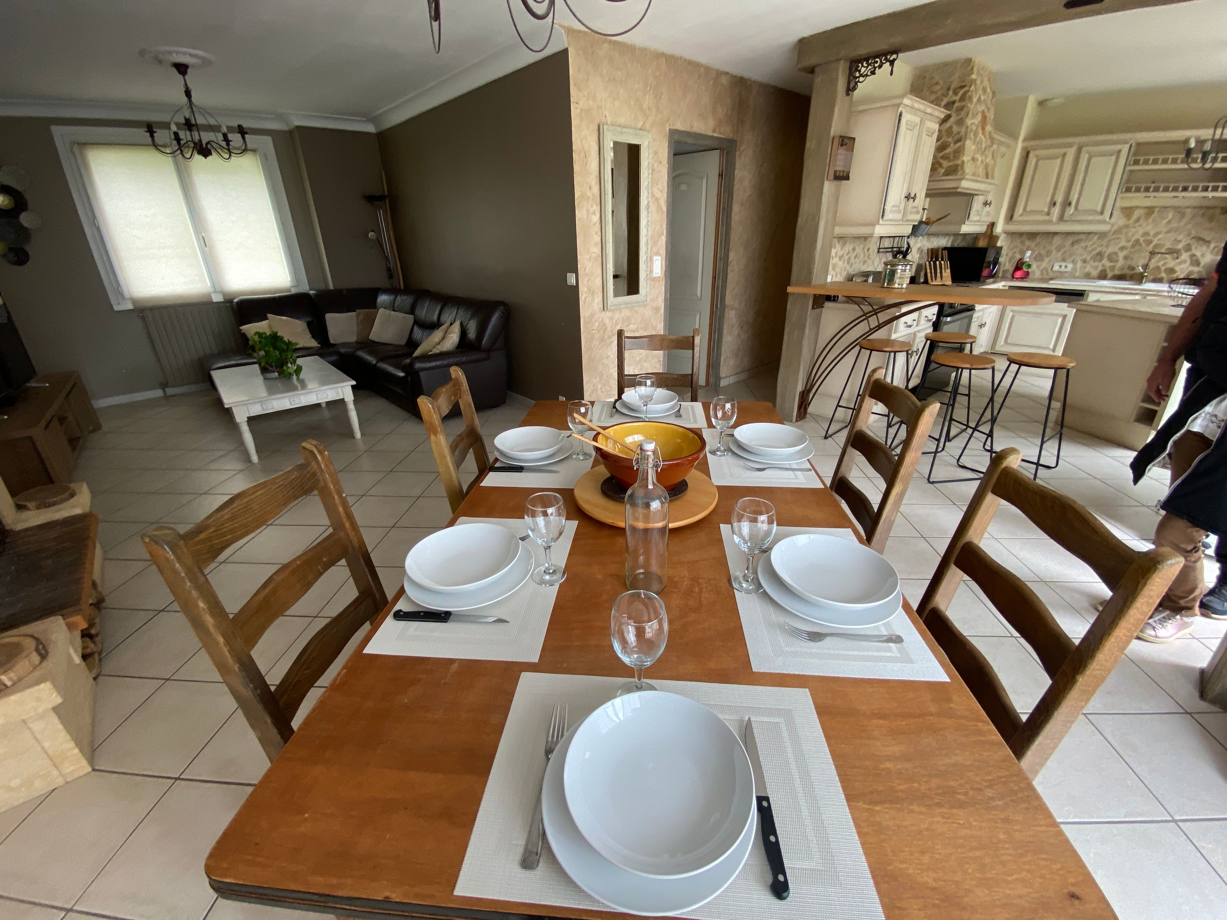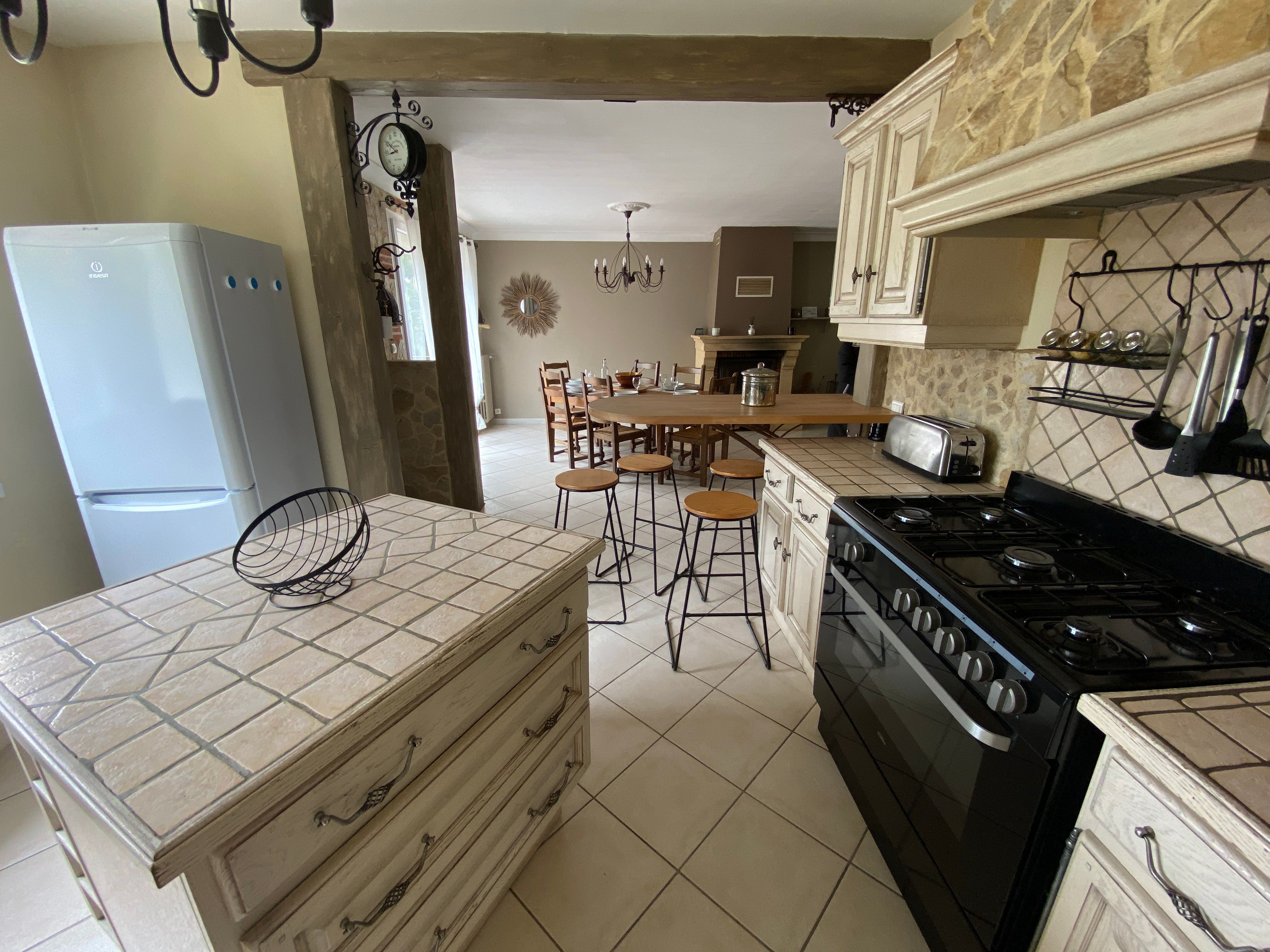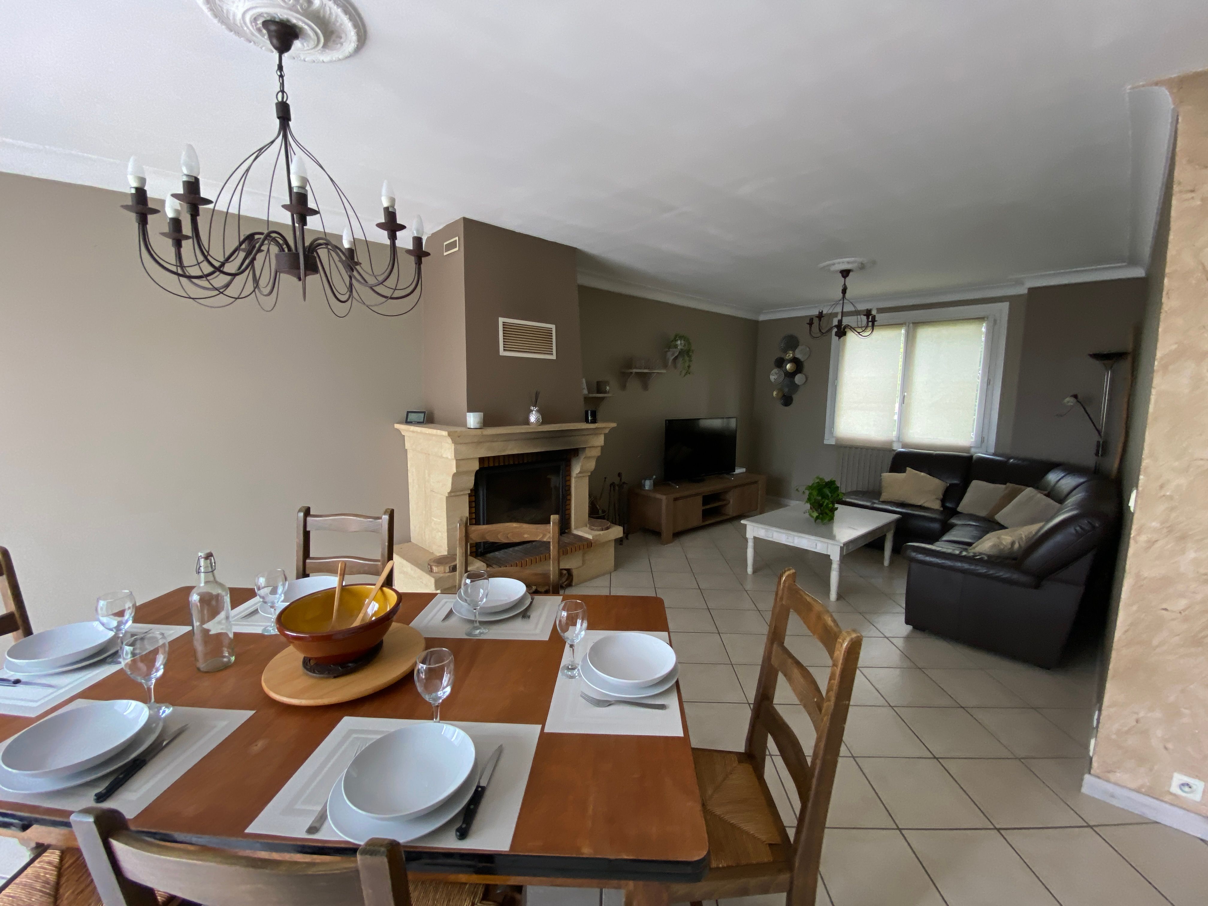 The accommodation comprises two interconnected areas, on the ground and ground floors, with all modern comforts. On the ground floor, there is a living room with a fitted kitchen (fridge-freezer, hob, oven, washing machine), table and chairs, corner sofa and TV. A bedroom (2 x 0.90cm beds), a bedroom (1 x 140cm bed) and a huge shower room with wc. Via an internal staircase and another external staircase, the 1st floor offers a large living room with fireplace (TV insert), corner sofa, dining area (table and chairs), and integrated kitchen area (cooking facilities, dishwasher, oven, microwave, fridge). Two bedrooms (2 single beds), one bedroom (1 double bed), shower room and separate wc. Balcony on first floor. Covered pergola with garden table and stools, string lights. Wifi throughout. Bed linen, towels and household linen provided and included in the price. Wood for the fireplace provided. Charcoal barbecue. Fenced garden with trees and gate. Bicycles can be stored at the rear.