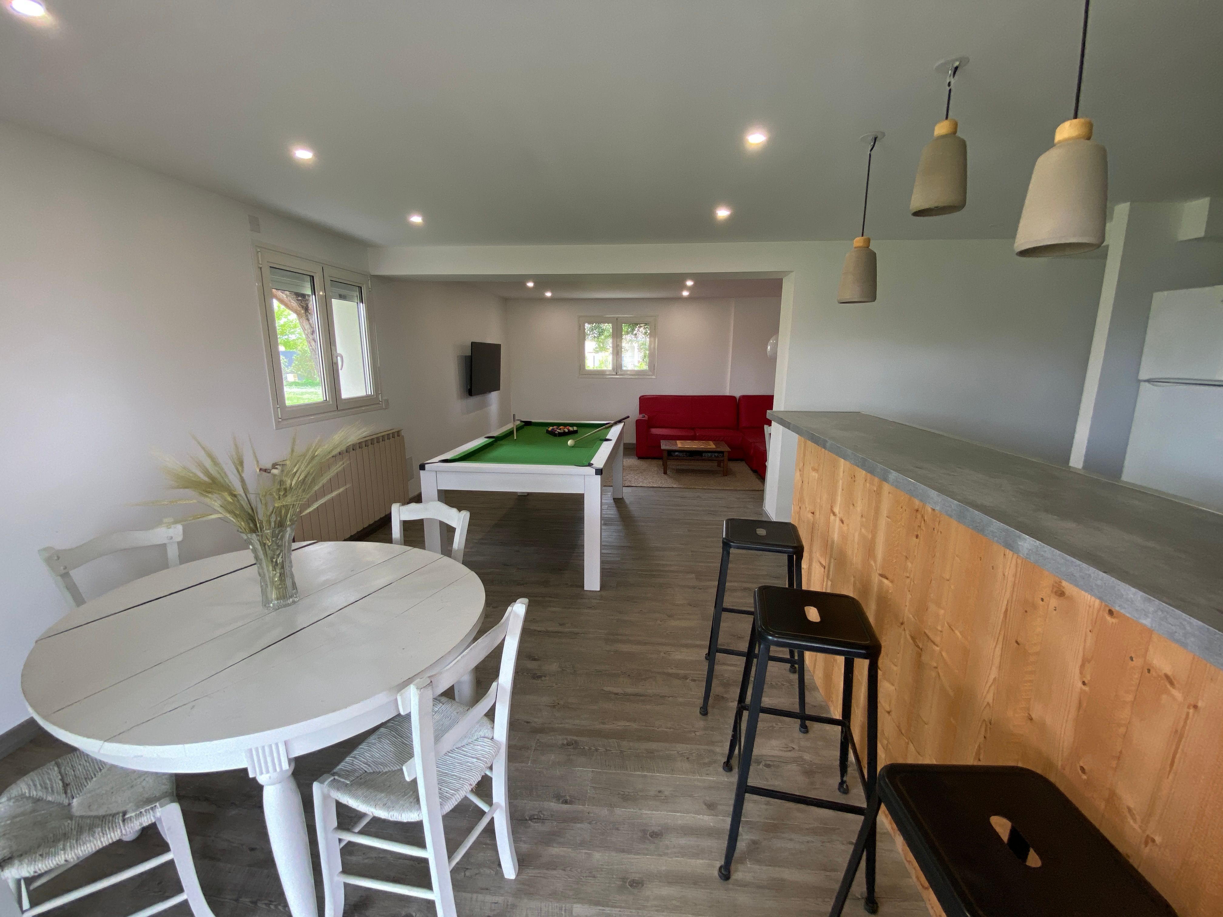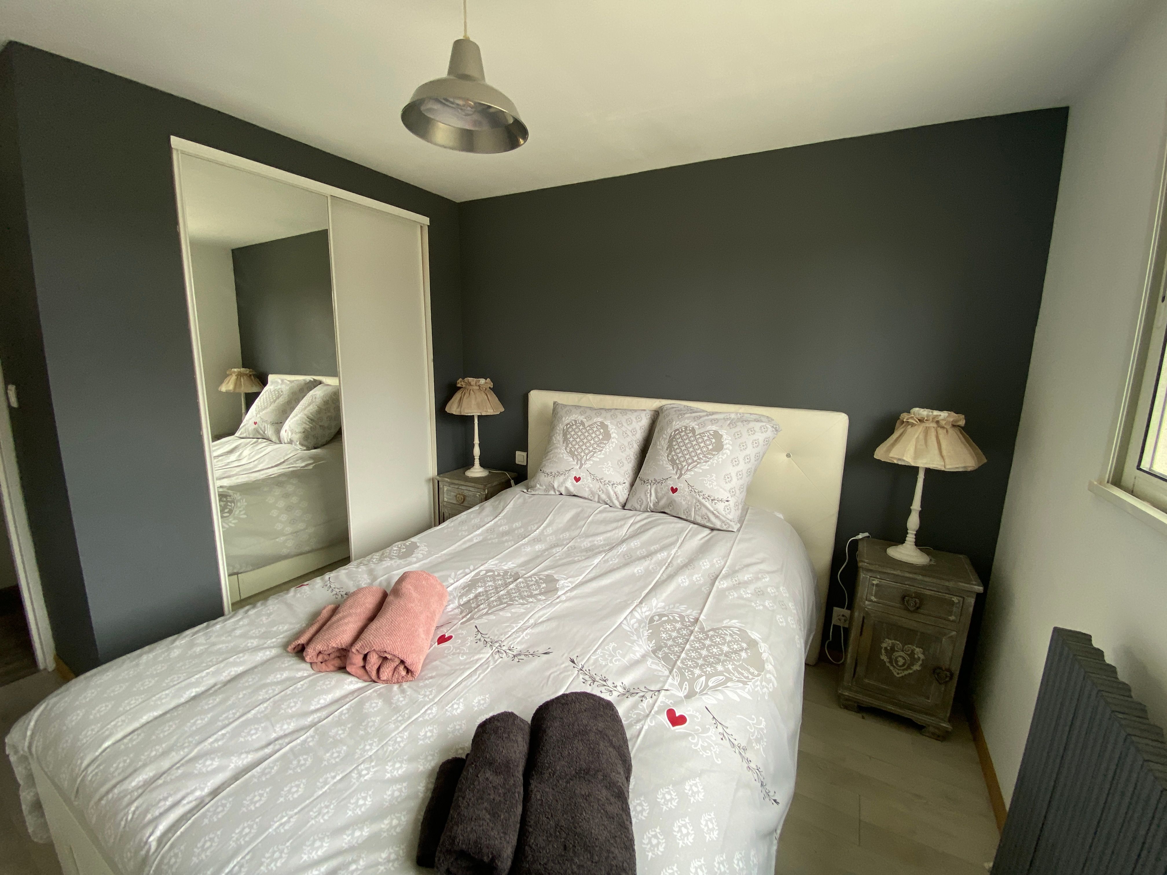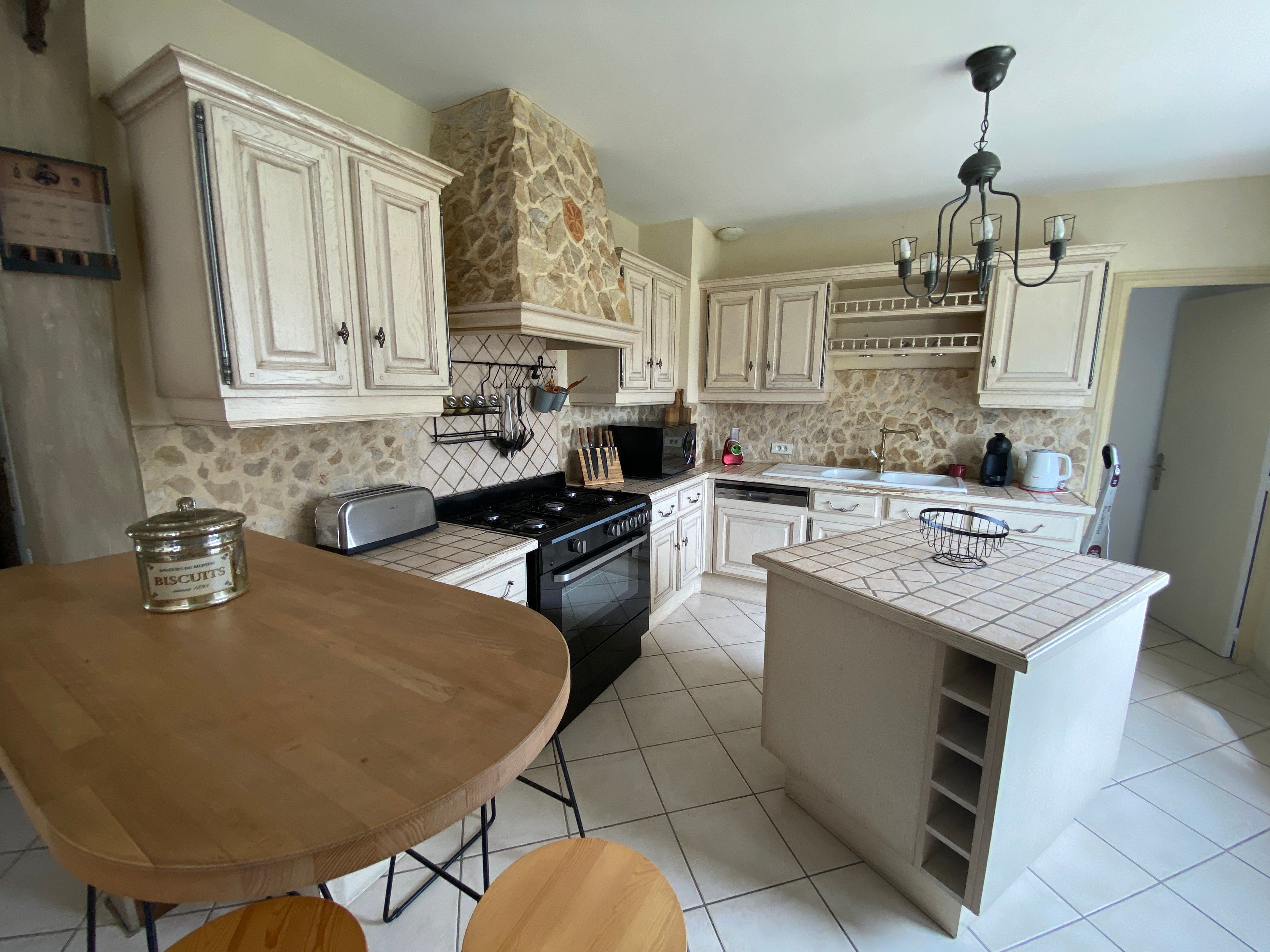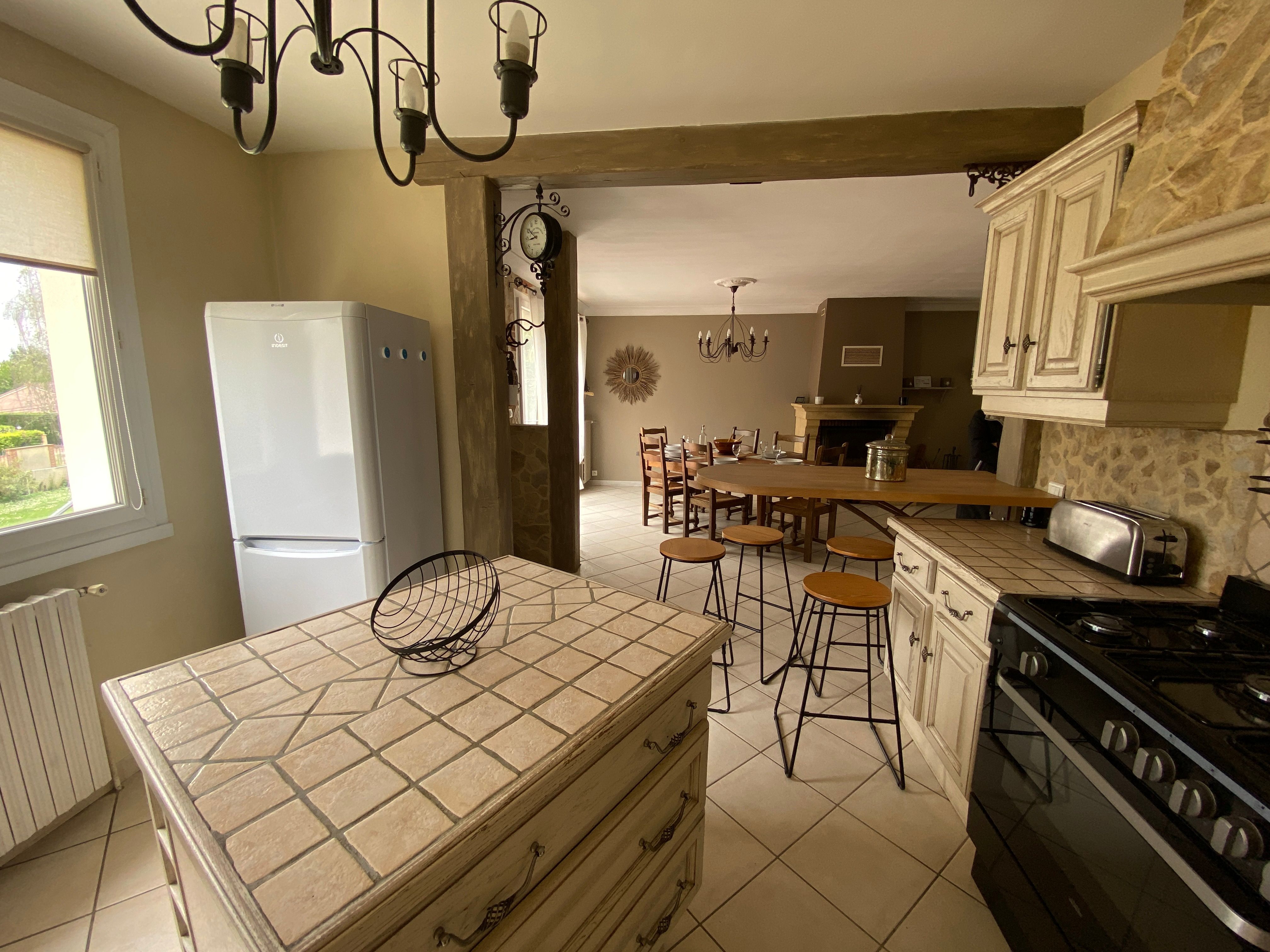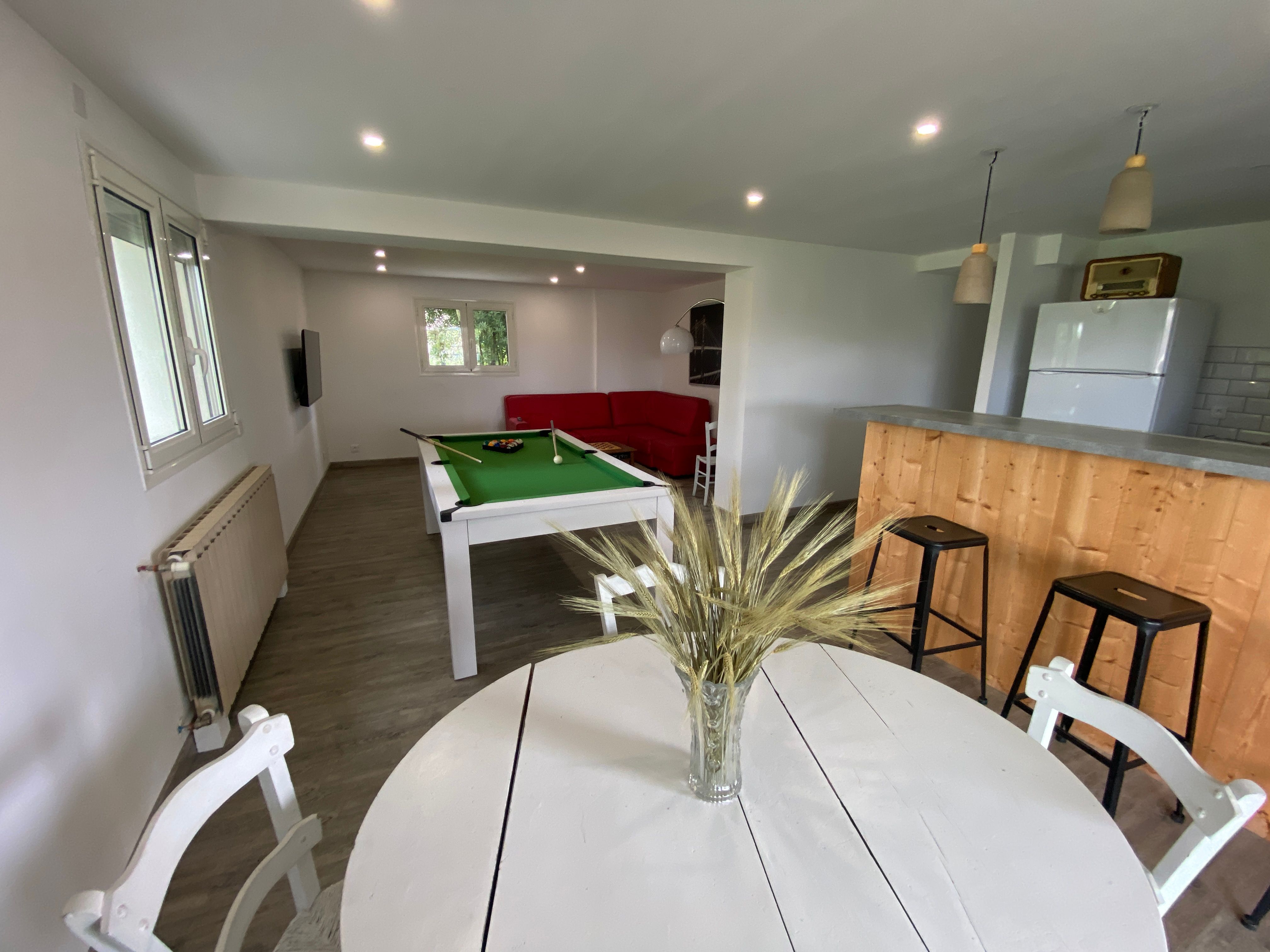 The accommodation comprises two interconnected areas, on the ground and ground floors, with all modern comforts. On the ground floor, there is a living room with a fitted kitchen (fridge-freezer, hob, oven, washing machine), table and chairs, corner sofa and TV. A bedroom (2 x 0.90cm beds), a bedroom (1 x 140cm bed) and a huge shower room with wc. Via an internal staircase and another external staircase, the 1st floor offers a large living room with fireplace (TV insert), corner sofa, dining area (table and chairs), and integrated kitchen area (cooking facilities, dishwasher, oven, microwave, fridge). Two bedrooms (2 single beds), one bedroom (1 double bed), shower room and separate wc. Balcony on first floor. Covered pergola with garden table and stools, string lights. Wifi throughout. Bed linen, towels and household linen provided and included in the price. Wood for the fireplace provided. Charcoal barbecue. Fenced garden with trees and gate. Bicycles can be stored at the rear.