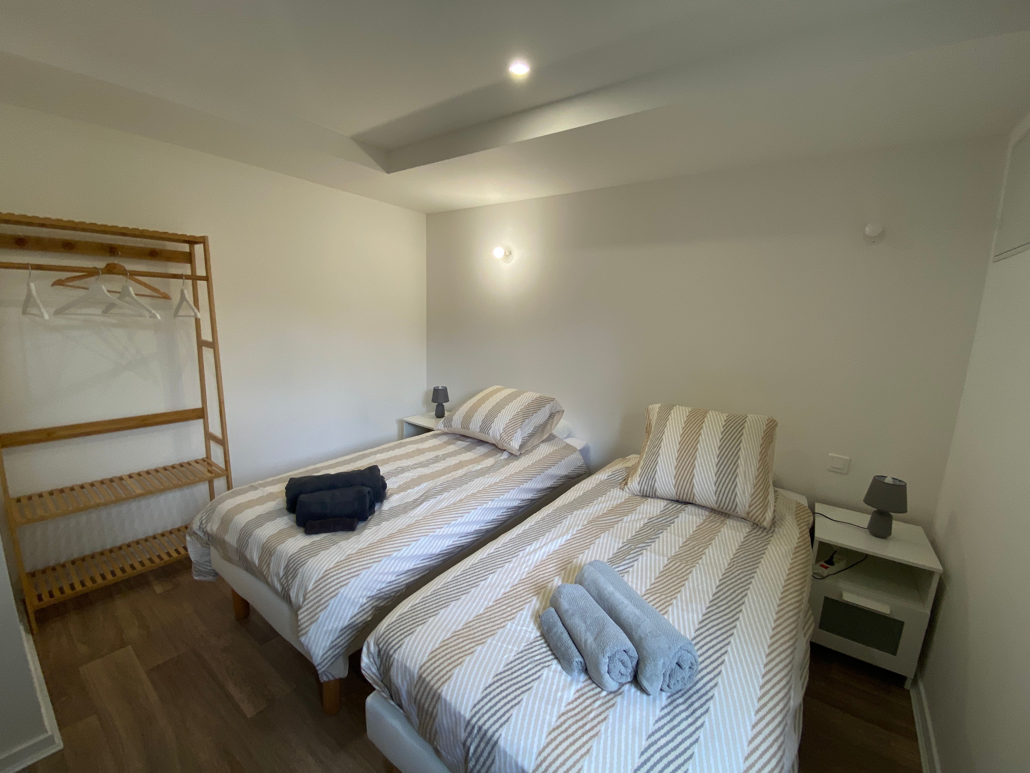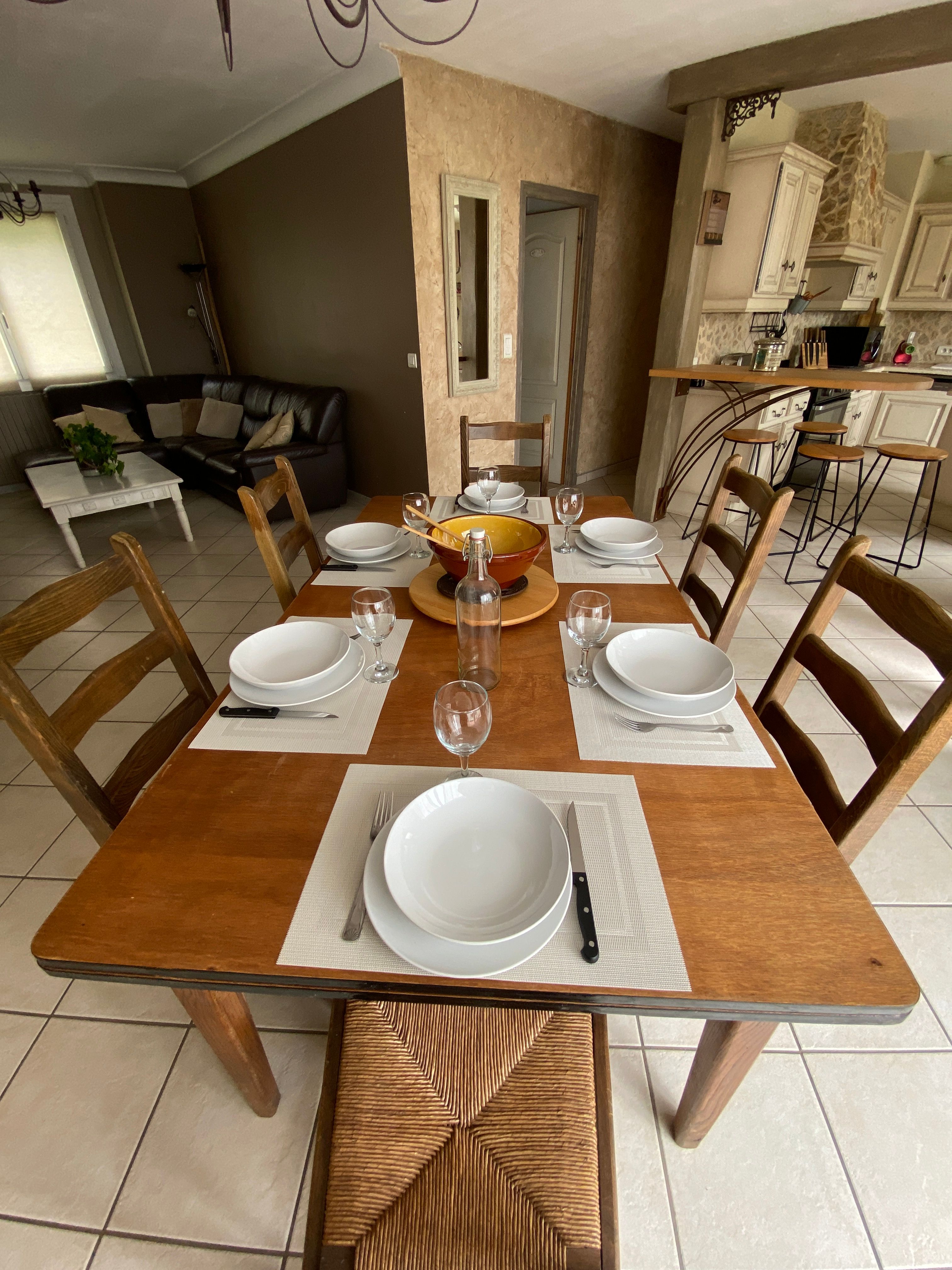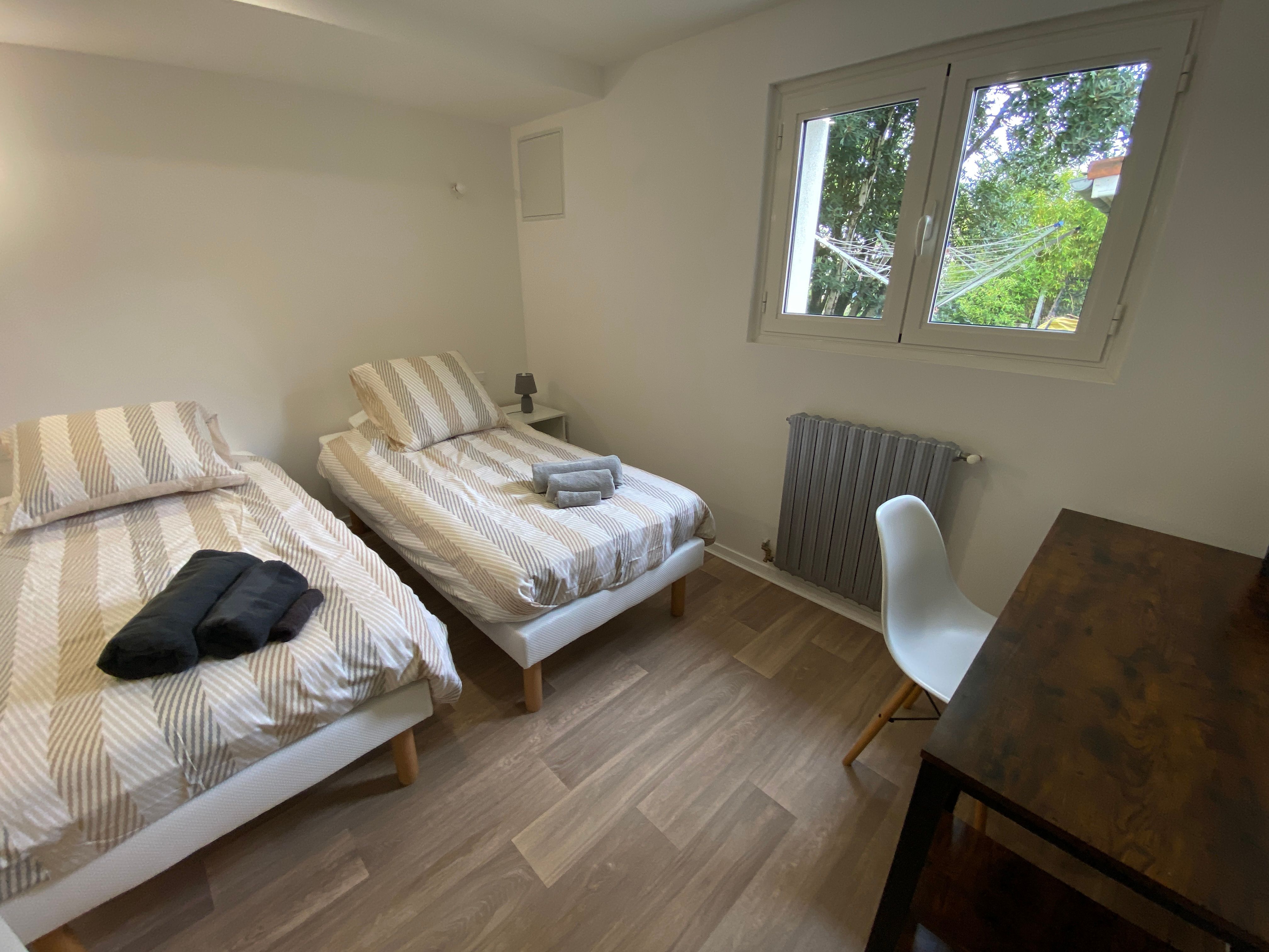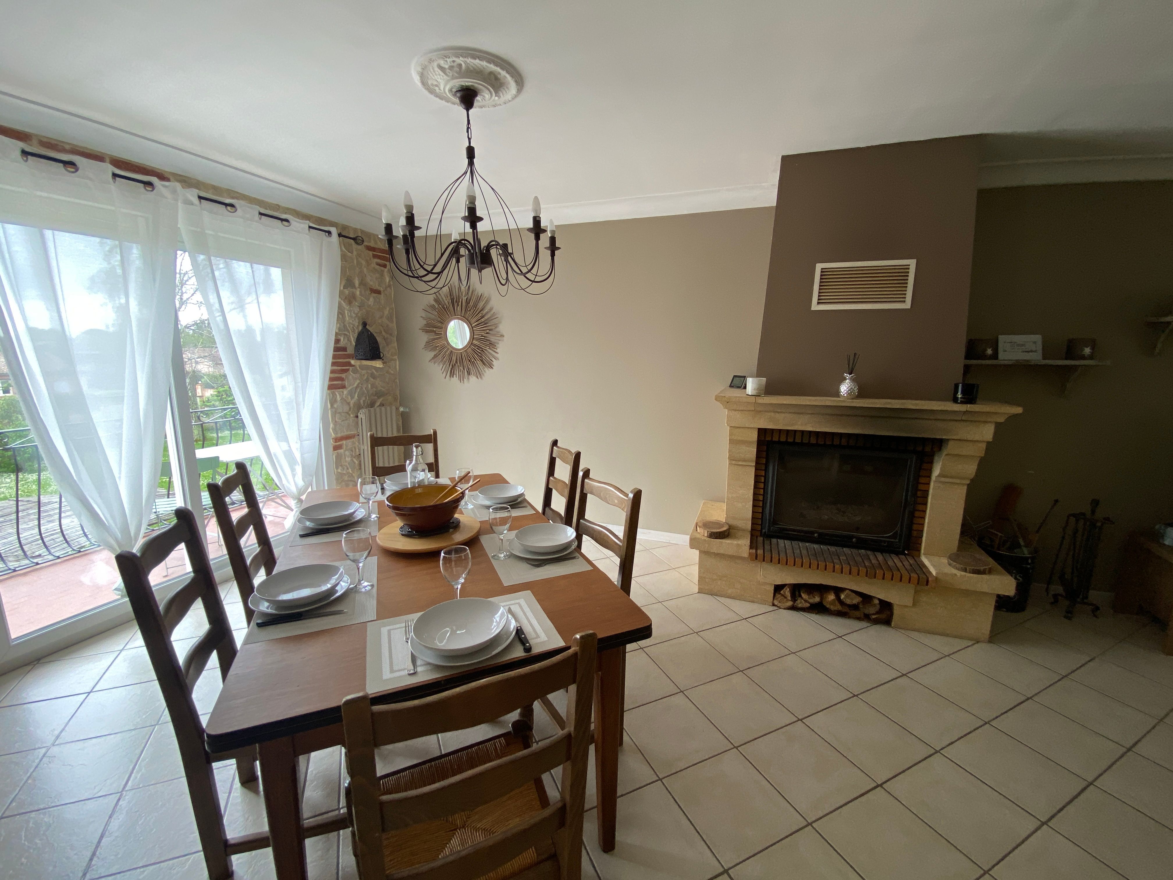 The accommodation comprises two interconnected areas, on the ground and ground floors, with all modern comforts. On the ground floor, there is a living room with a fitted kitchen (fridge-freezer, hob, oven, washing machine), table and chairs, corner sofa and TV. A bedroom (2 x 0.90cm beds), a bedroom (1 x 140cm bed) and a huge shower room with wc. Via an internal staircase and another external staircase, the 1st floor offers a large living room with fireplace (TV insert), corner sofa, dining area (table and chairs), and integrated kitchen area (cooking facilities, dishwasher, oven, microwave, fridge). Two bedrooms (2 single beds), one bedroom (1 double bed), shower room and separate wc. Balcony on first floor. Covered pergola with garden table and stools, string lights. Wifi throughout. Bed linen, towels and household linen provided and included in the price. Wood for the fireplace provided. Charcoal barbecue. Fenced garden with trees and gate. Bicycles can be stored at the rear.