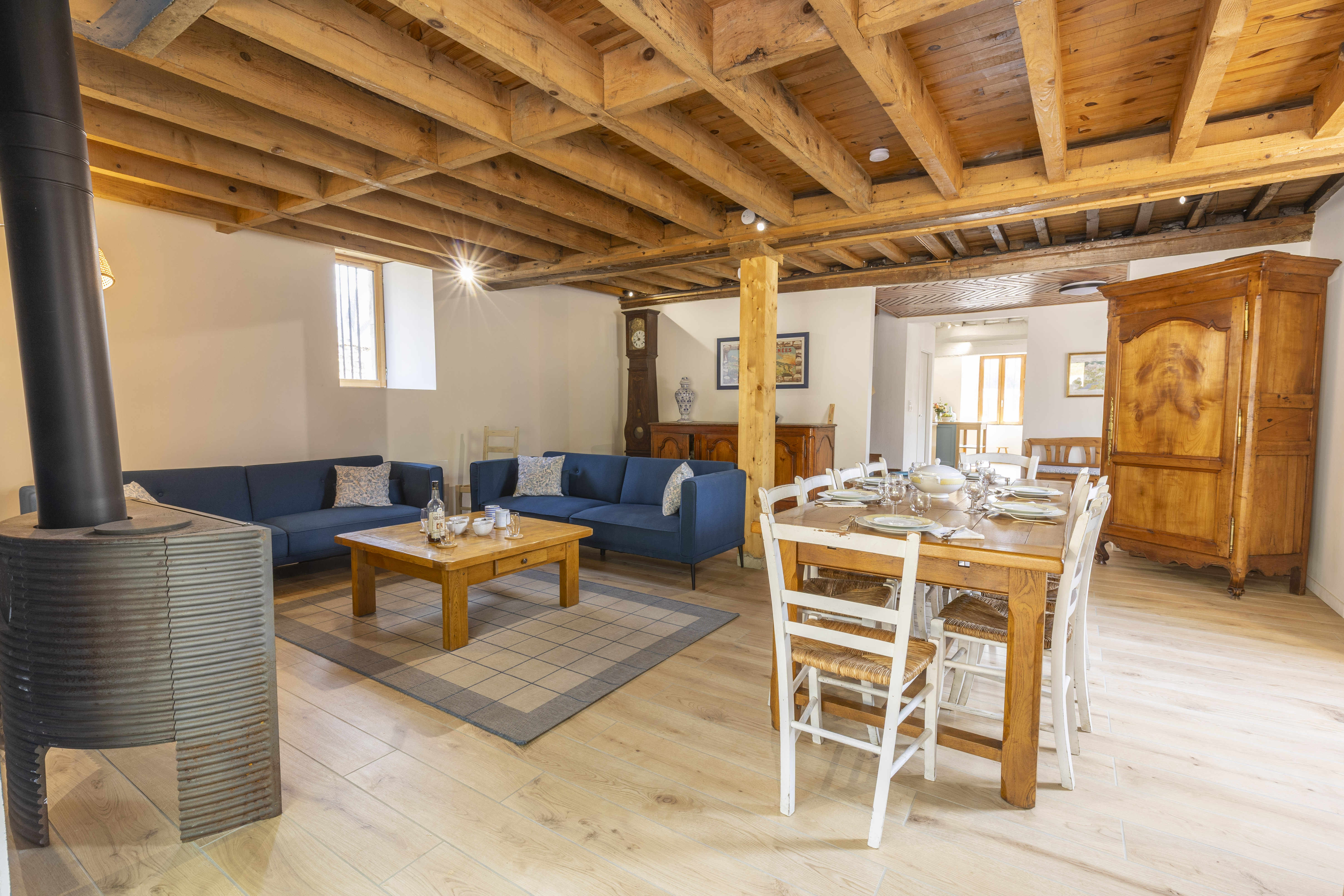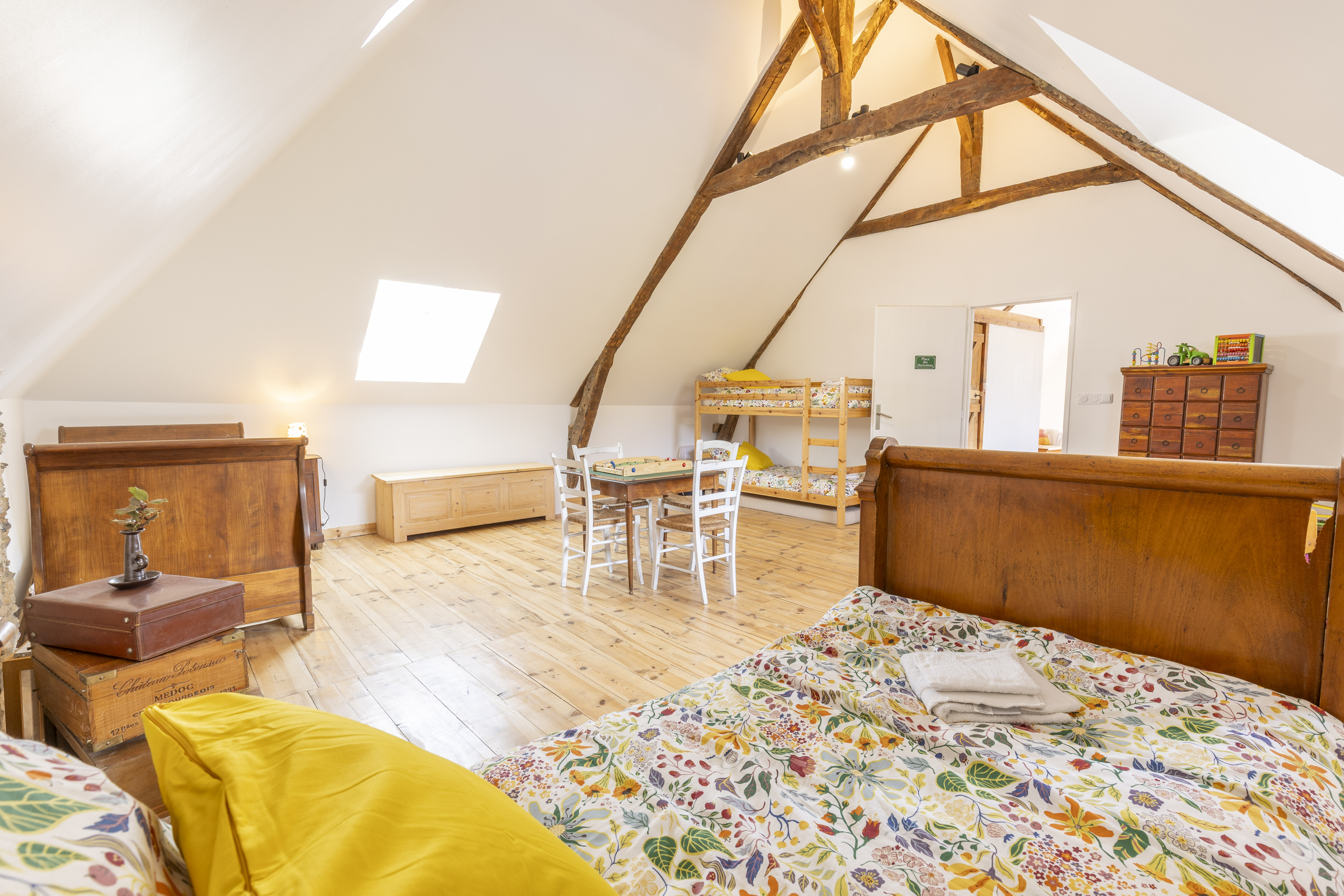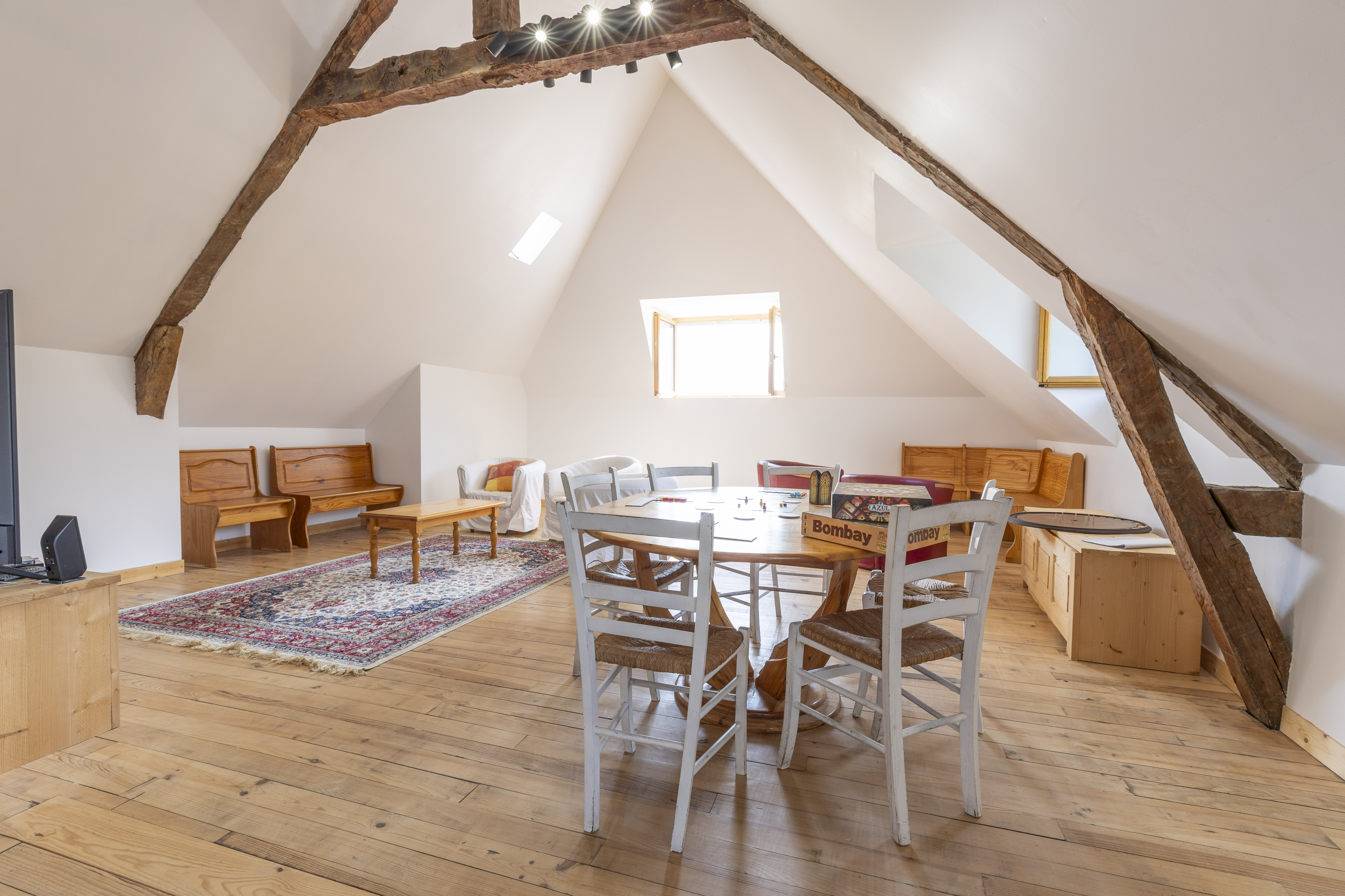 Grande maison de famille à étages, avec vue sur la montagne, comprenant : Au rez-de-chaussée : – une entrée avec placard, une buanderie avec WC – une grande cuisine équipée, avec une grande table – un coin salon/salle à manger équipé d’un poêle à bois et d’une autre grande table. Au 1er étage (5 chambres) : – une salle d’eau avec douche et WC – 1 grande chambre avec un lit en 160 – 3 chambres avec chacune un lit en 160 – 1 chambre d’enfant avec lit mezzanine en 90 et bureau dessous – une salle de bain avec baignoire – WC indépendant. Au second, grand grenier aménagé en : – 1 chambre dortoir avec 2 lits superposés et 2 lits en 90, jeux pour enfants et lit bébé – une grande salle de loisirs de 50m2, jeux de société, TV et fauteuils, table, chaises et une bibliothèque sur le palier. Extérieur : – un jardin clos avec terrasse, table et salon de jardin Parking public en face de la maison . Logement non-fumeur et sans animaux