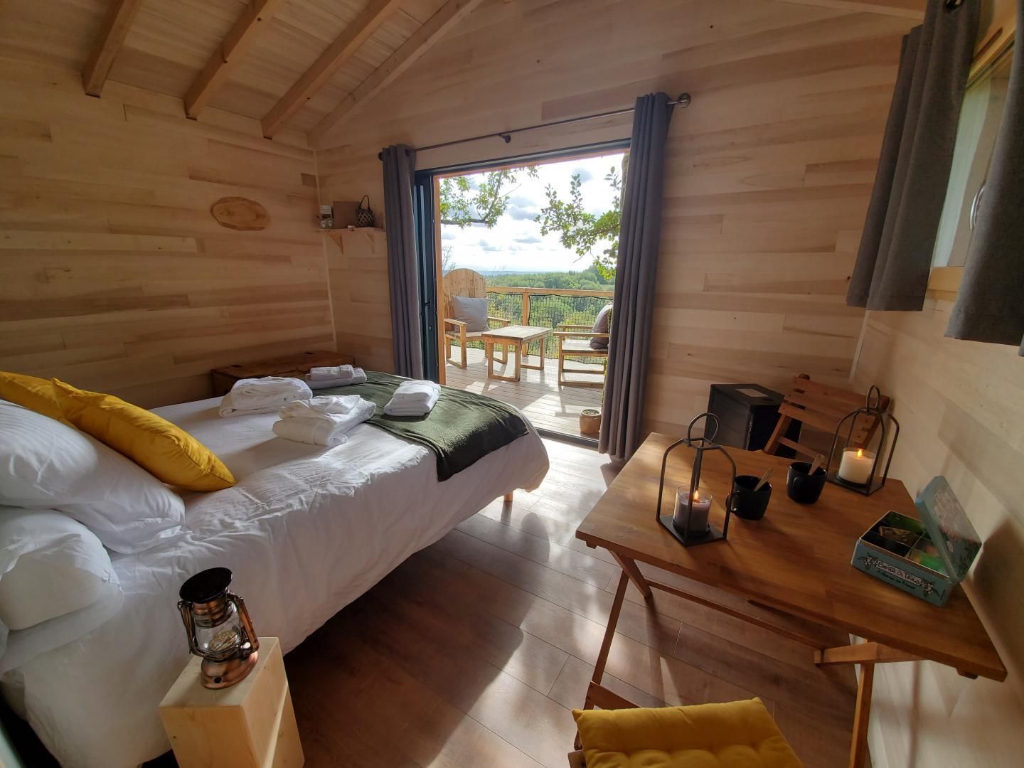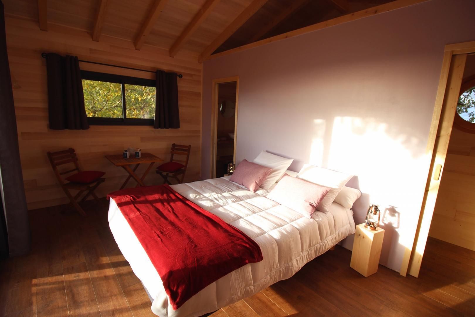 Each accommodation features a beautiful south-facing terrace, a queen-size bed with a direct view of the landscape through a picture window. For your comfort, a shower room and a separate toilet are at your disposal. The Orchis Spa cabin also offers a spa for ultimate relaxation. A delicious breakfast will be delivered to your terrace in a basket. The Ophrys Bulles cabin features a Nordic bath. To help you make the most of your stay, we offer gourmet baskets for two people: the “Aperitif Basket,” the “Luxury Aperitif Basket,” the “Tasting Basket,” and the “Musketeer Basket,” available by reservation. Ophrys Bulles cabin only: extra bed for a child €35.