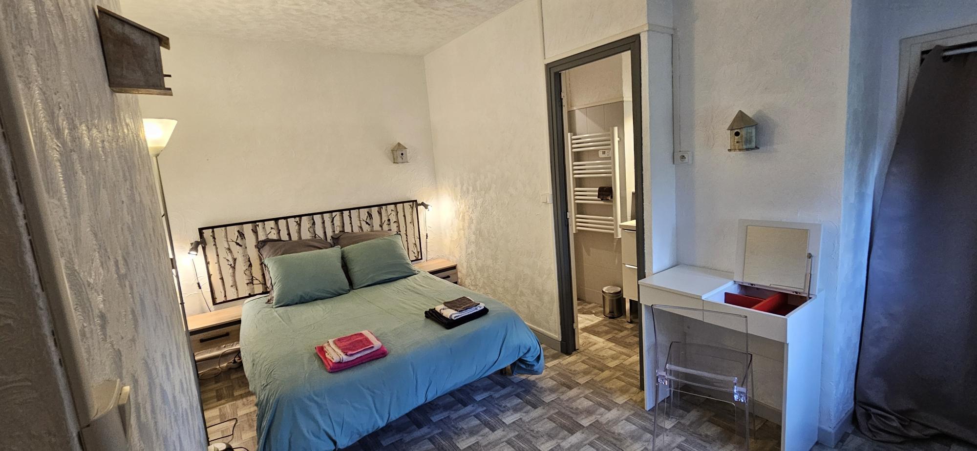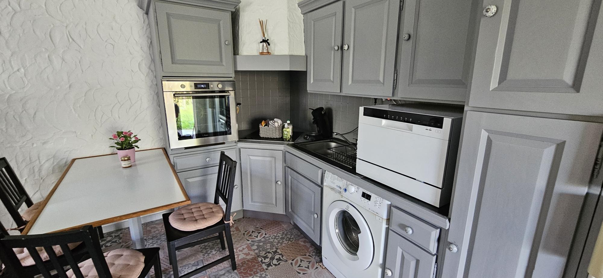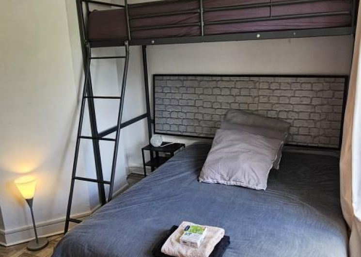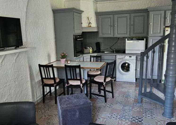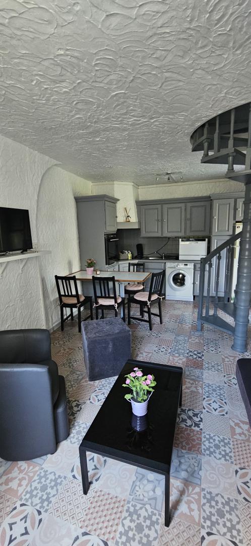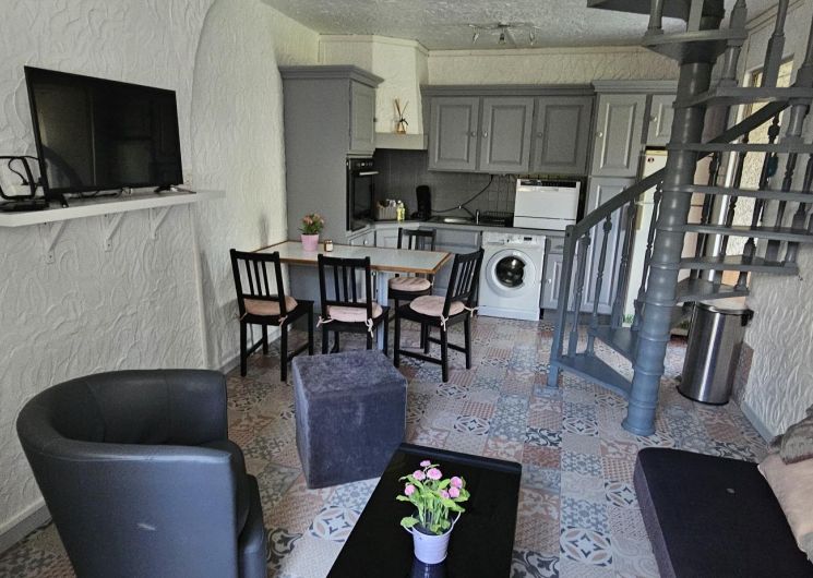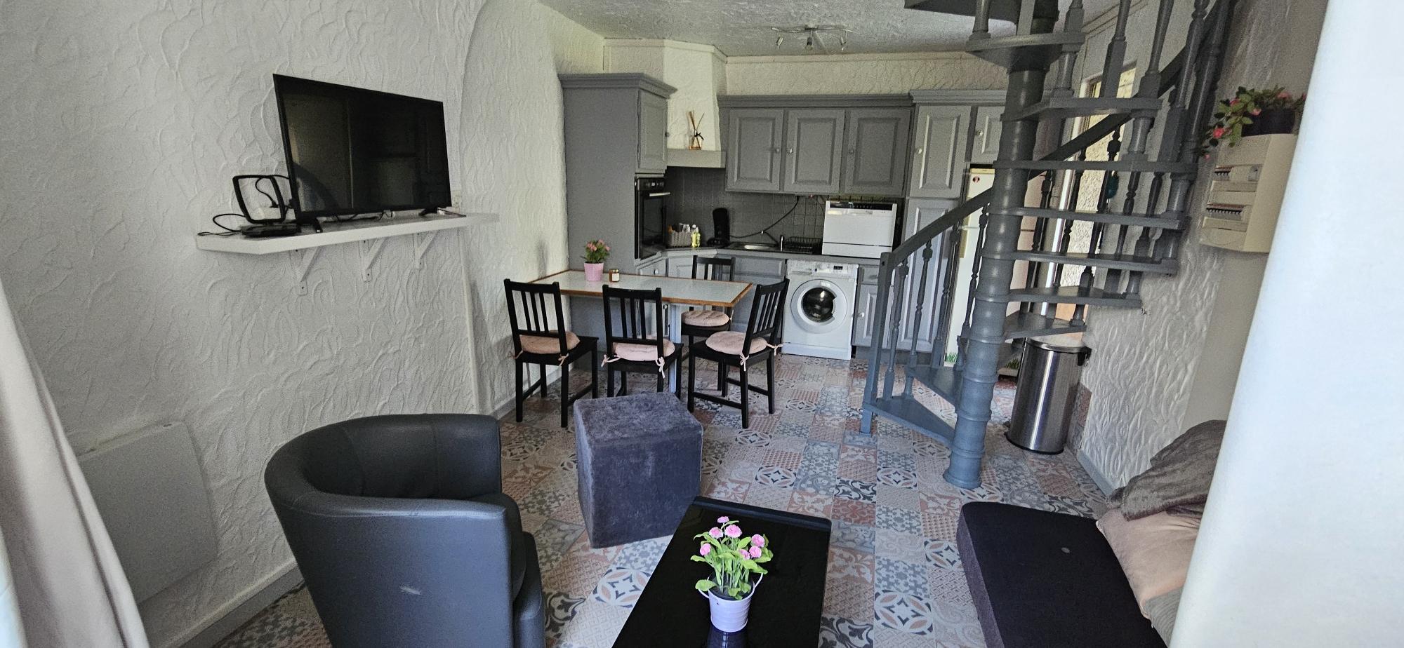 – On the ground floor, a cosy living area includes a lounge with TV, dining area, and fully equipped kitchen. A first bedroom (140×190 bed) with en-suite shower room and toilet is accessible directly from the outside, offering privacy and independence.