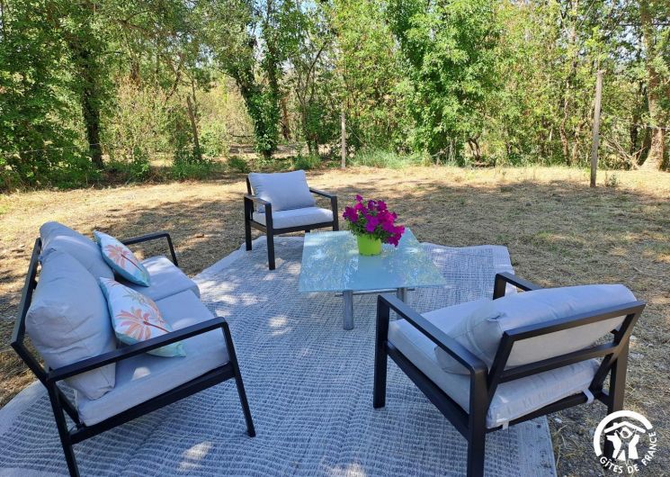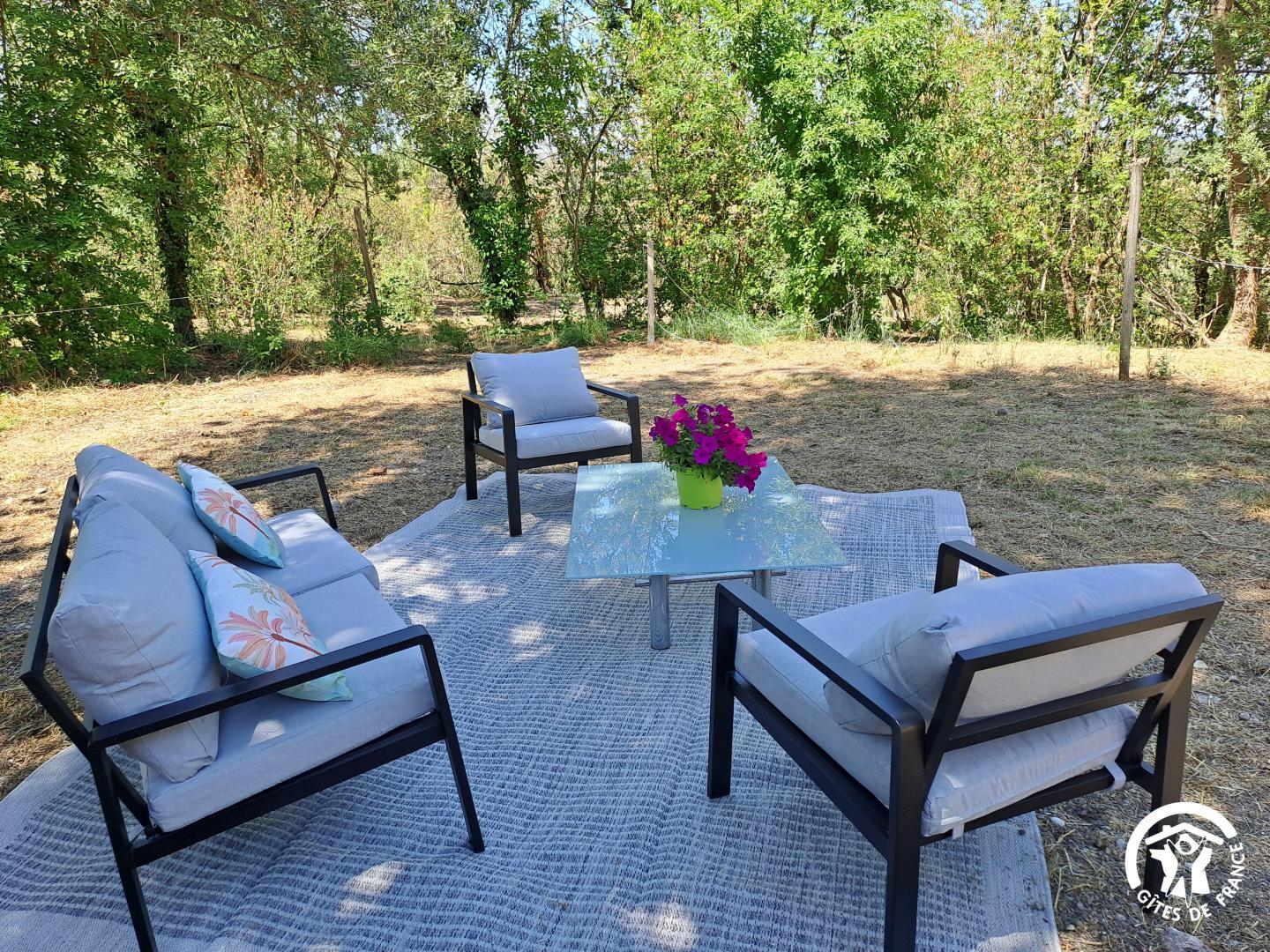 Outside, enjoy a shaded and leafy garden with a covered terrace, garden furniture, and access to the shared swimming pool (4x2m, 0.80m deep) — perfect for cooling off in summer.