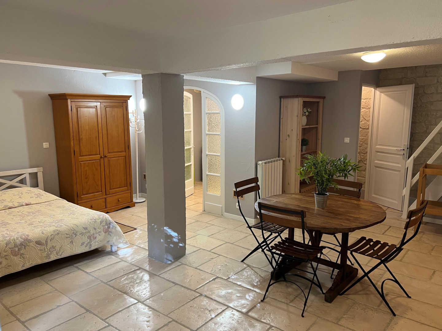 On accède à la partie inférieure par l’extérieur ou par un escalier meunier depuis l’entrée. Là, on trouve un studio (50m²) avec 4 couchages (un lit double en 140 et une chambre placard avec deux lits simples en 90 superposés), un coin cuisine, fauteuil, tv, une salle d’eau (deux douches et double vasque), wc.