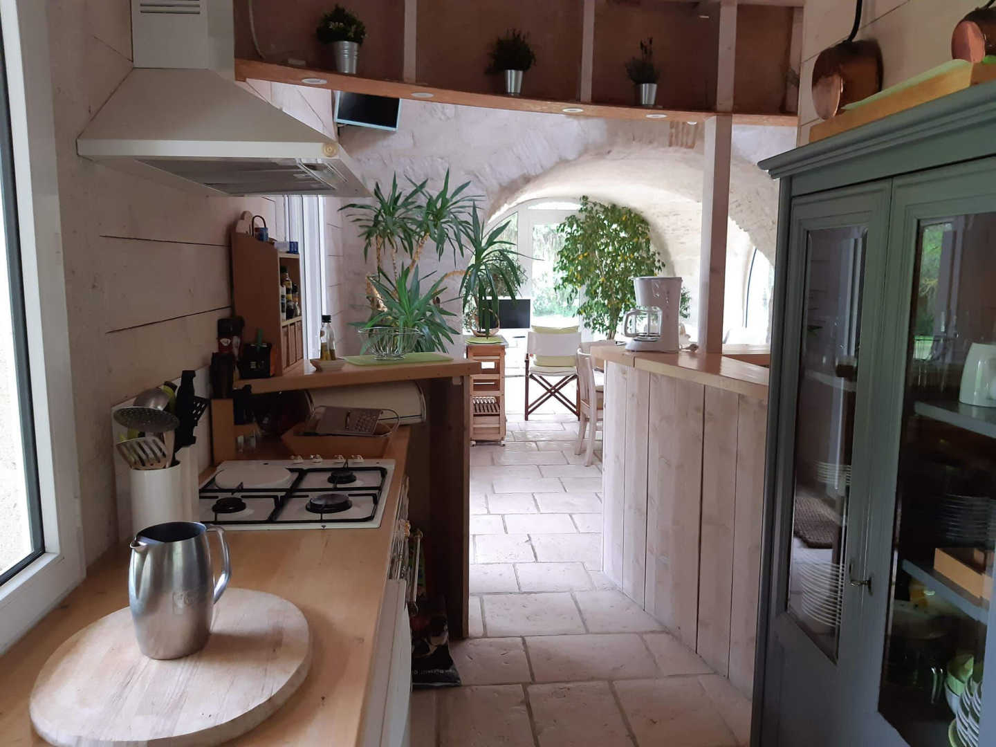 Rez-de-chaussée : pièce à vivre très lumineuse avec ses grandes baises vitrées en plein cintre, coin salon (canapés, tv), cuisine toute équipée, salle de bain (baignoire, double vasque), wc.