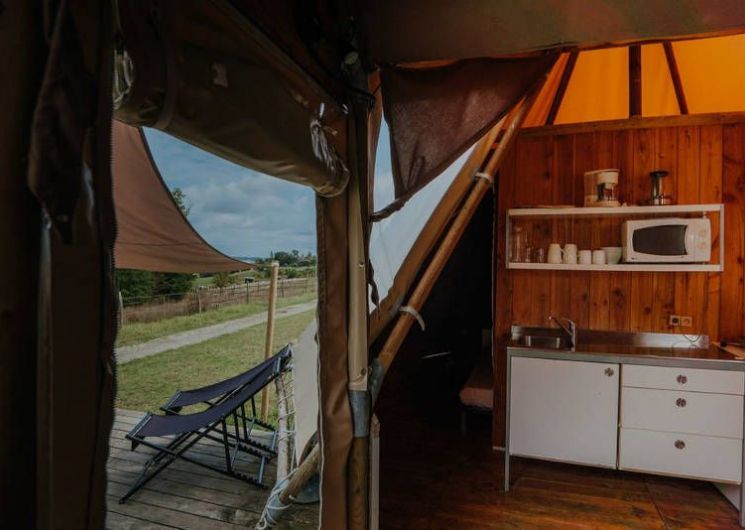 Pour votre confort, le Tipi Lodge est équipé d’un coin cuisine avec vaisselle, cafetière filtre, bouilloire, micro-ondes et réfrigérateur. Vous y trouverez également une salle de bain fonctionnelle avec douche, vasque et WC, pour des moments de détente en toute sérénité. Des couvertures polaires sont fournies afin d’assurer des nuits douces et agréables, et un essuie-verres, du produit vaisselle et une éponge sont à votre disposition pour simplifier votre quotidien.