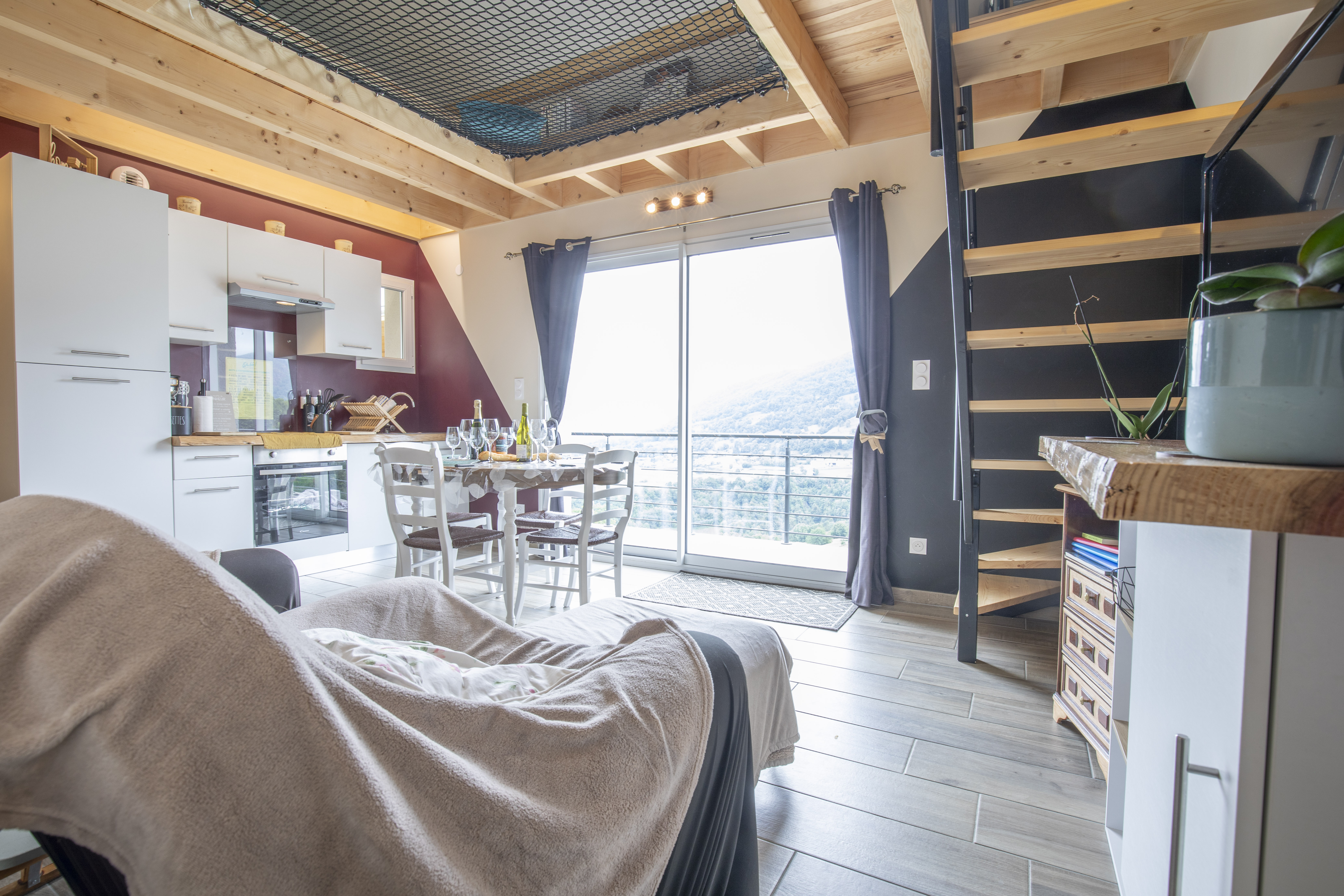Gîte de 47 m2 comprenant : – Une cuisine ouverte avec vue imprenable sur le Pic du Midi de Bigorre, le Cabaliros, la val d’Azun et les crêtes du Hautacam, – Deux chambres avec un lit en 160 et une chambre modulable avec un lit en 180 ou 2 lits en 90, – Une salle d’eau (douche), un wc indépendant. – Une mezzanine équipée d’un filet au dessus du séjour et un coin détente pour les enfants (coin lecture, jeux…). La location bénéficie d’une terrasse (plancha et salon d’extérieur, des transats et un spa), d’un parking privé et d’un local pour vos vélos et matériel de ski.