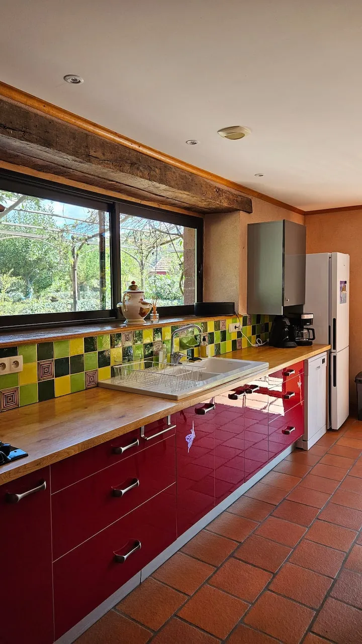 La cuisine est entièrement équipée, machine à café (Senseo), machine à café filtre, lave vaisselle, ustensiles de cuisine, four, réfrigérateur combiné, plaque de cuisson, lave linge, sèche linge, ..
