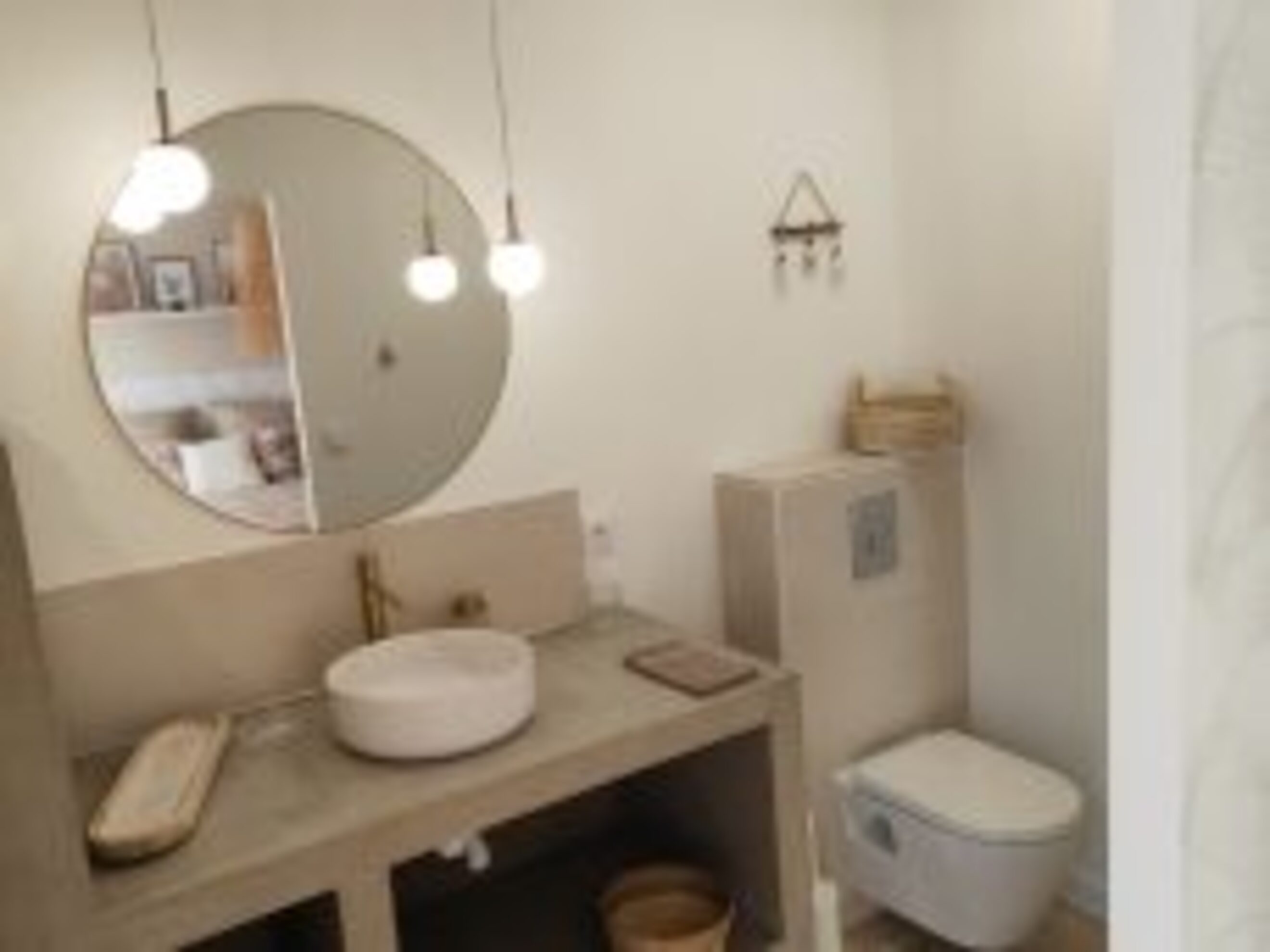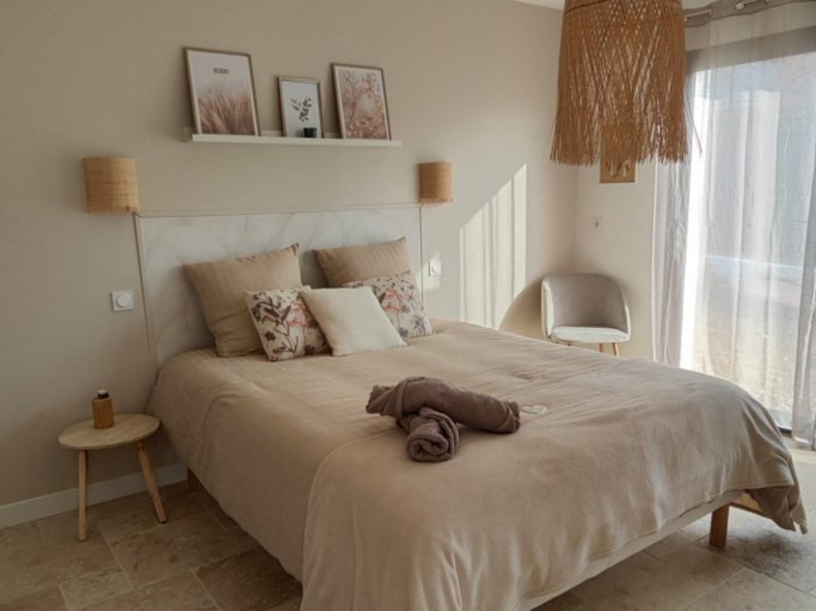 The Vénus room is a truly romantic cocoon in soft colors (sand, cream, white) with a queen-size bed and open bathroom with large shower and waxed concrete countertop. Ideal for a wedding night or a romantic getaway.