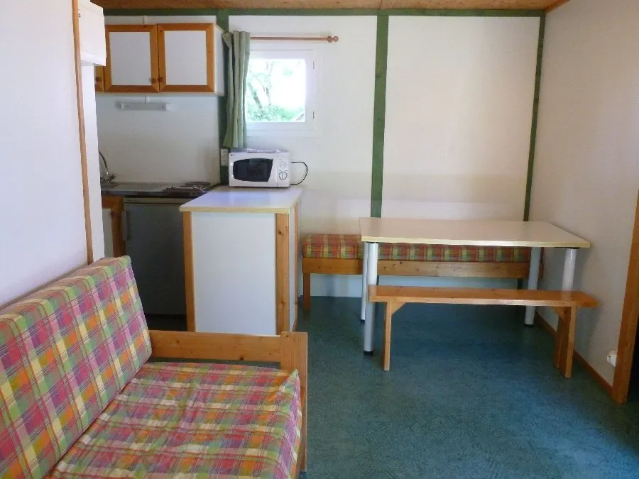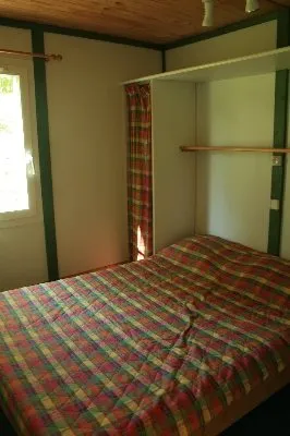 15 chalets for 4 persons : ground floor : kitchen / living rom (sofa bed), 2 rooms (1 bed 140cm – 2 beds 90cm), shower room, toilets, covered terrace, garden furniture, lawn, electric heating, car park. 1 chalet for disabled persons.