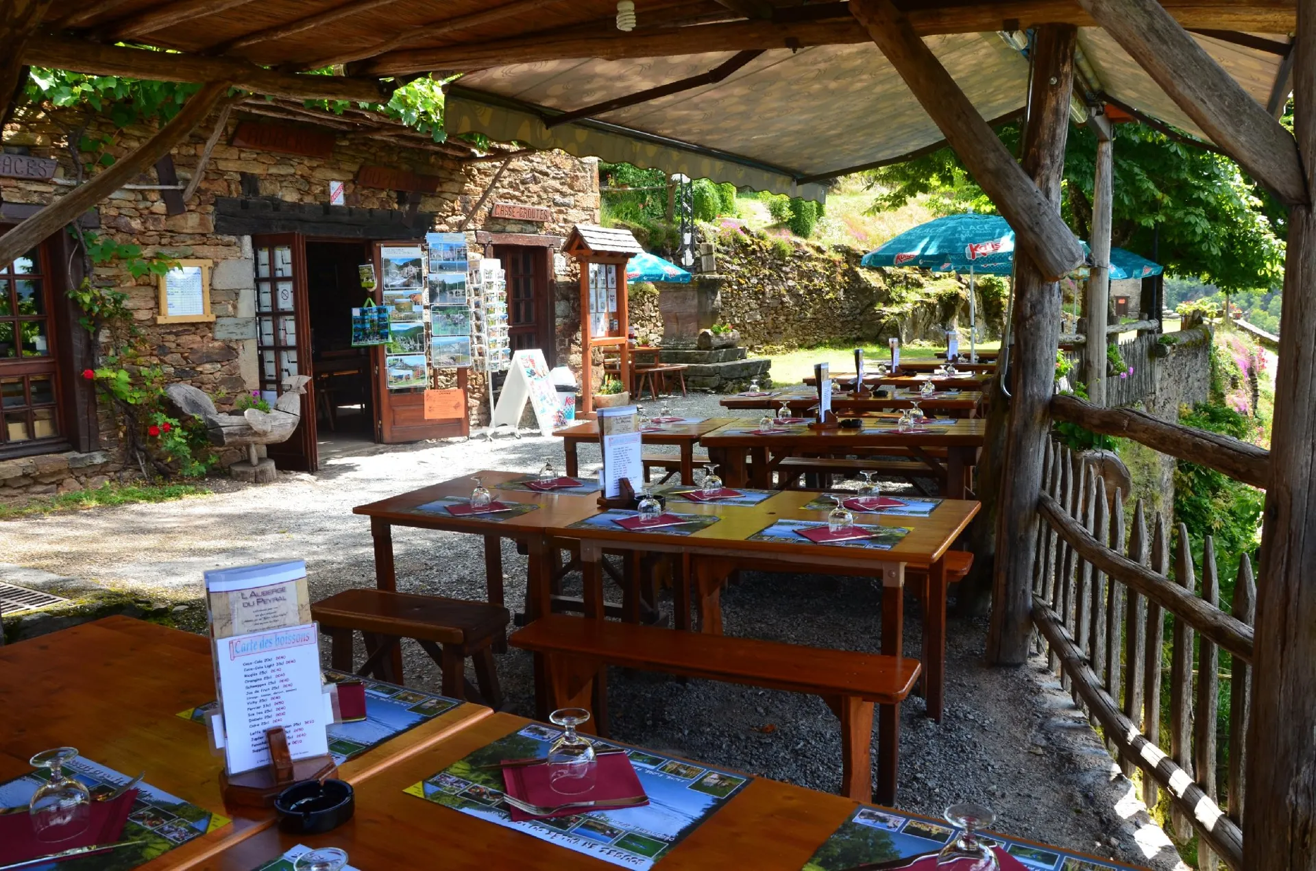 Brasserie traditionnelle. Terrasse panoramique sur le Lot, village fleuri, sentiers pédestres.