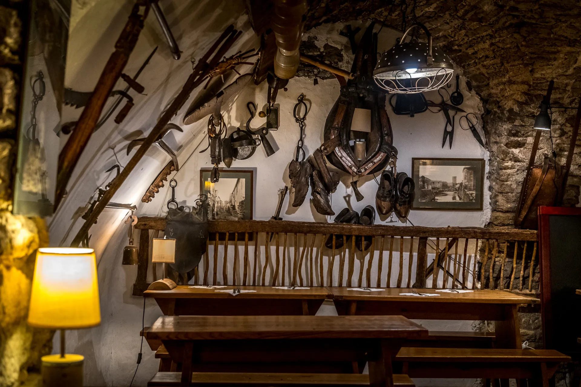 Installez-vous dans une ancienne bergerie voûtée, magnifiquement préservée, où les murs en pierre et le plafond en lauzes enveloppent les convives d’une atmosphère unique. Les longues tables en bois rappellent l’esprit des auberges d’autrefois. Autour de vous, sabots, outils agricoles, cuirs et objets anciens accrochés aux murs témoignent de la vie paysanne d’autrefois et confèrent au lieu un charme intemporel. Dès les beaux jours, installez-vous en terrasse sur la Rue Droite, la rue la plus vivante et incontournable de La Couvertoirade.