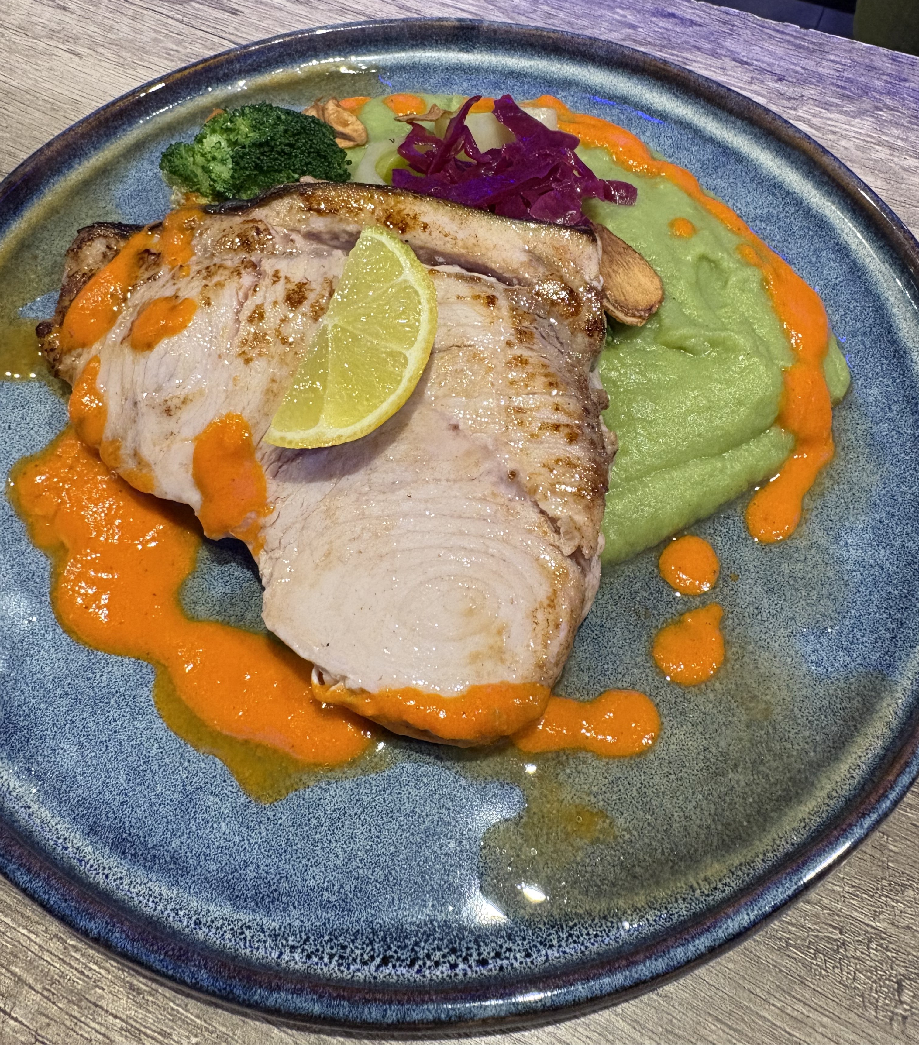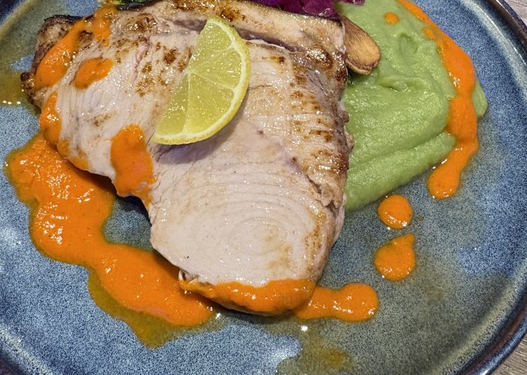 Terrasse ombragée. Produits de saison du marché ainsi que des commerçants locaux et producteurs.