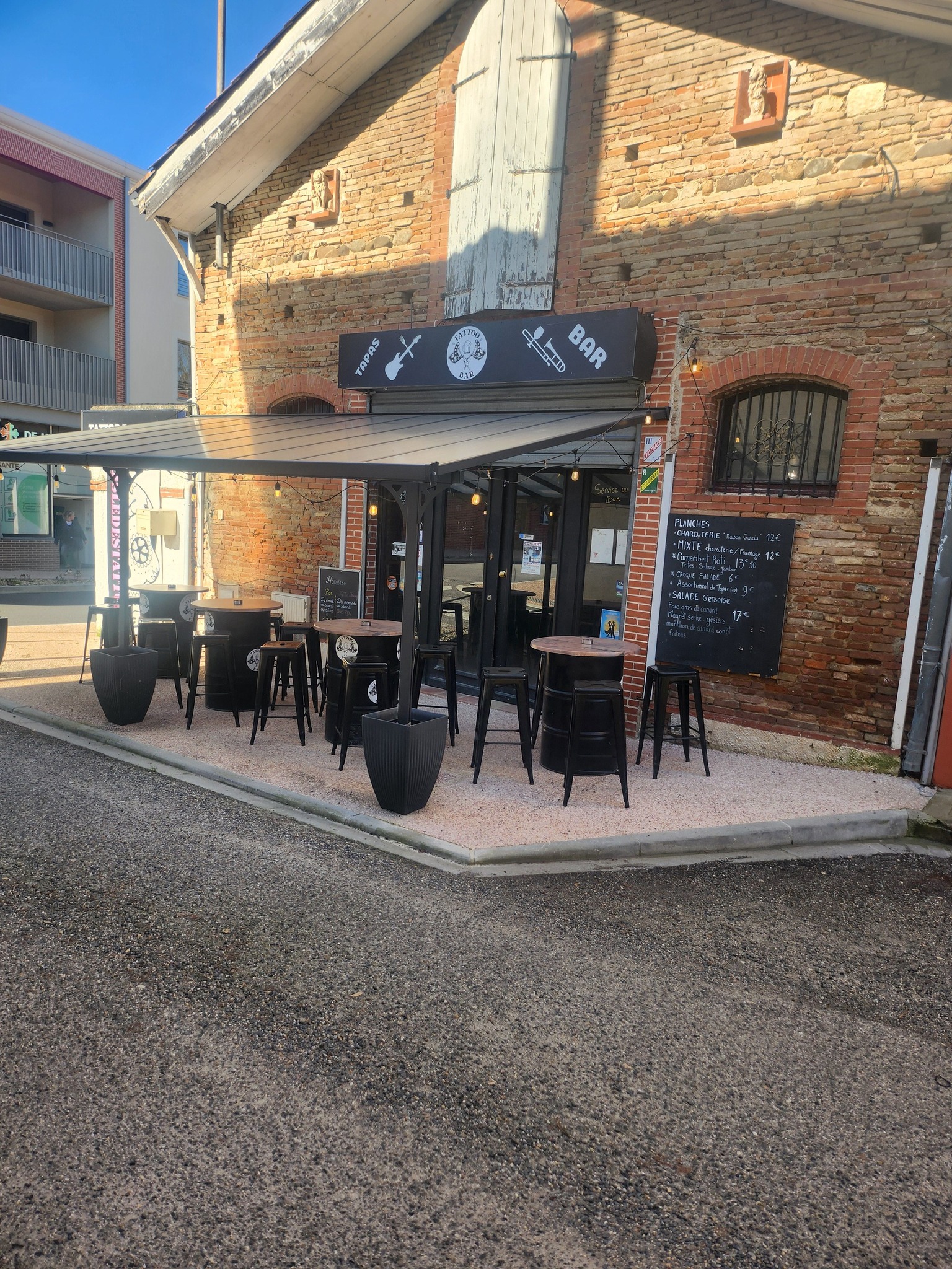 Le tattoo bar vous accueille autour dune sélection de vins, bières et grignotages (planche charcuterie/fromage, camembert rôti, salade gersoise, assortiment de tapas, etc).
