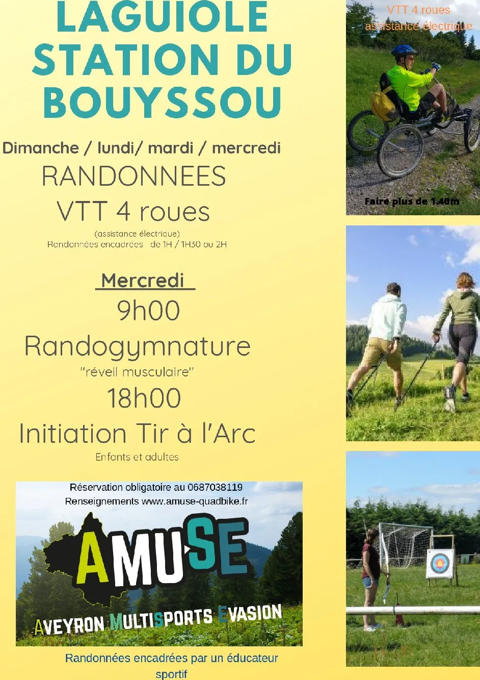 – L’activité Quadbike (VTT à 4 roues), maximum 5 personnes, durée 1h- 1h30 ou 2h. Un moyen de randonner au travers des grands espaces, et des beaux paysages que l’on trouve en Aveyron. Une assistance électrique qui permet de limiter les efforts. Pas de bruit pour être au plus proche de la nature.