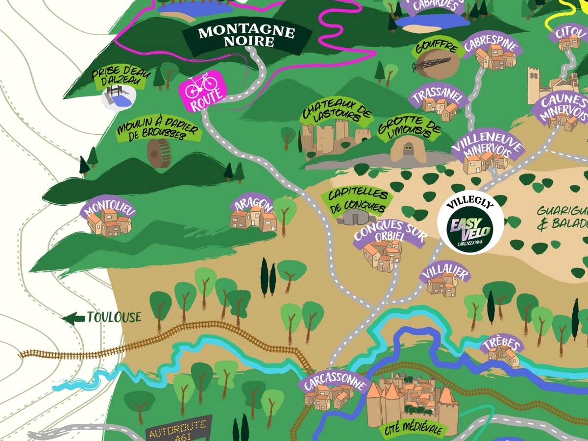 Easy Vélo Carcassonne propose de la location de vélos électriques sur Villegly, Carcassonne et ses alentours, sur site à Villegly ou en livraison sur les lieux de vacances, sites de pratique et autres. Sont proposés : des VTC électriques femmes et hommes, des VTT électriques mixtes et enfants, des gravels/routes. La location comprend : Vélo Giant haut de gamme, confortable et performant, au moteur puissant et économe, autonomie incroyable. Kit de réparation avec pompe, casque, antivol, câble de recharge du téléphone pouvant être raccordé au vélo. Sur demande et dans la limite de nos stocks : GPS Garmin avec parcours pré-enregistrés ou élaborés selon l’envie. Le village de Villegly est le lieu de départ de nombreuses balades : chemins, routes, VTT, vers la route du Pic de Nore (point culminant de la Montagne noire !) et à seulement quelques kilomètres du canal du Midi … Des parcours sont proposés. Lancez le GPS et partez à la découvertes de nos coins préférés !