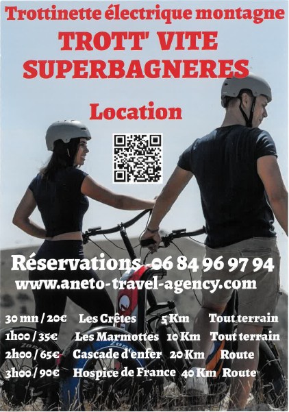 The all-terrain electric scooter designed for thrill-seekers and performance enthusiasts. Hire the scooter in Superbagnères and take one of the 4 circuits on offer on your own: All-terrain: les Crêtes, les Marmottes. Road: Cascade d’Enfer, Hospice de France.