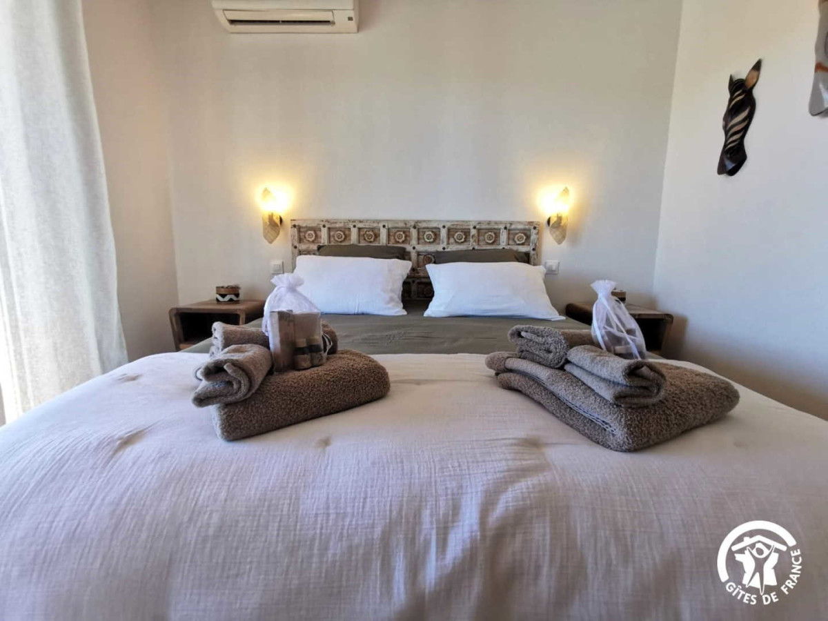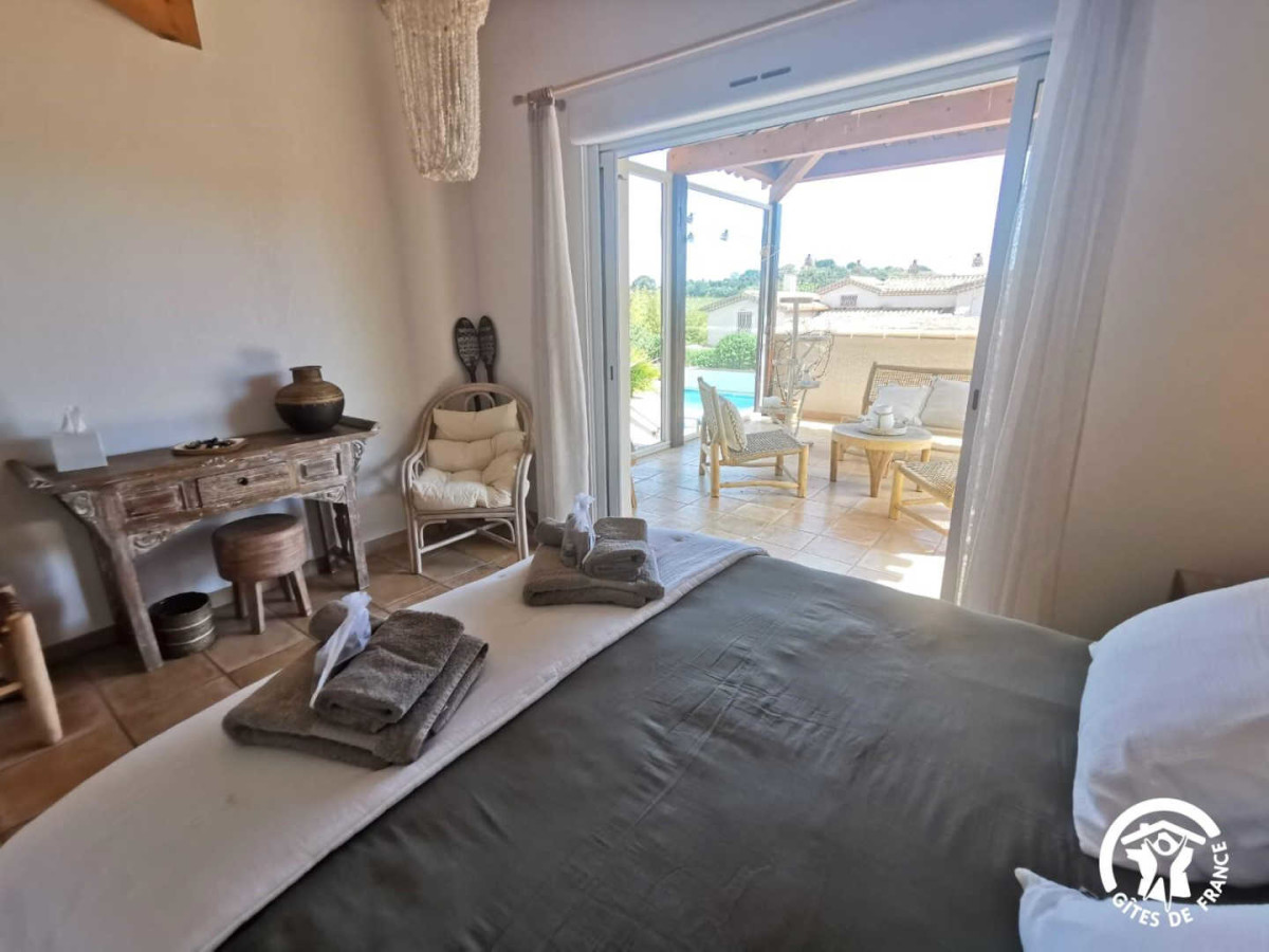 La chambre d’hôtes possède une pièce commune dans la maison des propriétaires avec une grande table à manger pour éventuellement prendre vos petits-déjeuners et un espace salon pour vous relaxer dans un des canapés. A l’extérieur, vous pourrez profiter d’une grande piscine commune avec chaises longues, pour se rafraichir et profiter du soleil de l’Hérault, toujours dans le calme et la sérénité. Vous pourrez également vous détendre dans le grand jardin du Bonheur Dezange, aménagé par vos hôtes pour passer d’agréables moments en famille ou entre amis. Le domaine possède aussi un salon de jardin extérieur pour pouvoir prendre son petit-déjeuner lorsque le temps le permet ! Attractions touristiques : Explorez le centre historique de Pézenas, où les ruelles pavées vous guideront à travers une myriade de boutiques artisanales, de galeries d’art et de charmants cafés. Imprégnez-vous de l’atmosphère médiévale de la ville tout en découvrant les hôtels particuliers du XVIIe siècle et la Maison de Molière, où le célèbre dramaturge résidait autrefois. Visitez par exemple le Musée Vulliod Saint-Germain et ses belles collections de mobilier et d’œuvres d’art des XVIIème et XVIIIème siècles. Poursuivez votre exploration à l’Étang de Thau, situé à proximité, pour une escapade naturelle. Découvrez l’écosystème fascinant de cet étang salin, célèbre pour ses parcs à huîtres et ses flamants roses majestueux. Explorez les vignobles environnants et plongez dans l’art de la vinification lors d’une visite des domaines viticoles locaux. Laissez-vous envoûter par les saveurs des vins du Languedoc, et peut-être ramenez-vous une bouteille en souvenir de votre séjour. Prenez la route vers la côte méditerranéenne, à moins de 20 km, pour découvrir les plages de sable fin de Marseillan et du Cap d’Agde. Profitez du soleil méditerranéen et laissez-vous bercer par le murmure des vagues. – Au calme, venez séjournez dans la chambre Savane pour deux personnes qui possède un lit Queen Size (160 x 200 cm), une armoire avec penderie ainsi qu’une salle d’eau privative avec douche et WC. Vous profiterez également avec la chambre d’une terrasse privée de 16 m² avec fauteuils confortables pour profiter du soleil de l’Hérault, avec vue sur la piscine. Cette chambre est séparée de la chambre Lagon par une pièce commune de 15m, où vous pourrez prendre vos petits-déjeuners, et qui possède des équipements communs : bouilloire, machine à café, réfrigérateur, micro-ondes…