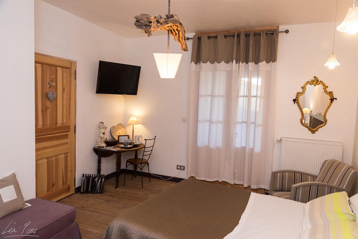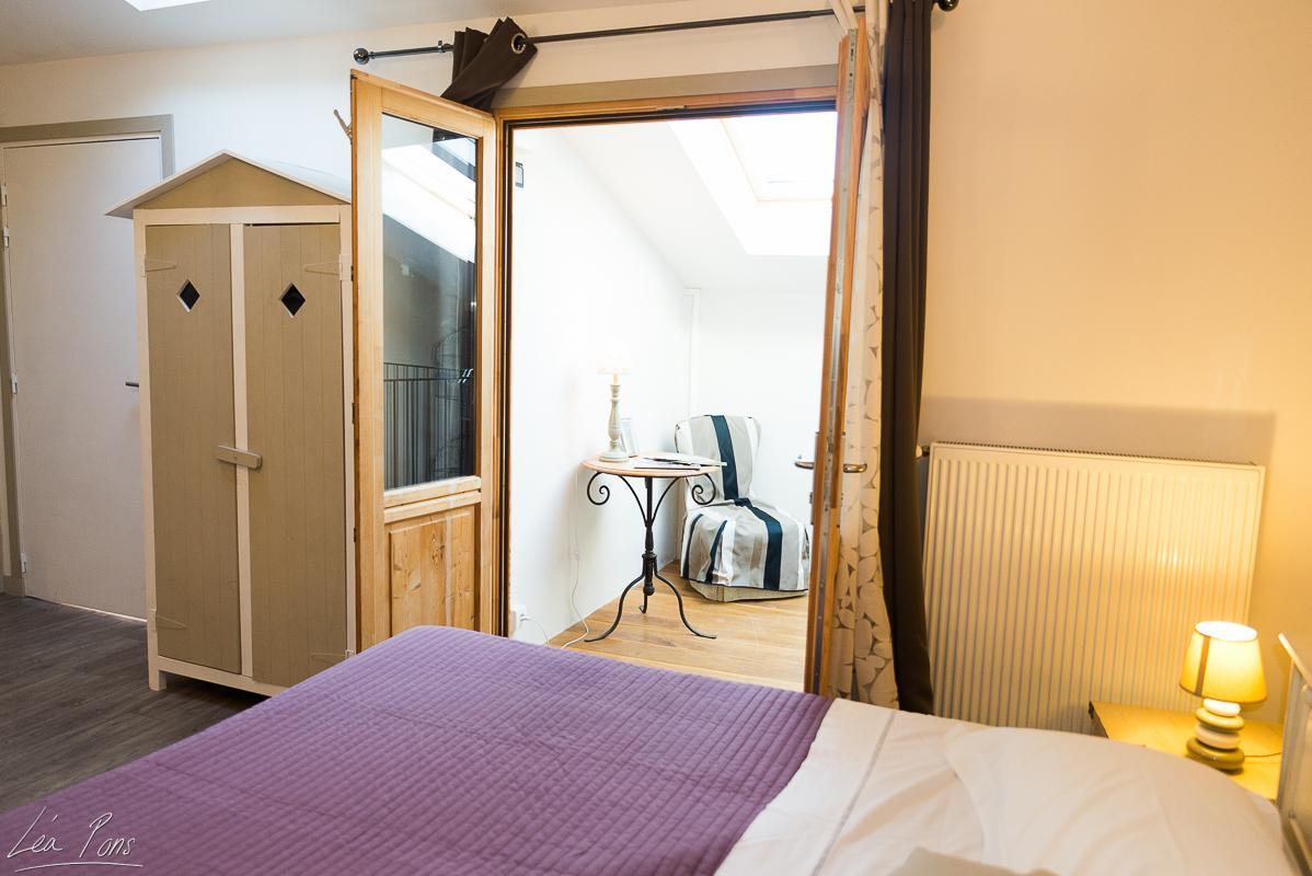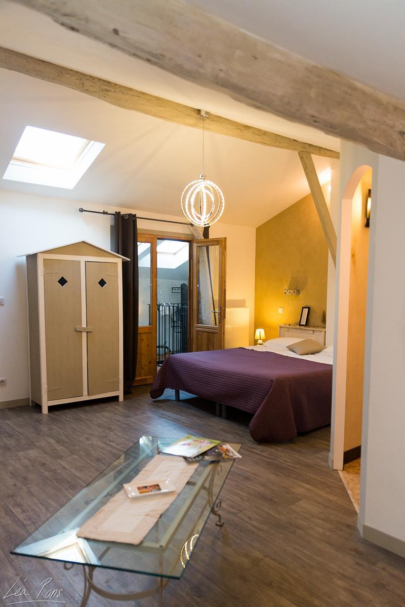 chambre « Marquise de Panat » avec 1 lit 140, salle d’eau et WC privatifs, terrasse intérieure aménagée en coin repas avec point d’eau et micro-ondes.