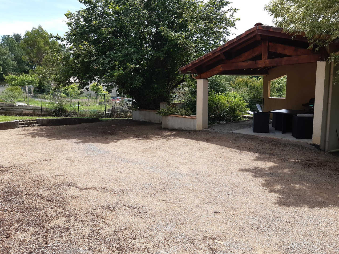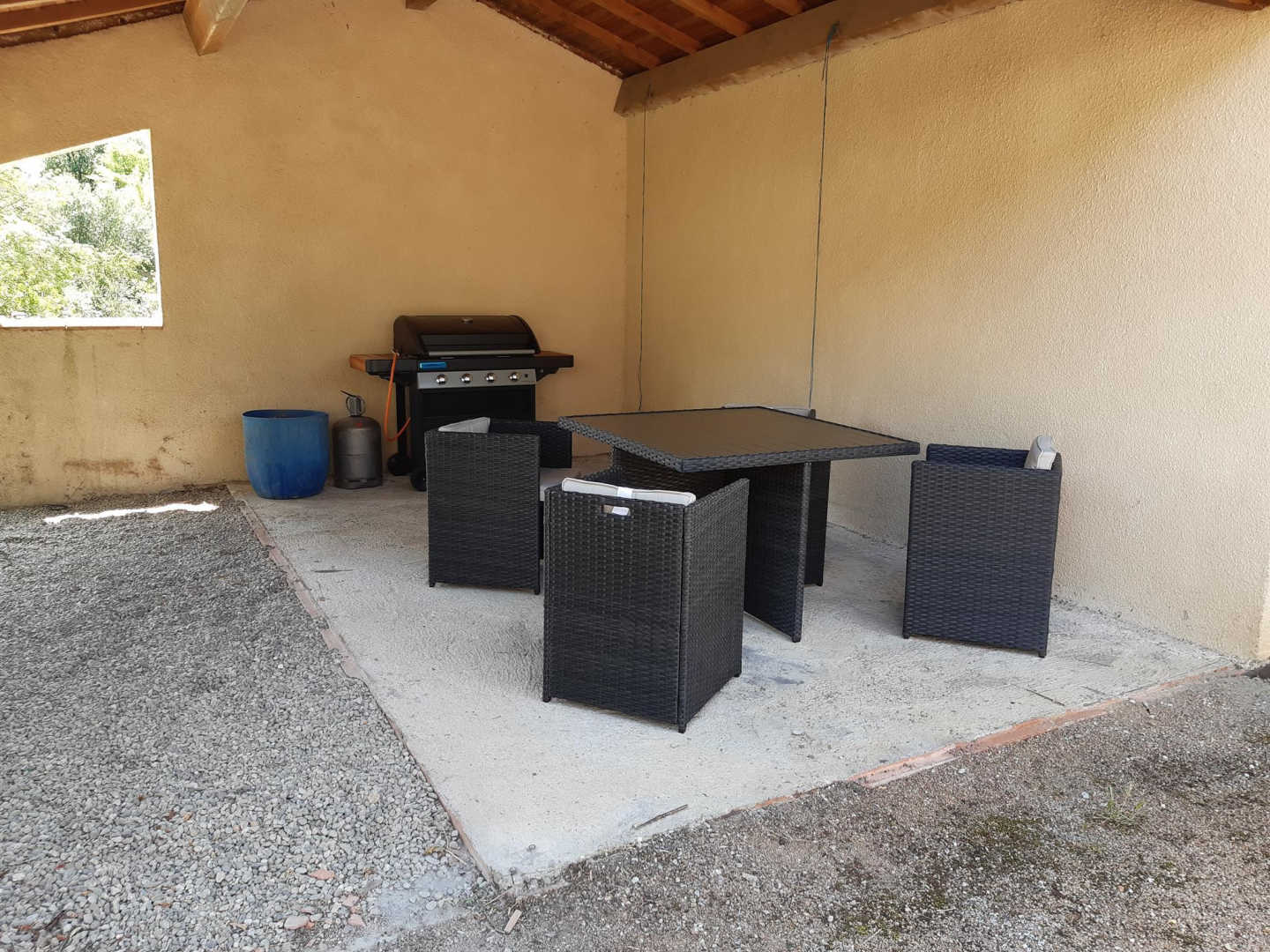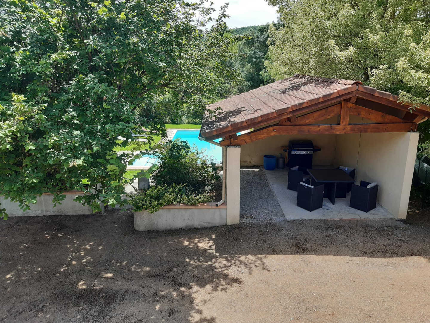 Terrasse avec vue sur la piscine, coin repas extérieur sous abri avec salon de jardin, plancha