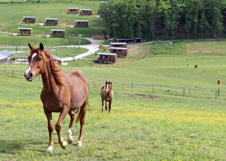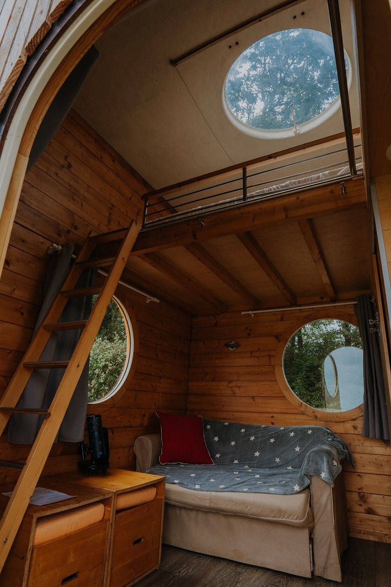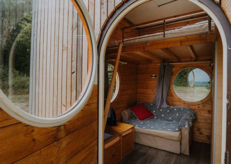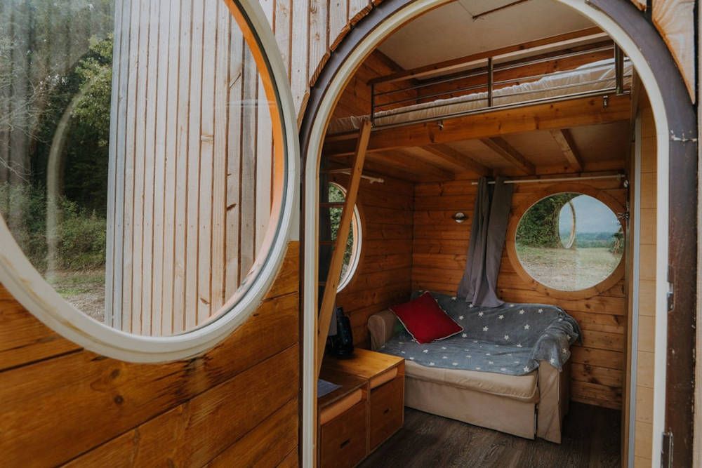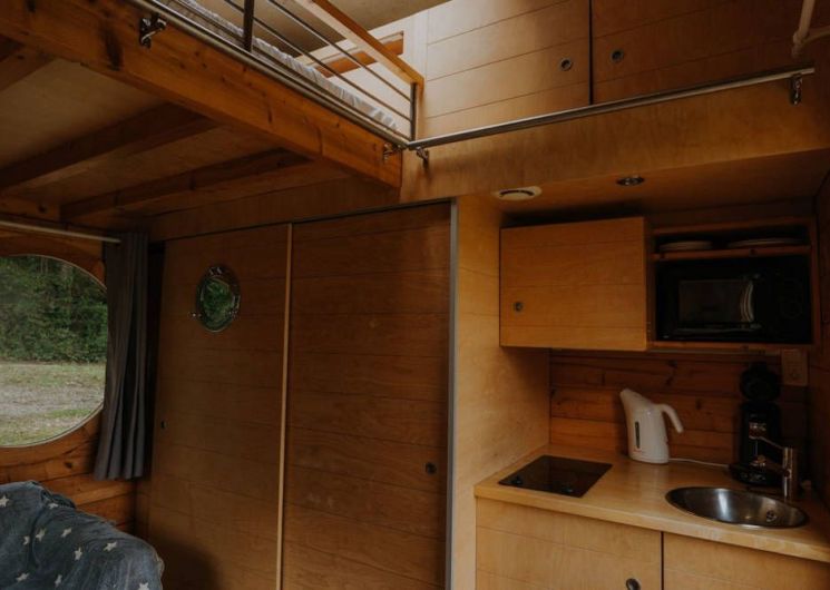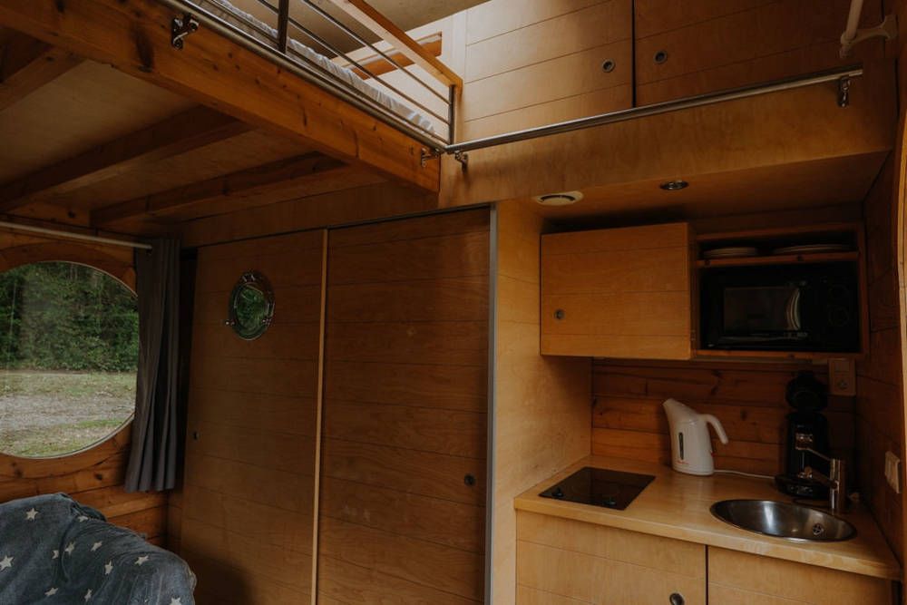 À l’intérieur, profitez d’un coin cuisine complet avec micro-ondes, réfrigérateur, plaques de cuisson, cafetière Senseo et vaisselle, ainsi que d’un grand lit de 160 cm, d’un canapé douillet et d’une salle de bain avec douche et WC.