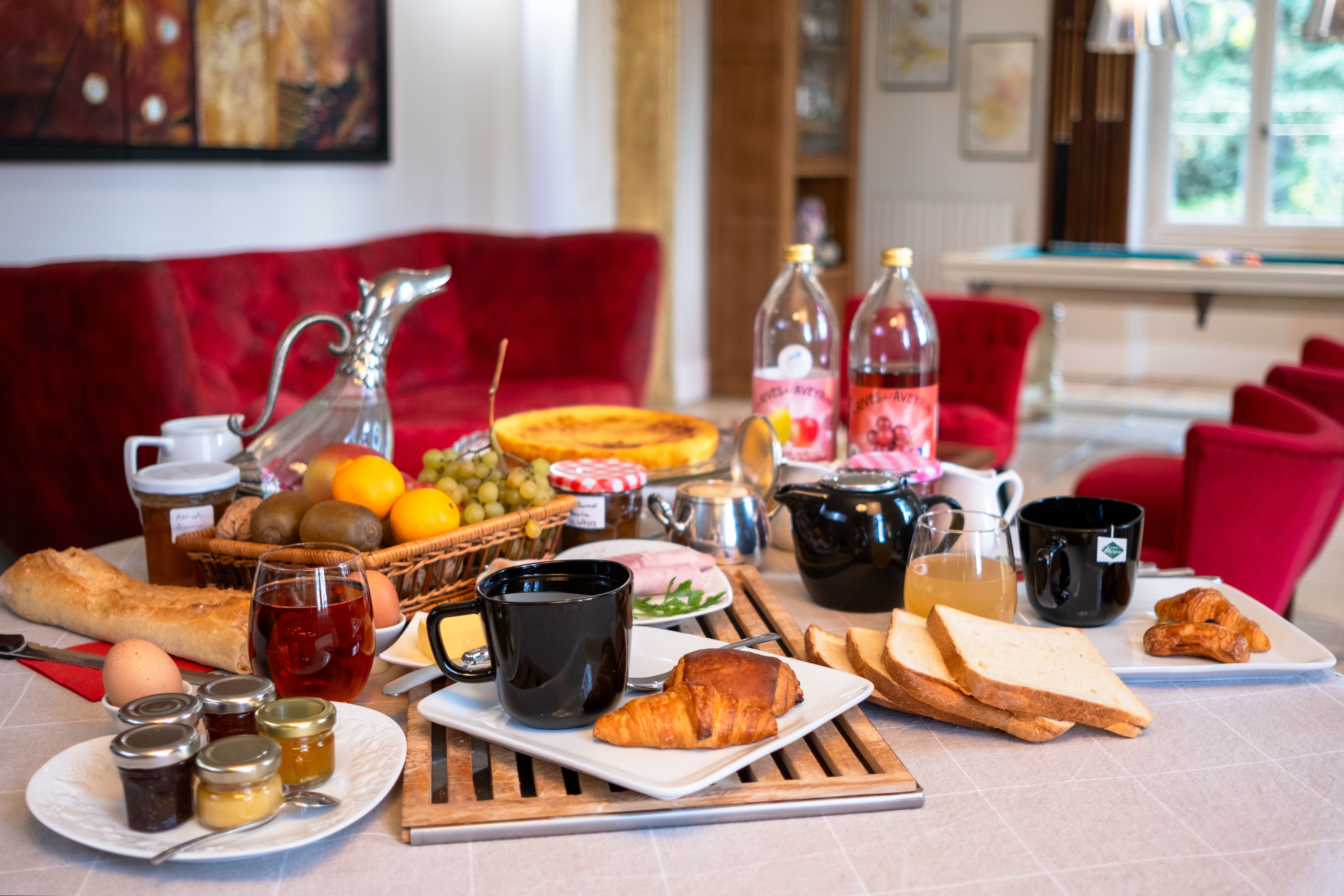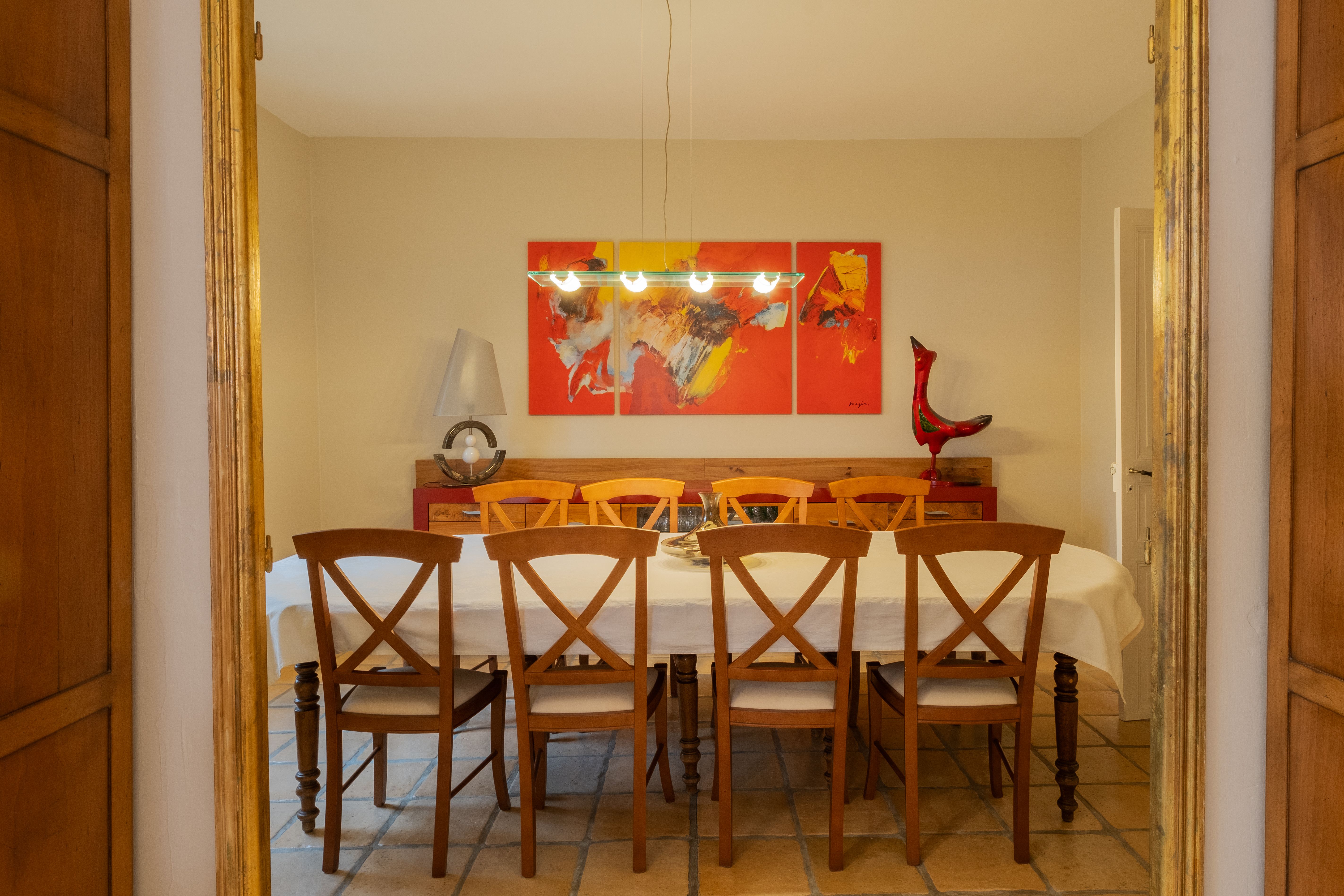 As soon as you enter, the long corridor sets the tone: in a sublime red, you discover the lounge reserved for guests, with sofa, armchairs and billiards table, then the dining room for the table d’hôtes and breakfasts when it is not possible to use the large adjoining terrace covered by wisteria. There is a public toilet on the ground floor.