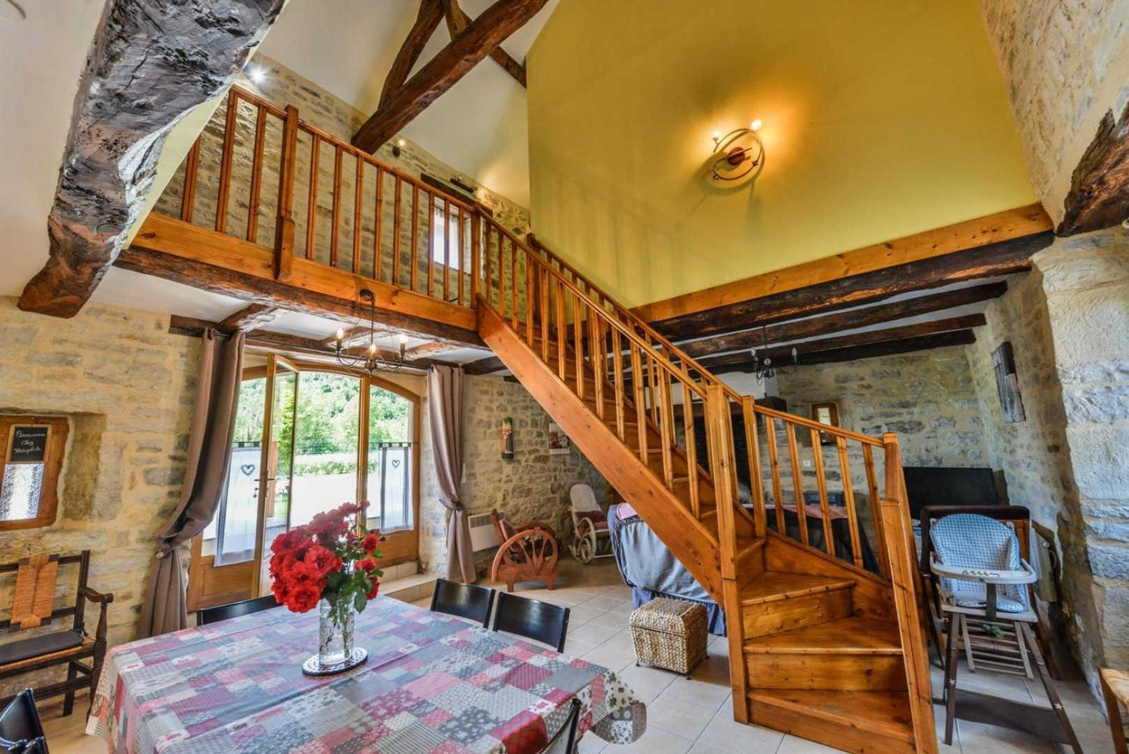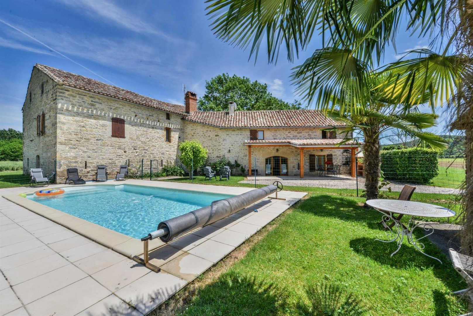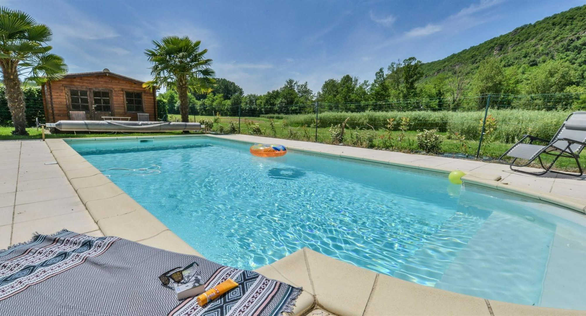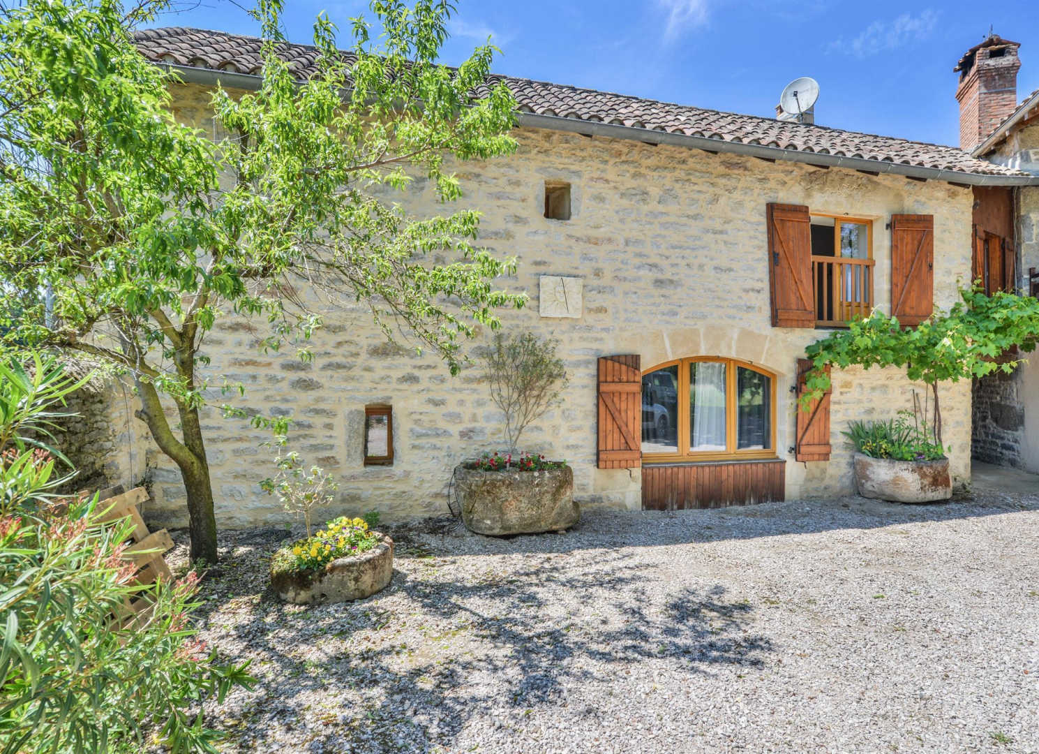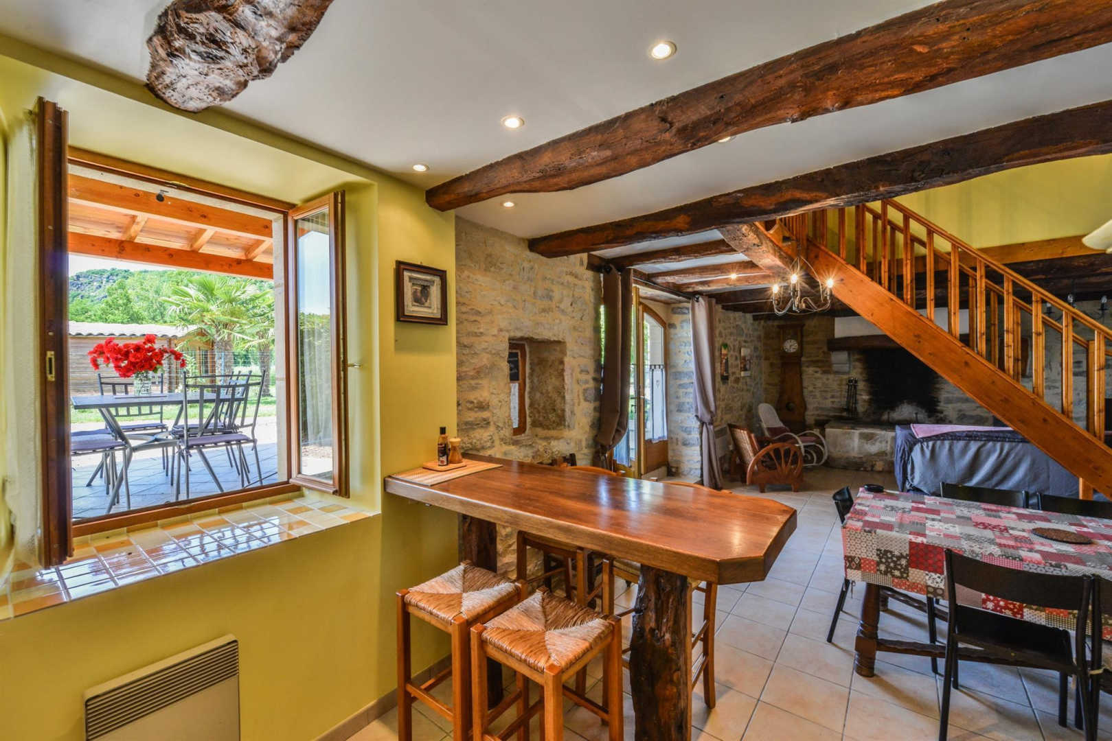 On the banks of the Aveyron, the house is facing the limestone cliffs.