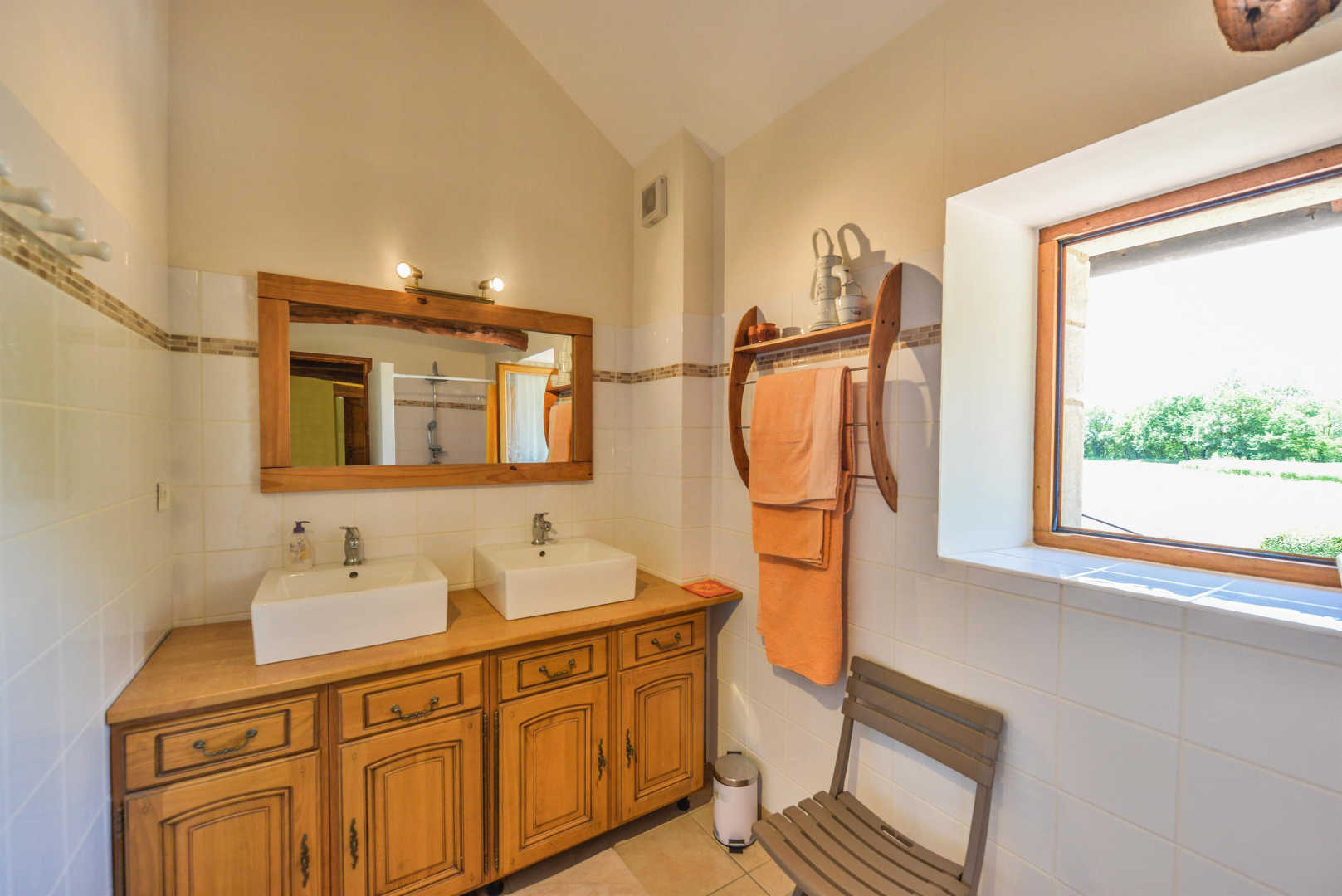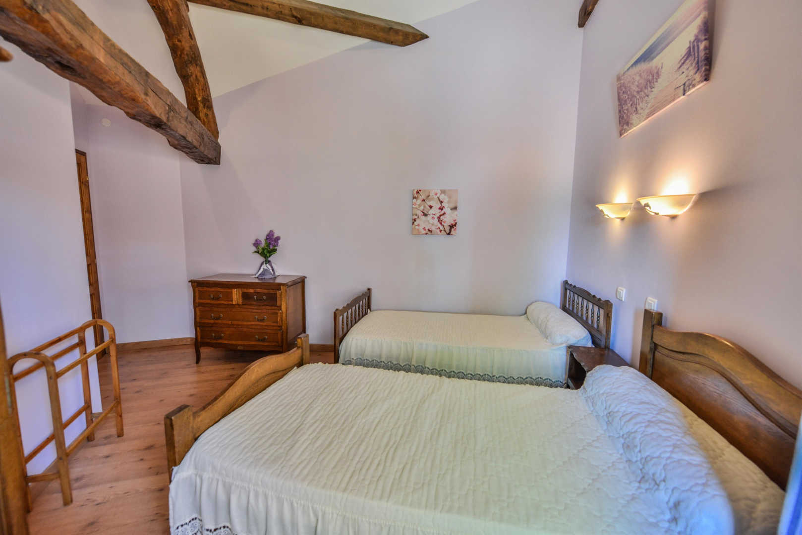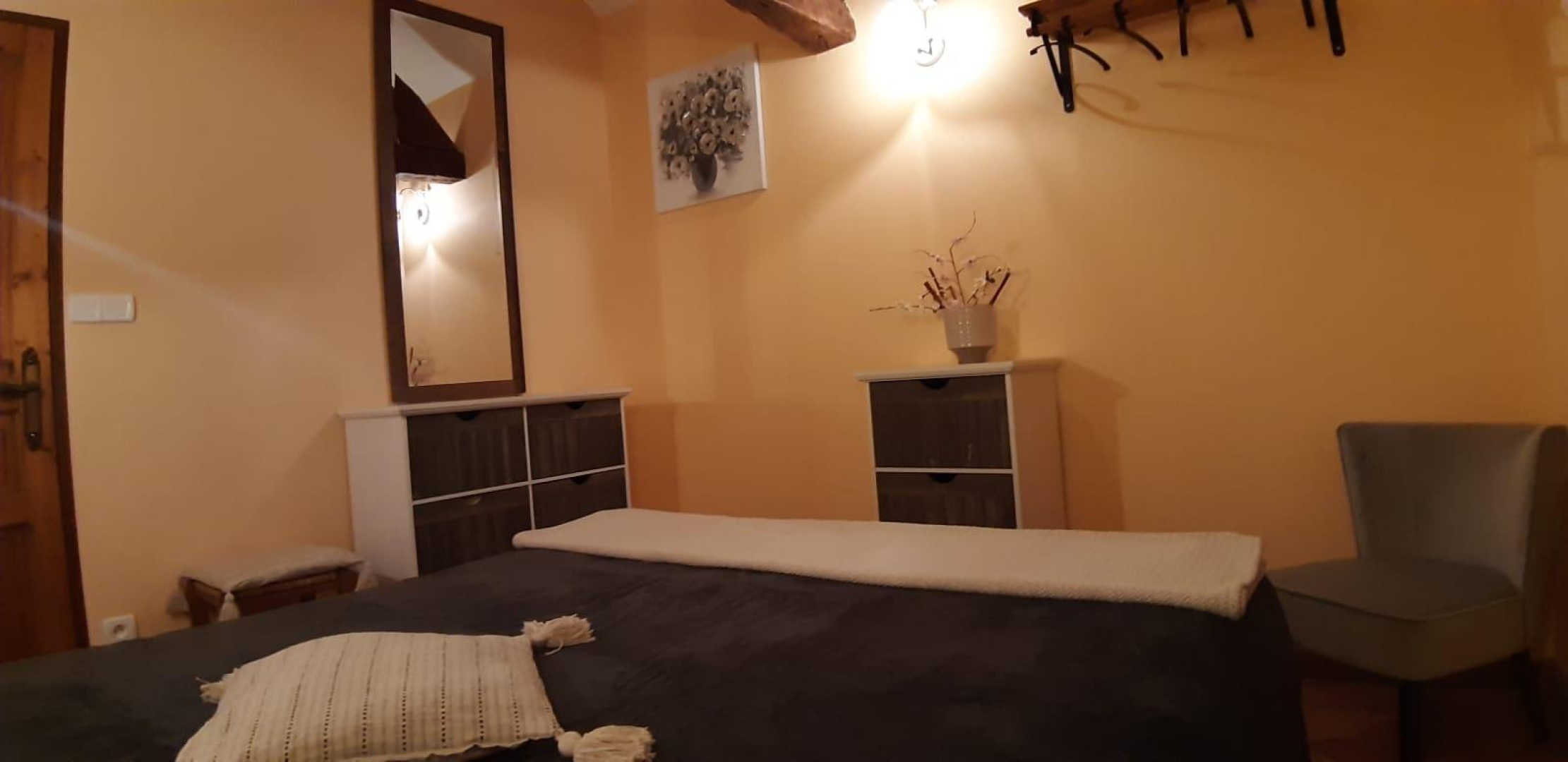 – Upstairs: two bedrooms with double bed 160x200cm and a third bedroom with two single beds 90x190cm. A bathroom with double sink and a large shower, a separate toilet.