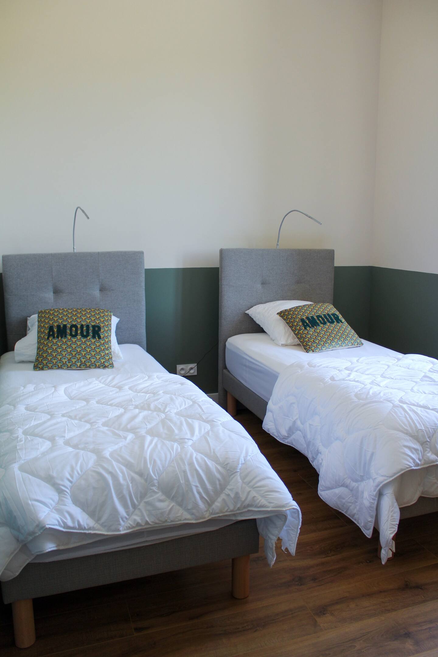 Chambre 2 : Une chambre avec deux lits de 90 cm jumelables, également dotée de sa propre salle d’eau et de WC.