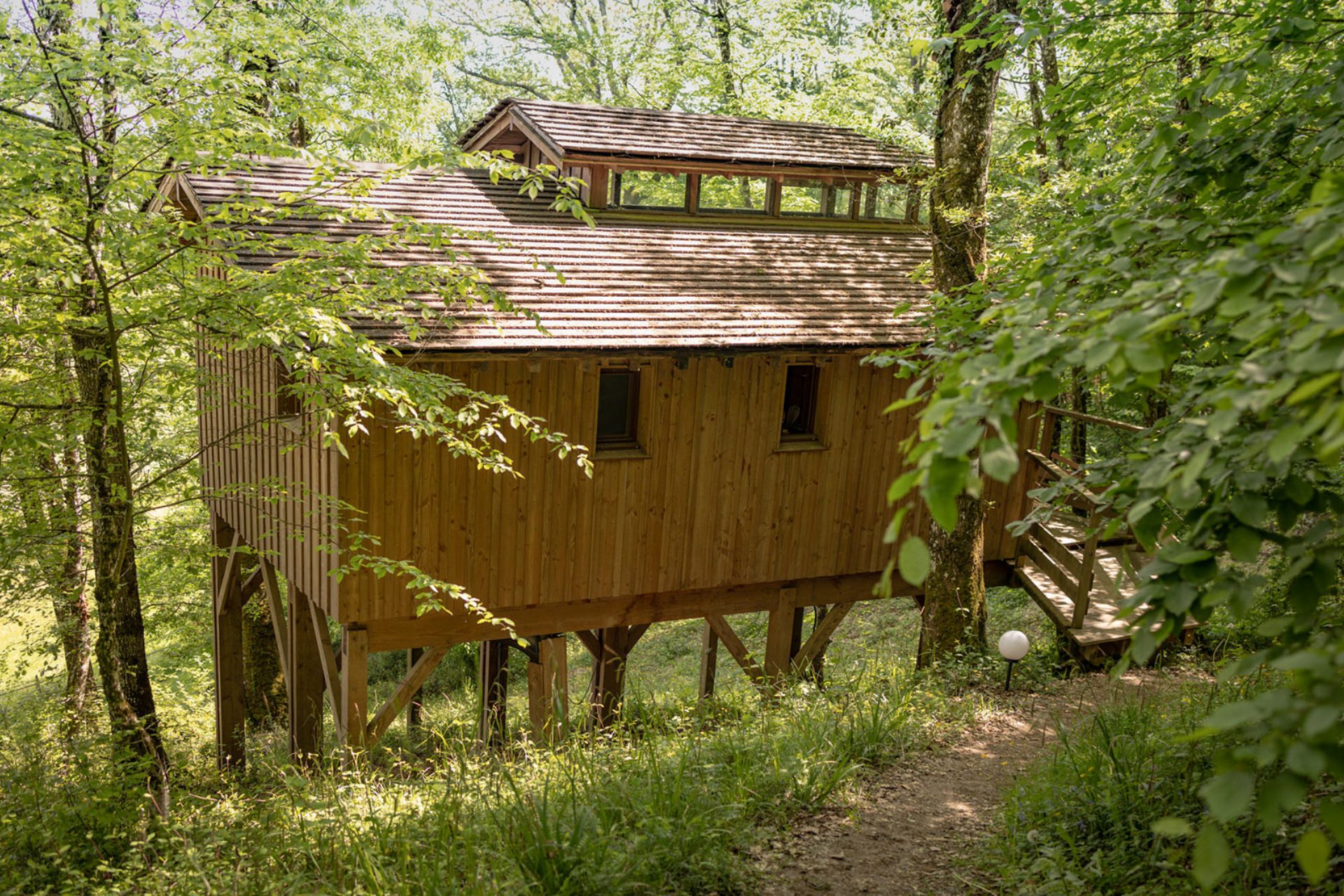 Les cabanes : Jusqu’à 6 personnes. Une cabane perchée avec jacuzzi privatif chauffé et grande terrasse. Retrouvez plusieurs espaces pour dormir, une cuisine équipée ainsi qu’un WC, une douche et une vasque. Lits faits et linge de toilette fourni.
