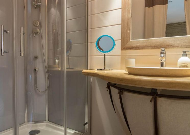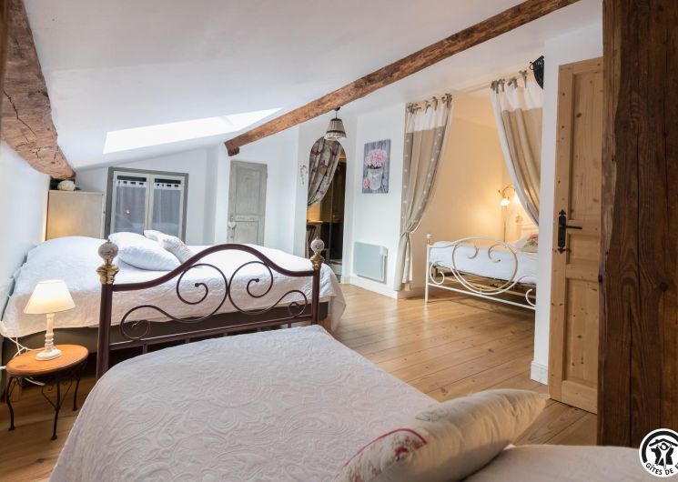 *- First floor: Bloom bedroom with mezzanine: 1 king-size bed 180×200+1 bed 140×190, private shower room/WC, Luna bedroom 1 king-size bed 180×200 +1 bed 140×190 + 1 bed 90×190, private shower room/WC. Chambre Stella 1 king-size bed 180×200, TV and private shower room/WC.