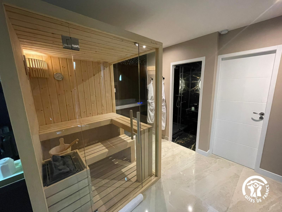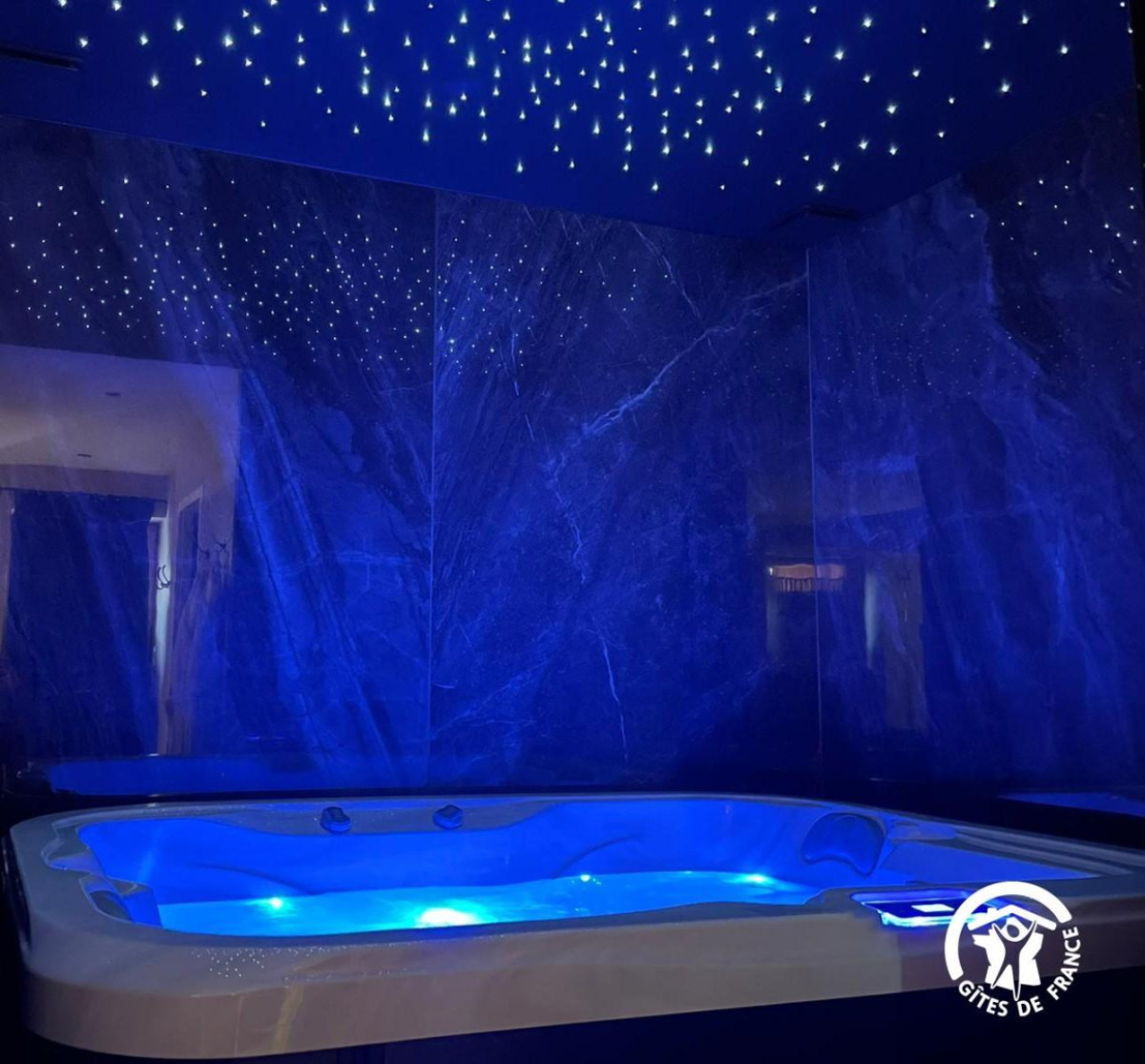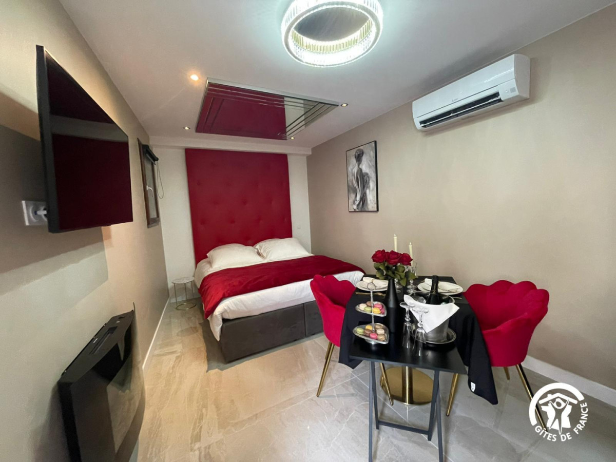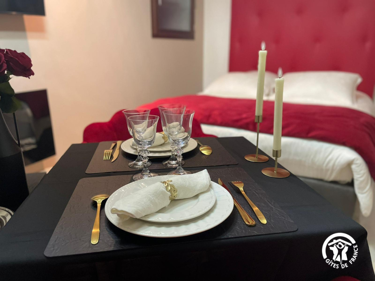 Possédant une entrée indépendante, cette chambre d’hôtes (entièrement climatisée) d’un genre particulier s’ouvre directement sur la coquette suite (l’hébergement ne possède qu’une suite et pas de pièces communes avec les propriétaires) et sur son sauna, créant ainsi une atmosphère intime et relaxante, parfaite pour une escapade amoureuse mémorable. La suite possède également un jacuzzi, parfait pour vous détendre en couple, dans une pièce séparée s’éclairant d’une teinte bleutée la nuit tombée. La suite se compose principalement d’un espace nuit, luxueusement décoré d’un rouge glamour, avec un grand lit pour deux personnes 180×200 surplombé d’un grand miroir qui s’éclaire au plafond, d’une table basse pour prendre confortablement votre petit-déjeuner à deux, d’une télévision connectée (l’hébergement possède le Wifi), et d’un espace cuisine avec four, réfrigérateur, machine à café et bouilloire. Le petit-déjeuner, composé de viennoiseries, de fruits ou encore de yaourts, est servi par vos hôtes au travers d’un passe-plat, afin de garantir votre intimité à deux lors de votre séjour au sein d’Elégance et Spa. Une bouteille de champagne est également offerte avec le petit-déjeuner. L’hébergement dispose aussi d’une salle d’eau avec vasque design et douche moderne, et d’un WC indépendant. Attractions touristiques : Montblanc, est une charmante commune offrant diverses activités touristiques pour un couple en séjour, que ce soit au cœur du village ou dans ses alentours. Venez explorer le patrimoine local en visitant le château de Montblanc et profitez d’une promenade romantique à travers les vieux murs chargés d’histoire, ou bien découvrez le charme du vieux village en vous promenant dans ses ruelles pittoresques, sans oublier de découvrir ses petites boutiques artisanales ou les marchés locaux qui vous permettront de déguster de savoureuses spécialités régionales. Vous pourrez également profiter au fil de l’eau, sur le littoral méditerranéen en vous rendant s – Suite, douche, WC, 1 chambre