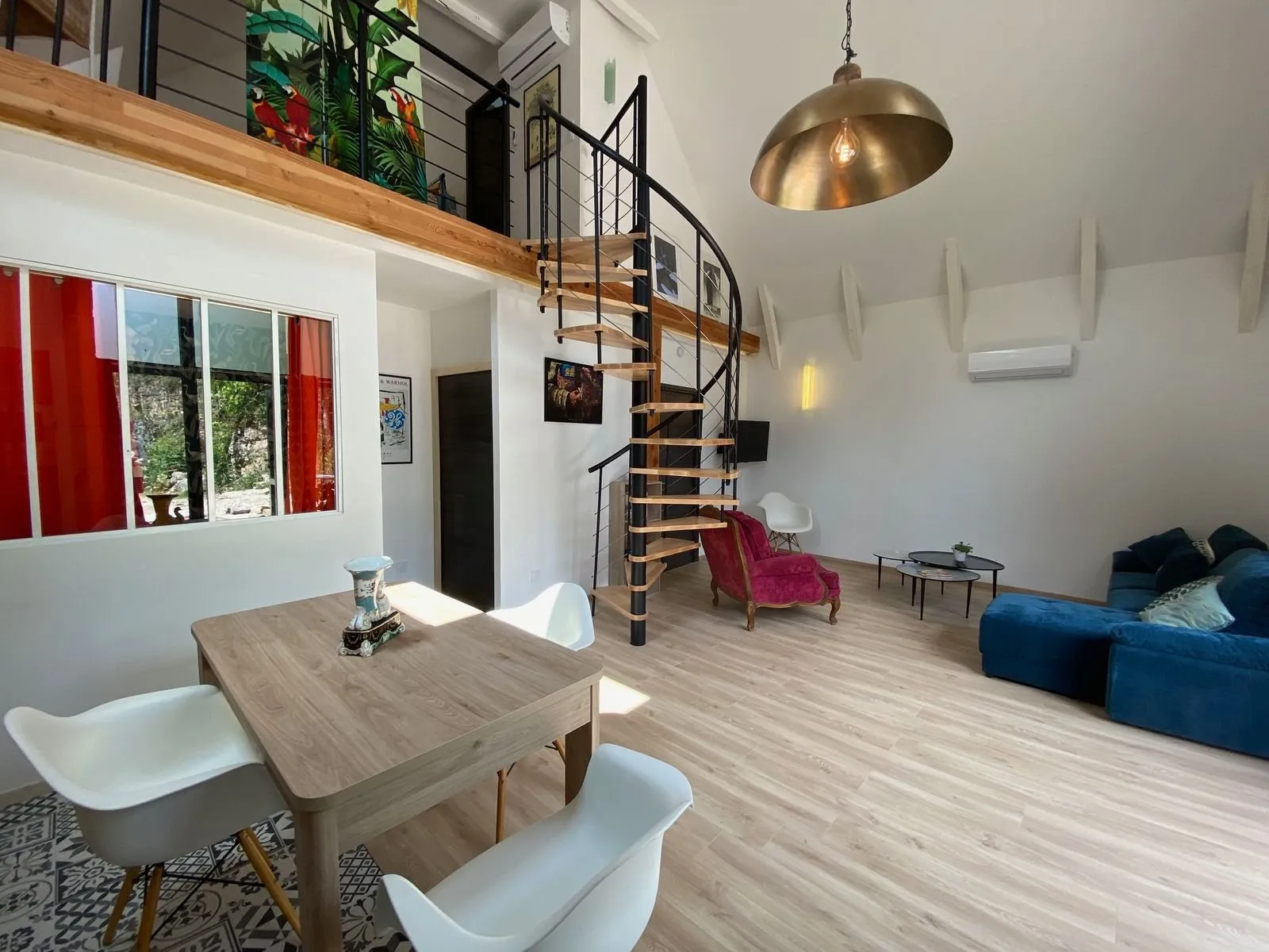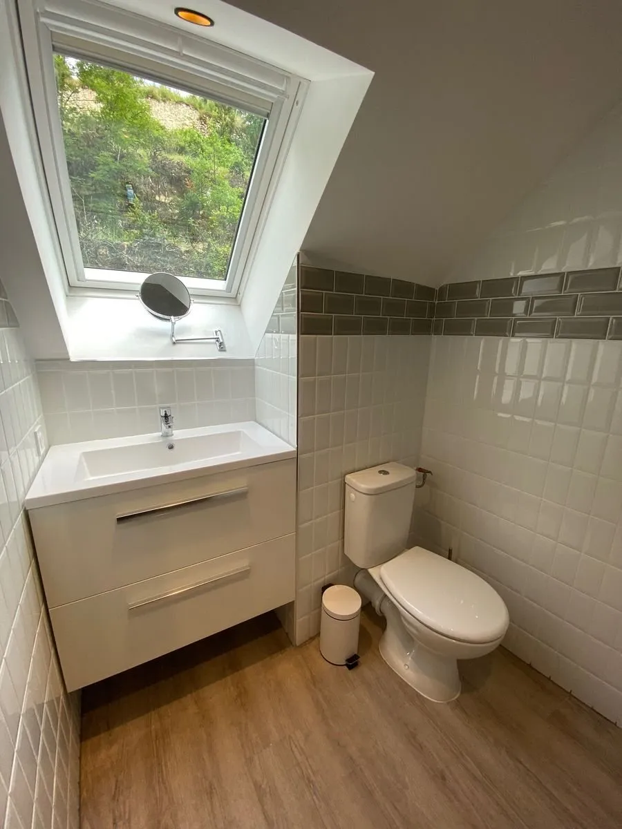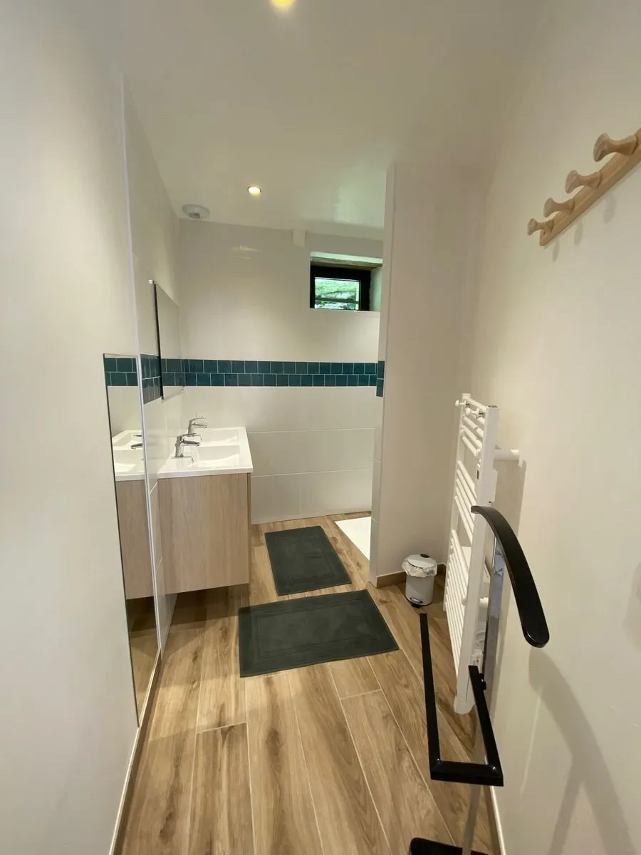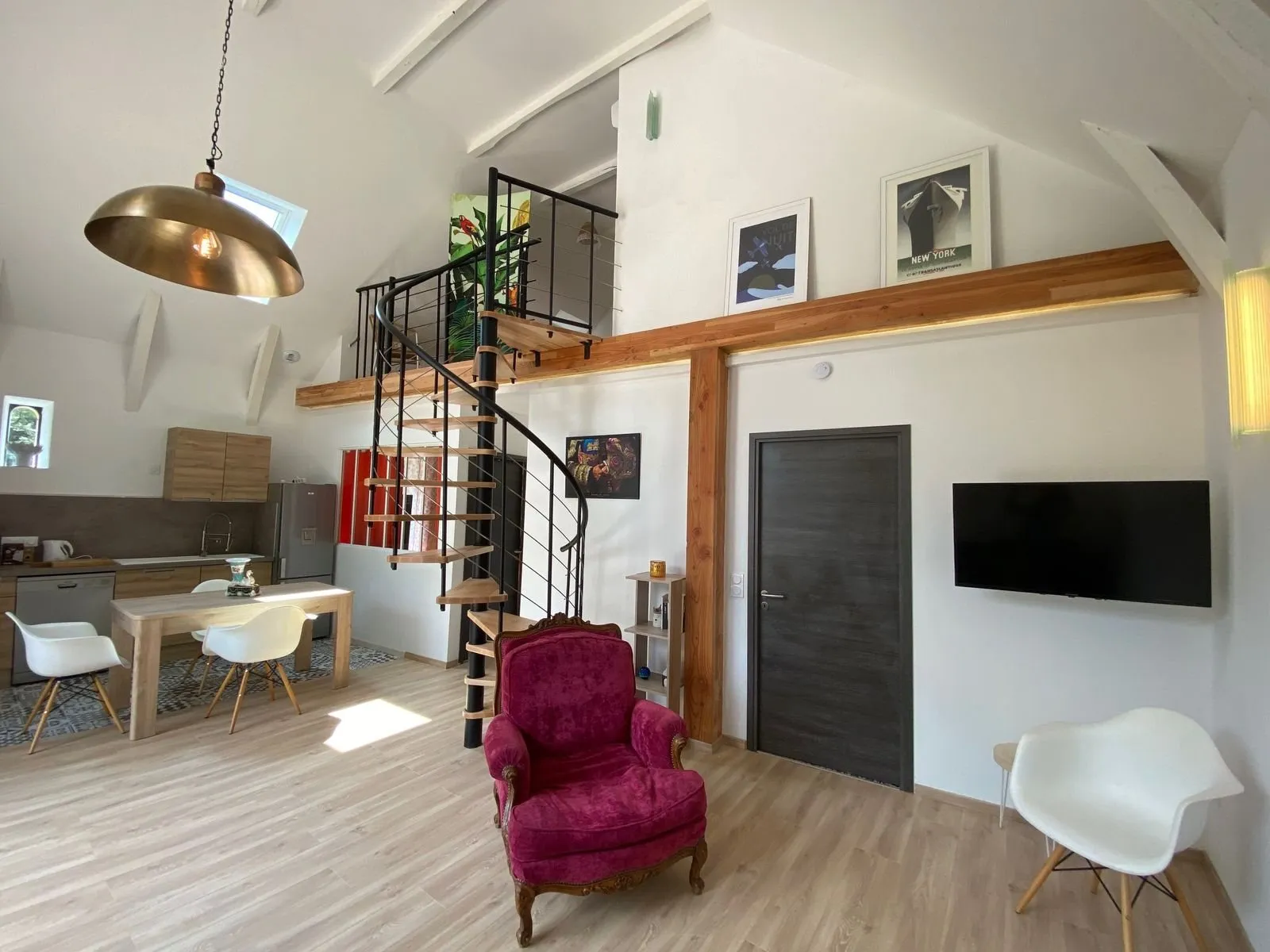 1 chambre (1 lit 140), mezzanine/chambre accessible par un escalier en colimaçon (1 lit 160), 2 salles d’eau/WC privés à chaque chambre, coin-cuisine (lave-vaisselle)/séjour (canapé, télévision, accès internet/wifi)).