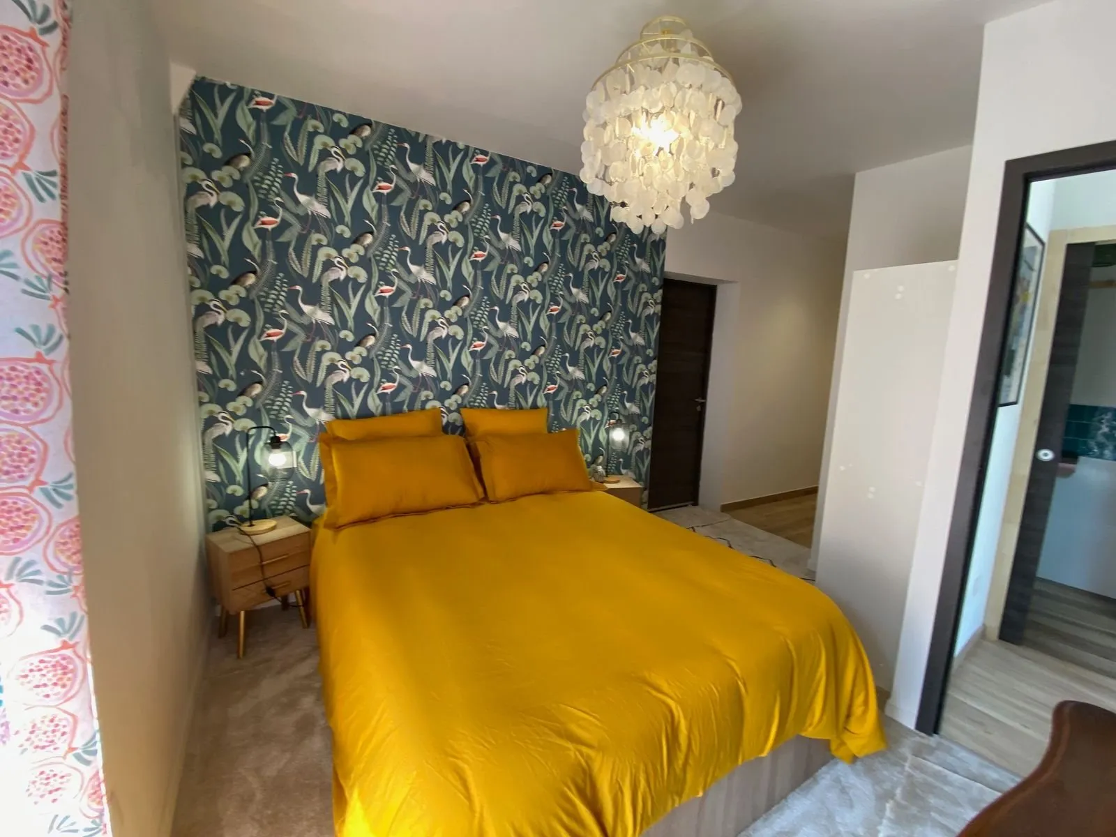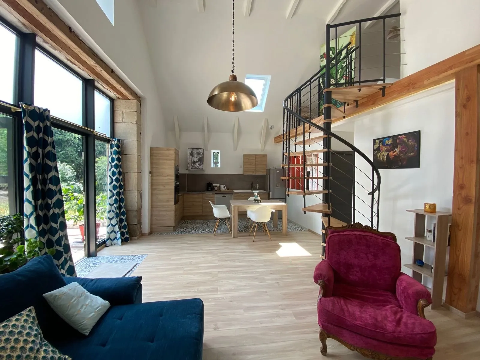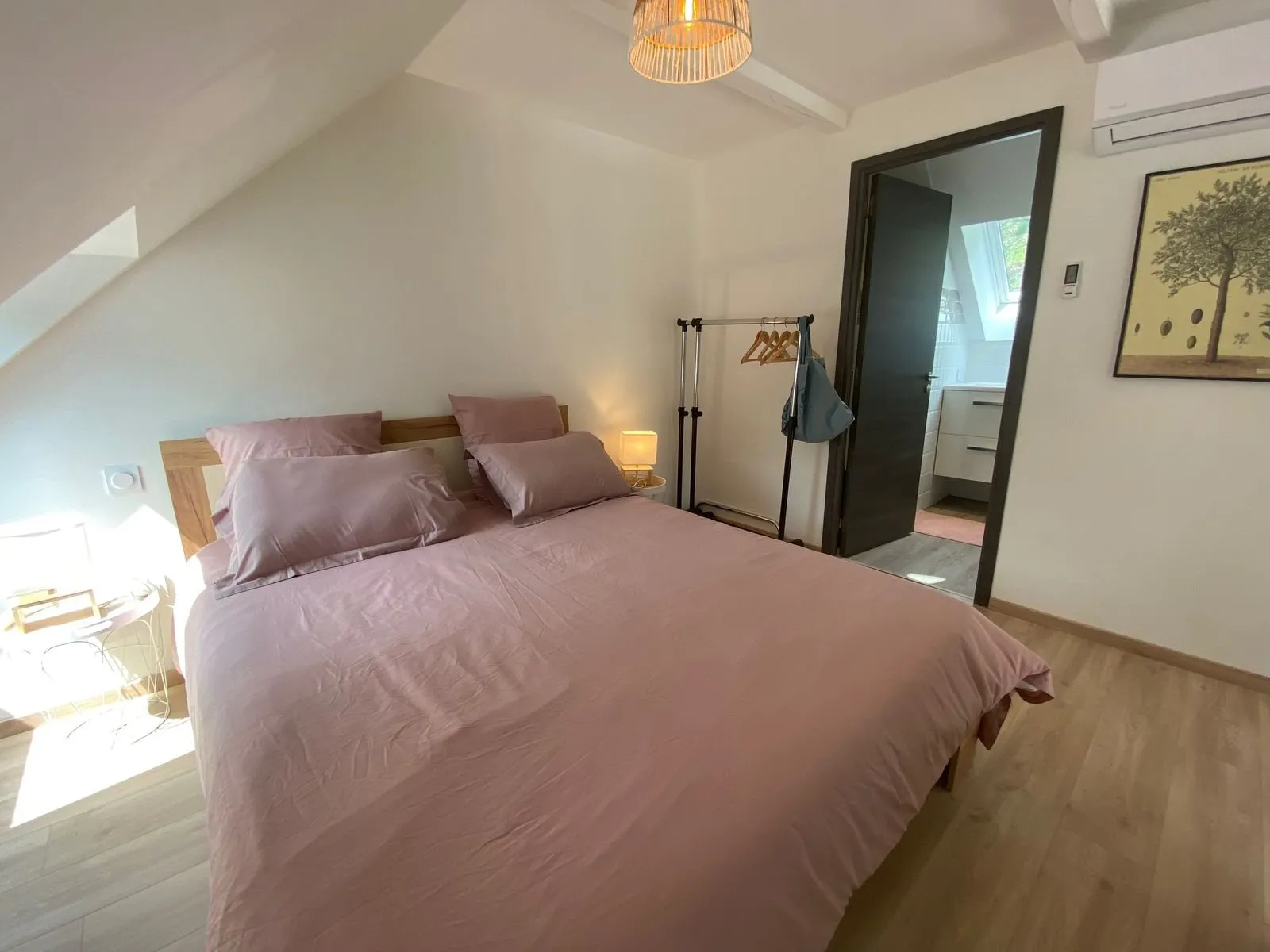 1 chambre (1 lit 140), mezzanine/chambre accessible par un escalier en colimaçon (1 lit 160), 2 salles d’eau/WC privés à chaque chambre, coin-cuisine (lave-vaisselle)/séjour (canapé, télévision, accès internet/wifi)).