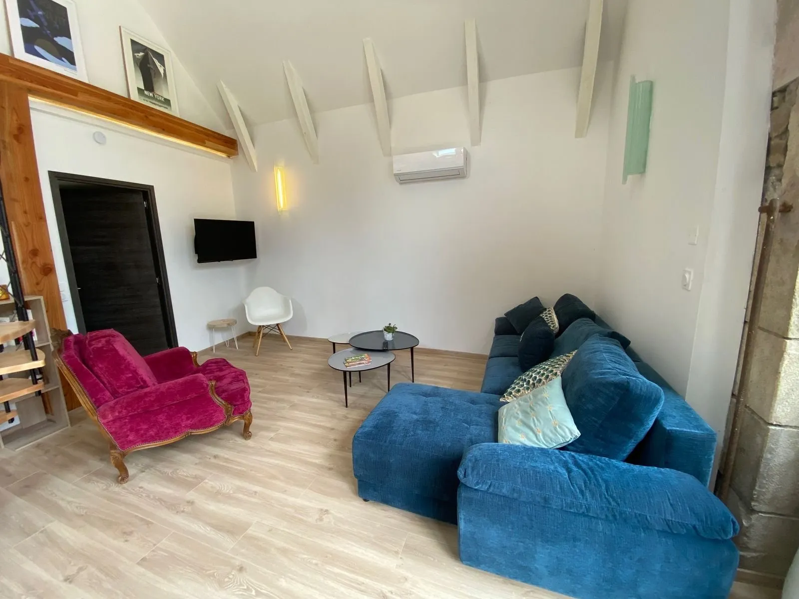 Gîte aménagé dans une grange, mitoyen avec 2 autres gîtes, entrées indépendantes et opposées, à proximité de la maison des propriétaires, en bordure d’un bourg.